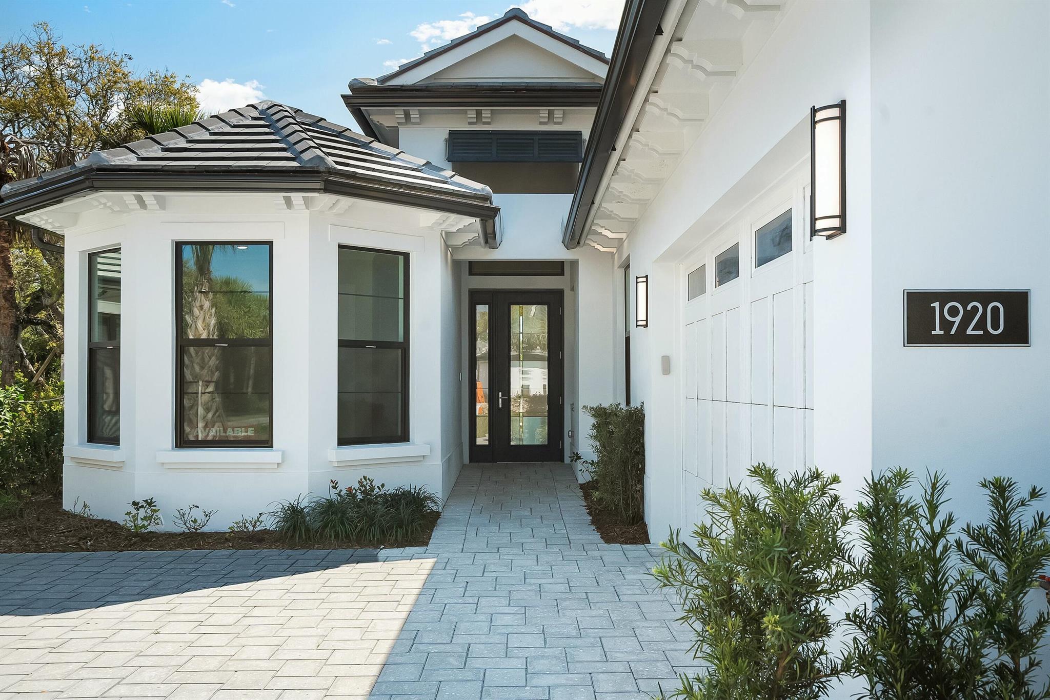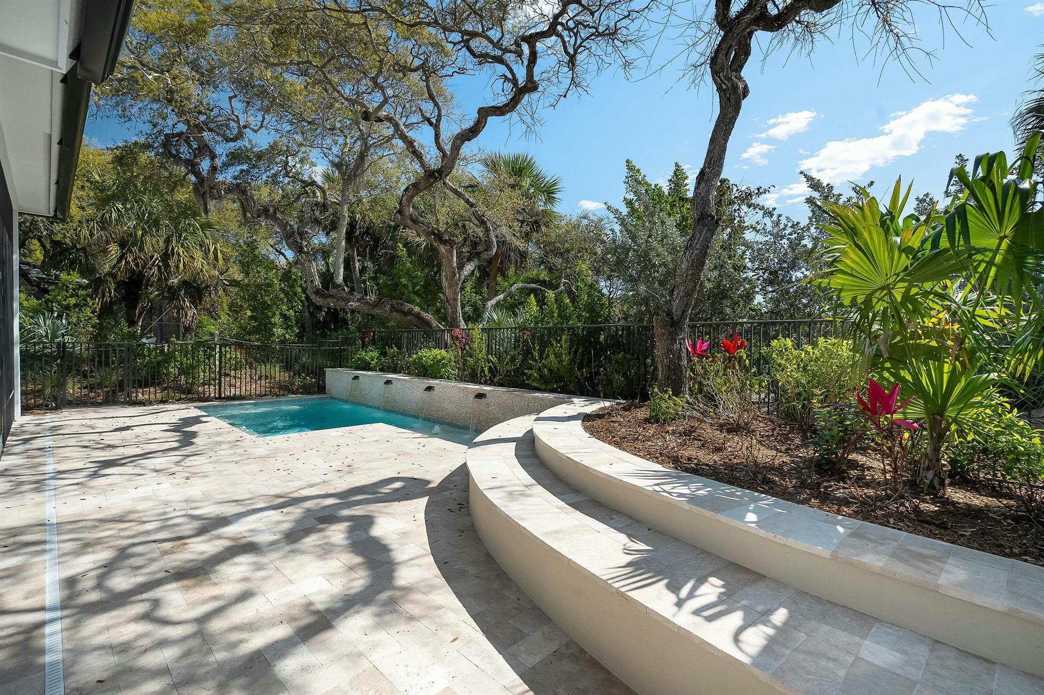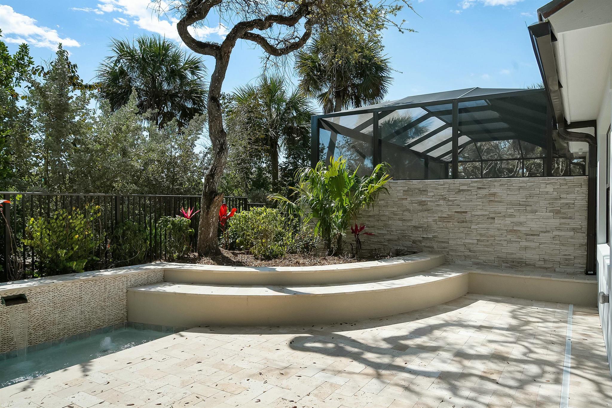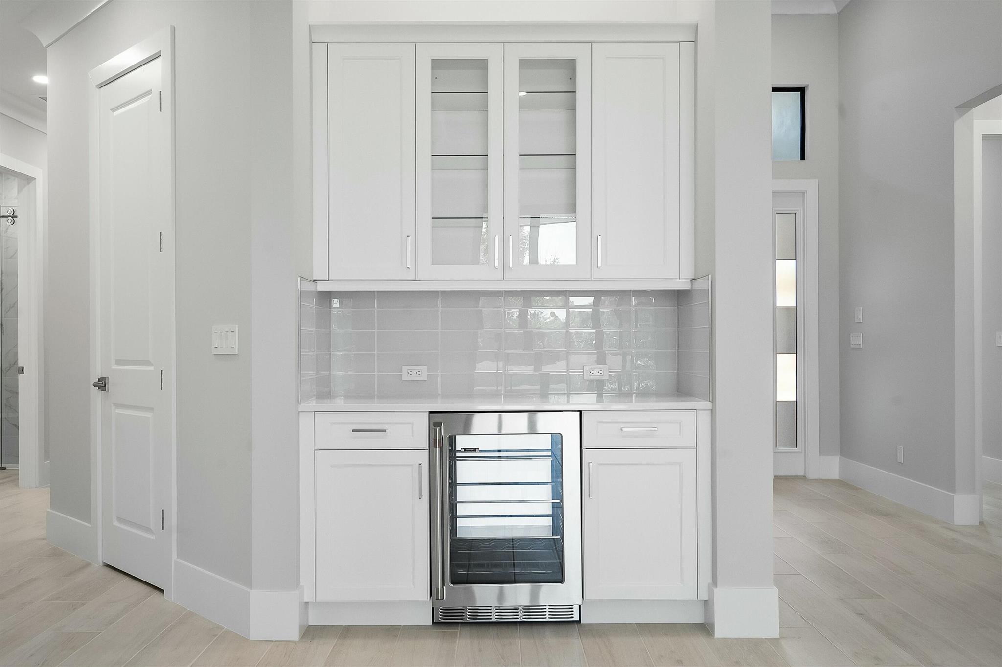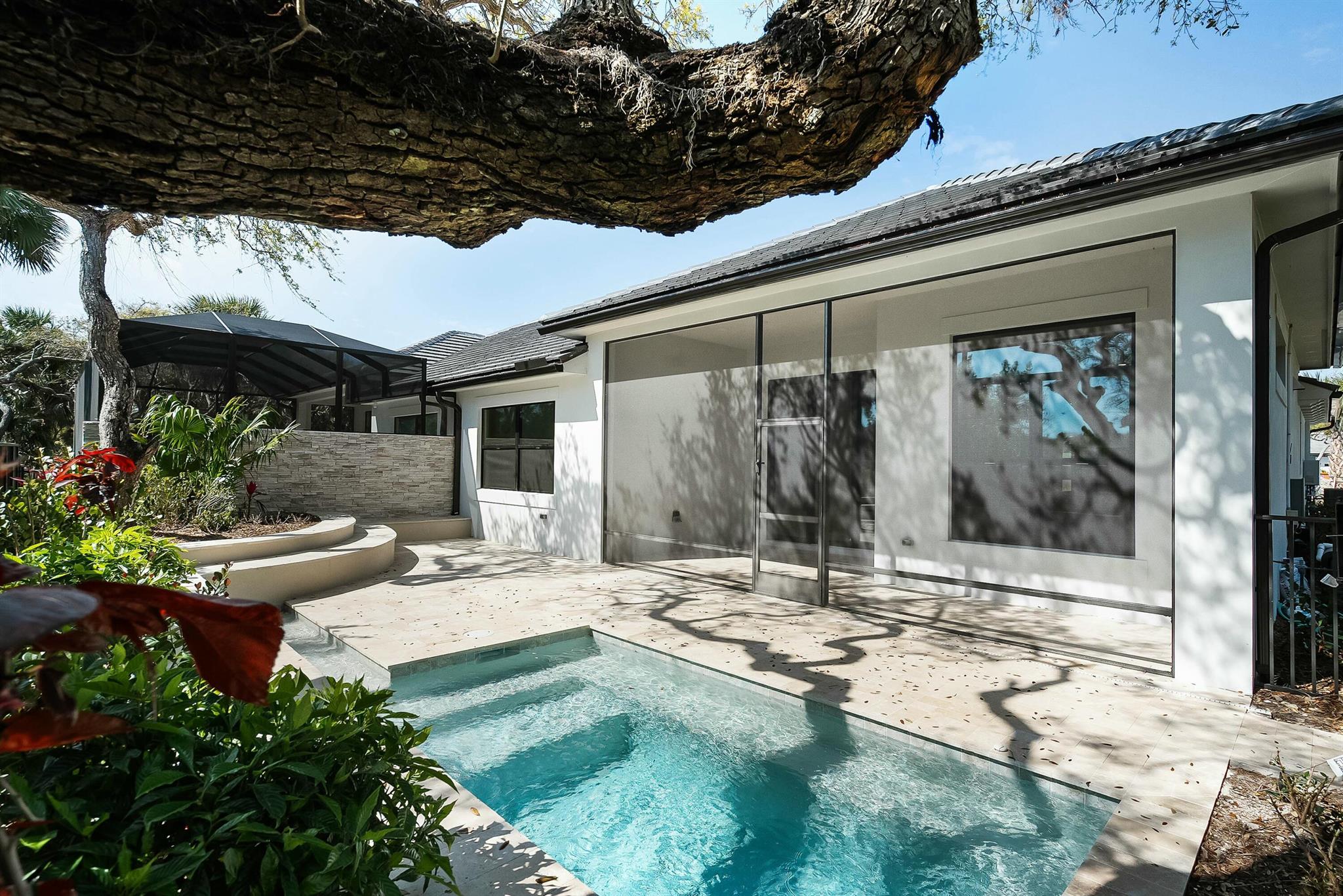 The Seabreeze Grande, a 4-bedroom, 3-bath villa with over 2366 finished square feet, offering the ultimate in-island living. Nestled in a charming Florida setting surrounded by lush landscaping, this home boasts an exquisite pool including 3-24'' sheer descent waterfalls and a built-in wrap-around bench surrounded by lush landscaping, perfect for embracing the carefree island lifestyle. The covered patio is screened in with rail fencing around the pool area. And a retractable screen on patio. Exceptional finishes include solid core interior doors, Arhus Classic Blanco wood-look tile flooring, volume ceilings, bay window in bedroom 2, quartz countertops, under-cabinet lighting, high-end Cafe appliances, Bar area with a beverage refrigerator. With the added option of a 4th bedroom or den