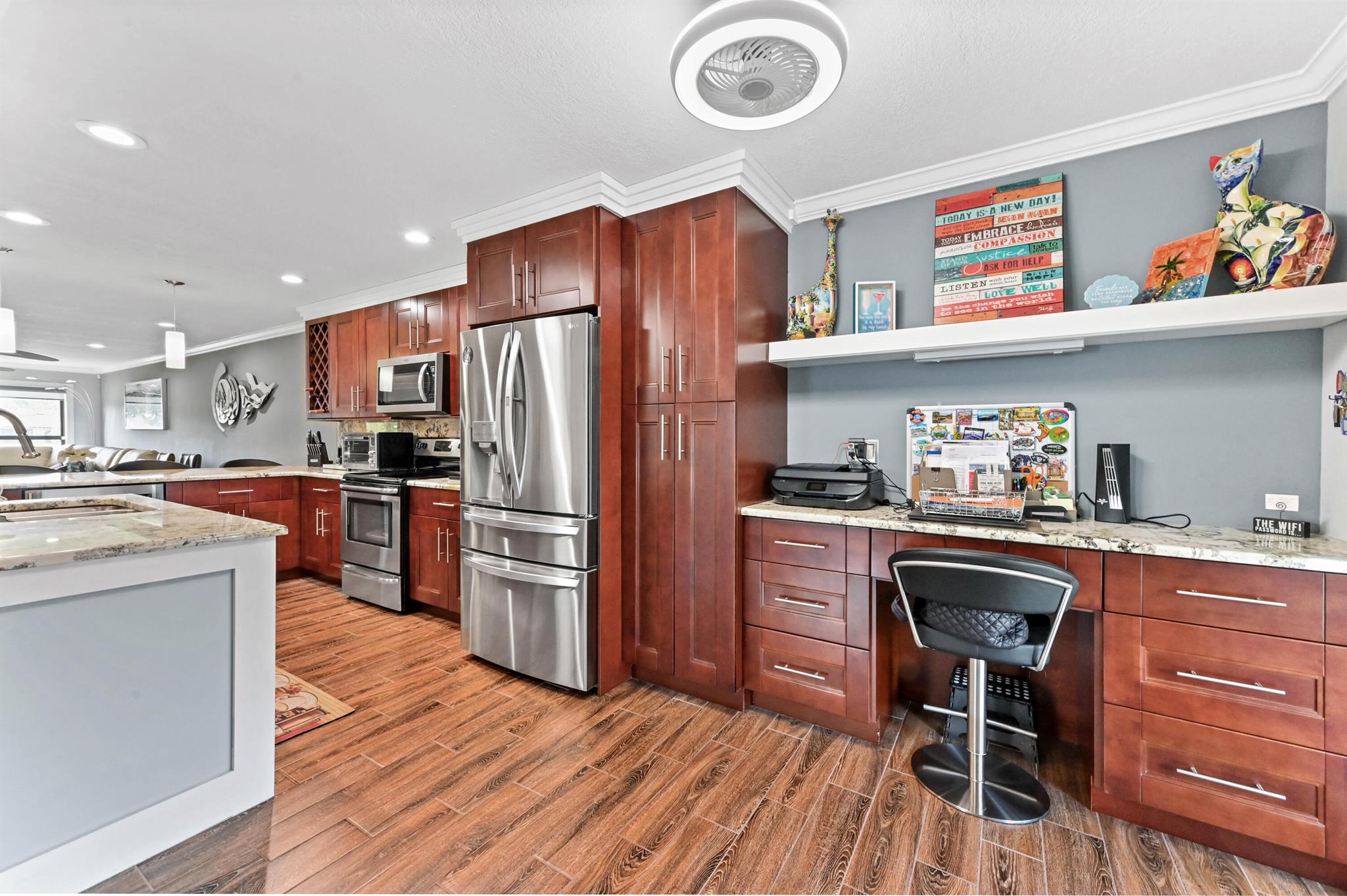 Stunning 2/2 Corner Villa. Fully Updated & Move-In Ready!Welcome to this meticulously updated 2-bedroom, 2-bathroom corner villa in the highly desirable community of Palm Greens. Every detail has been carefully considered, ensuring no stone was left unturned in creating a modern and luxurious living space.Enjoy breathtaking, expansive views of tranquil waters and scenic walking trails right from your private sanctuary. The villa is equipped with new hurricane-impact windows and doors for added peace of mind.Step inside the open-concept kitchen that's perfect for both entertaining and everyday living. Featuring sleek stainless steel appliances, an abundance of counter space, real wood cabinets, a pantry, a built in desk and even a wine fridge!
