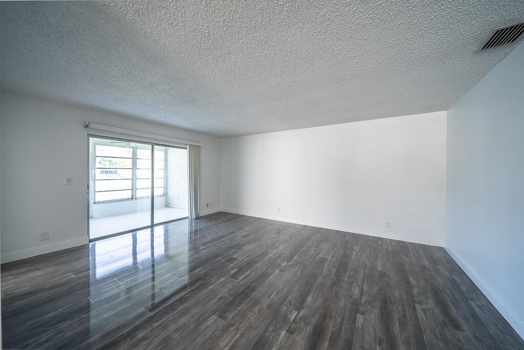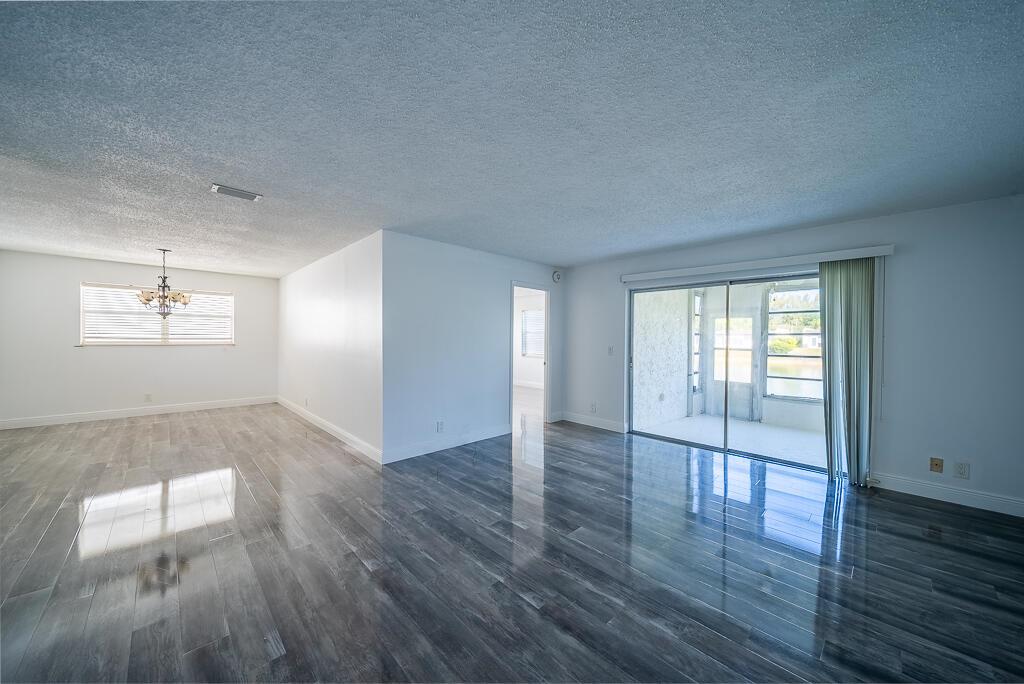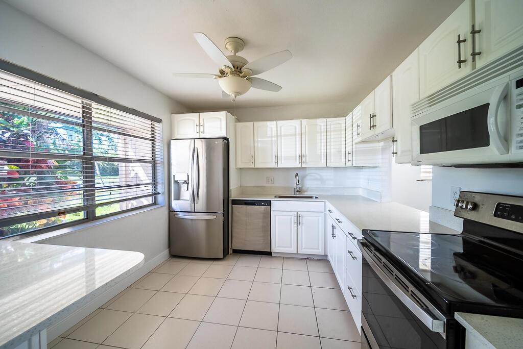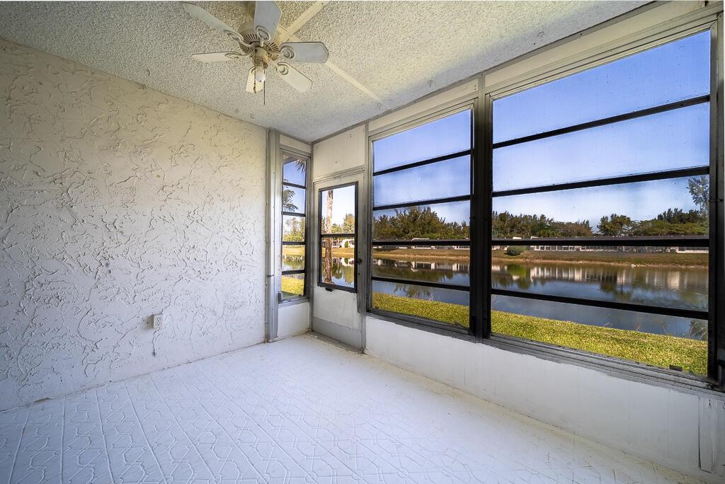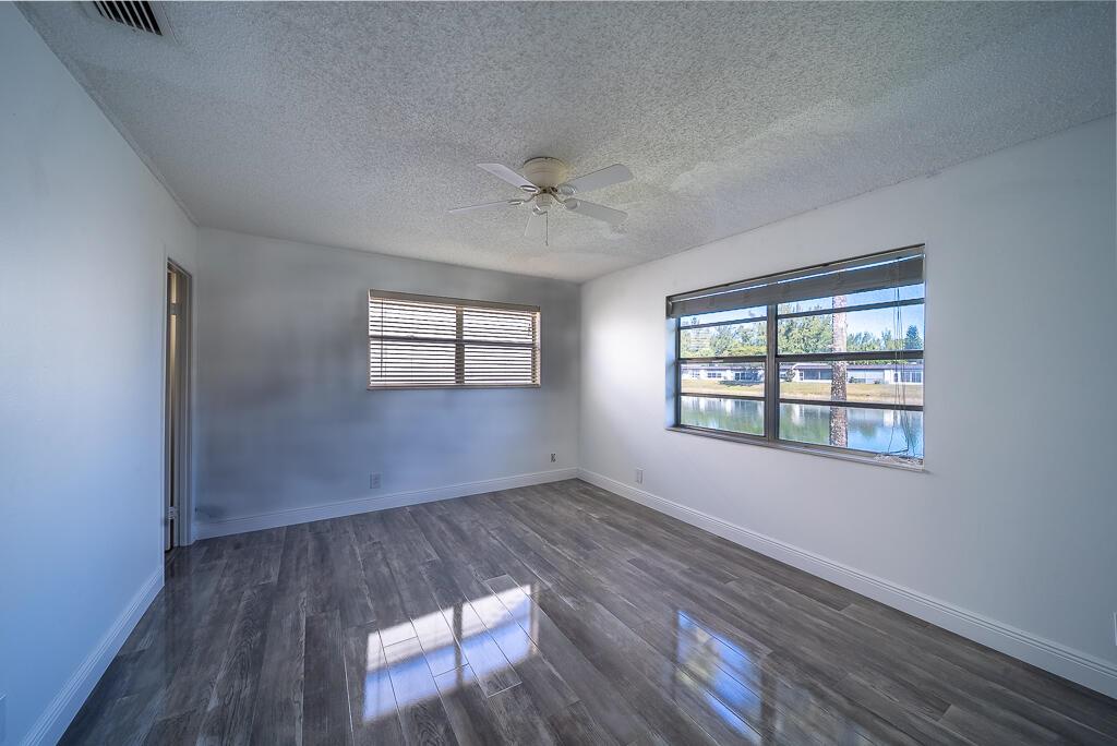 ** 55+ Community - Charming 2-bedroom, 2-bath LAKESIDED, CORNER unit in highly desired Golden Lakes, featuring a 24/7 manned guard gate! The lovely grounds lead to a covered porch and into a spacious foyer. The home is freshly painted and the A/C is only 2 years old. The spacious kitchen offers newer stainless steel appliances and brand new granite countertops. Beautiful new floors flow throughout. The extra-large living room offers flexibility for a combined living-dining setup and offers access to the enclosed patio, overlooking the lake. In the master bedroom, notice the huge walk in closet and ensuite with a shower/tub combo. Other highlights include a utility closet with a washer/dryer, and a second full bath with step in shower.