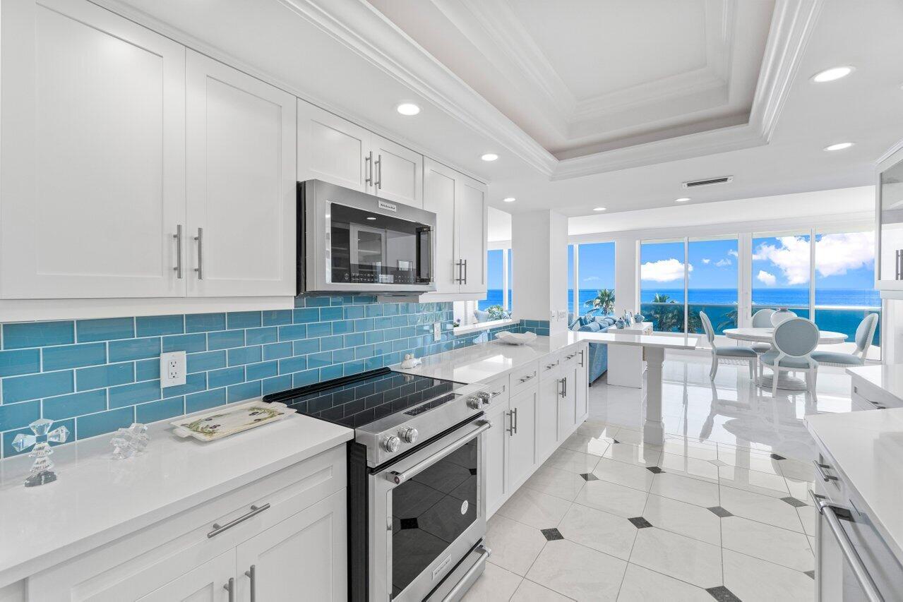 RARE OPPORTUNITY! Experience one of the finest, unobstructed ocean views in Boca Raton's premier oceanfront buildings. This exceptional unit boasts DIRECT EAST panoramic vistas, featuring 26 feet of brand-new hurricane-impact windows and sliding doors in the living room, plus wall-to-wall windows in the bedroom--all framing breathtaking due East sunrises over the Atlantic. A large glass-railed balcony enhances the seamless indoor-outdoor feel. Light and bright, this residence feels as if it's floating above the waves, bathed in golden morning light. The 8'7'' ceilings and well-proportioned rooms create a spacious ambiance. The kitchen has been completely updated with brand-new refaced cabinets, quartz countertops, ample workspace, all-new stainless steel appliances, and a new washer/dryer.