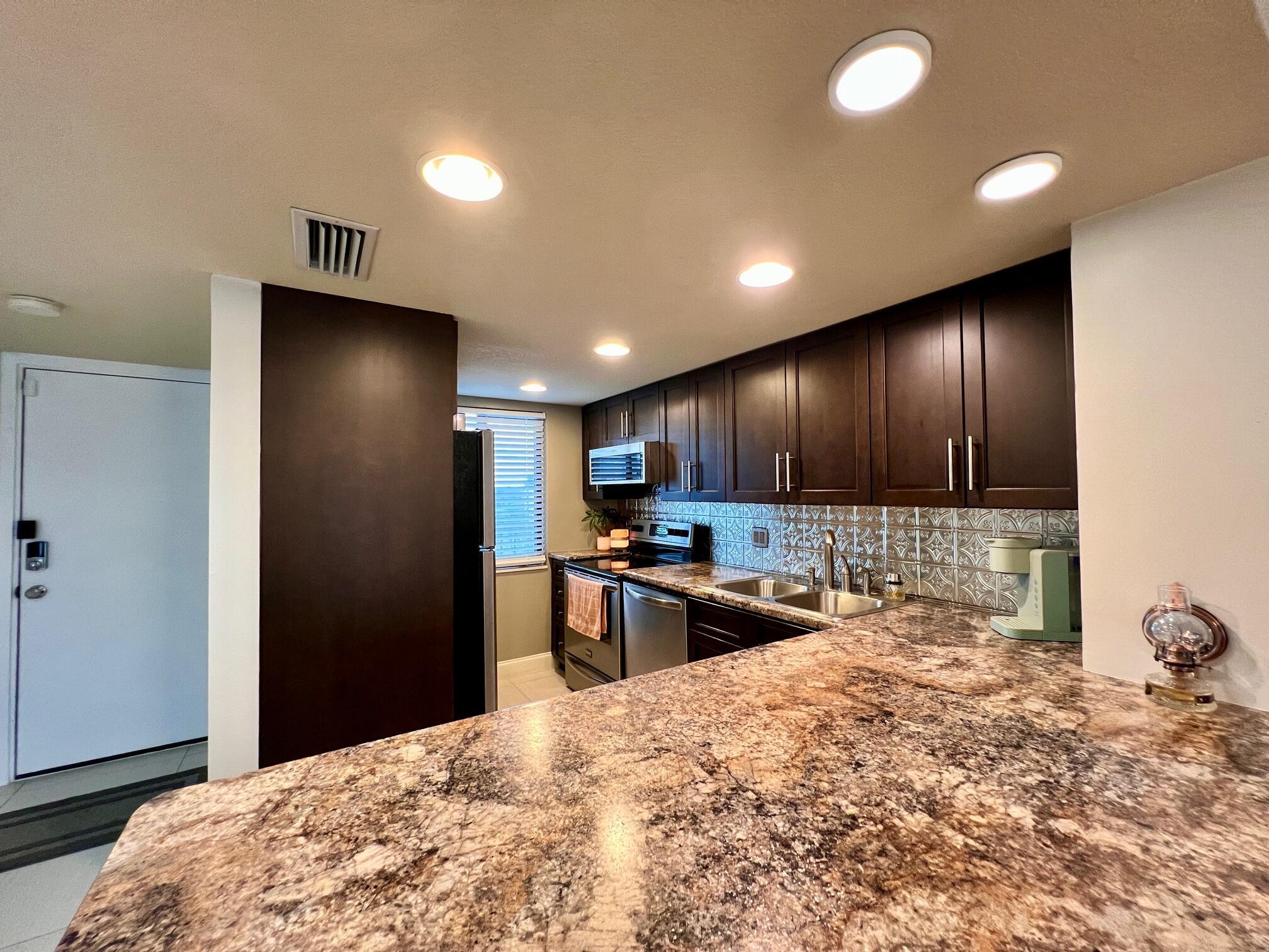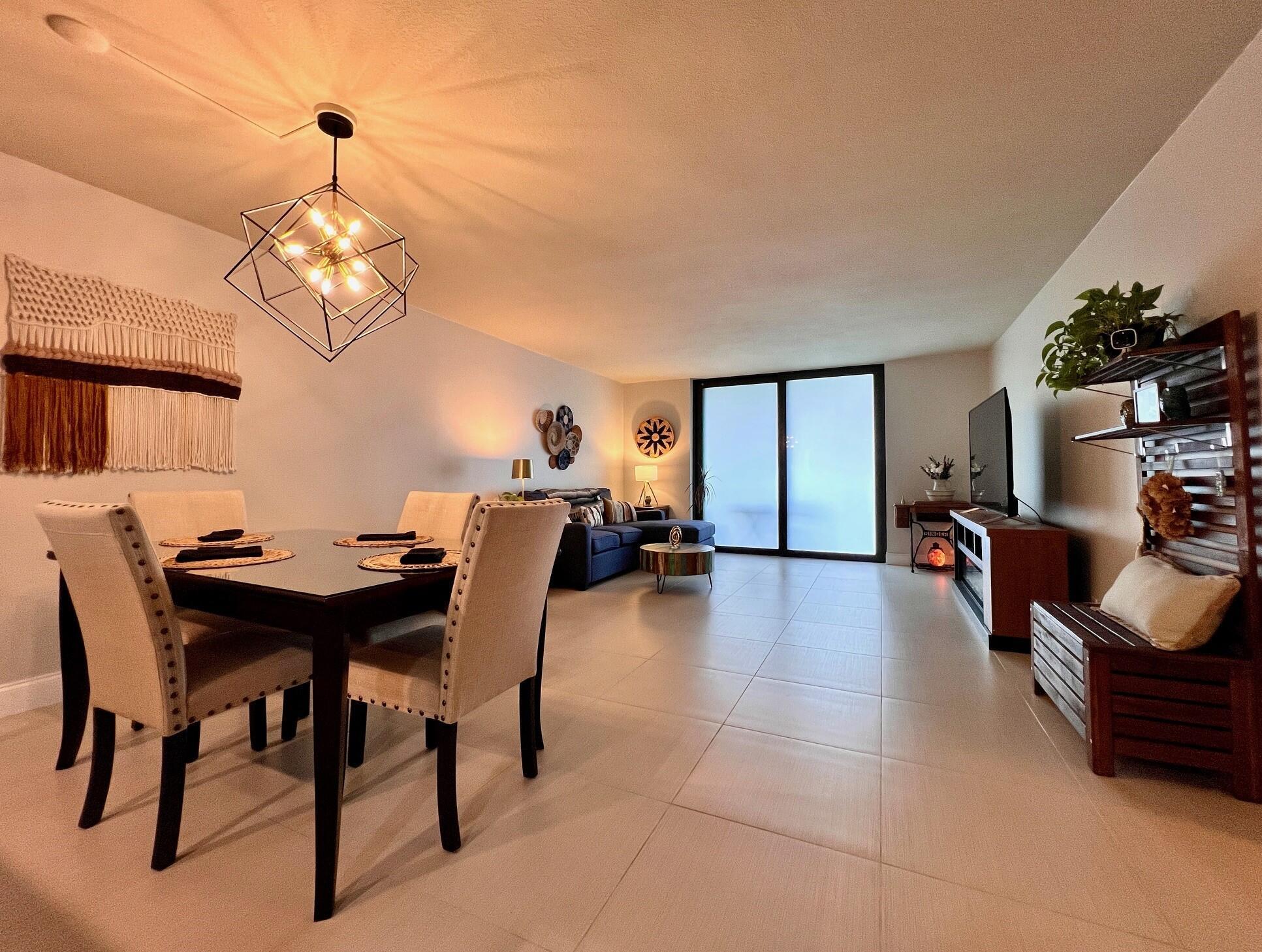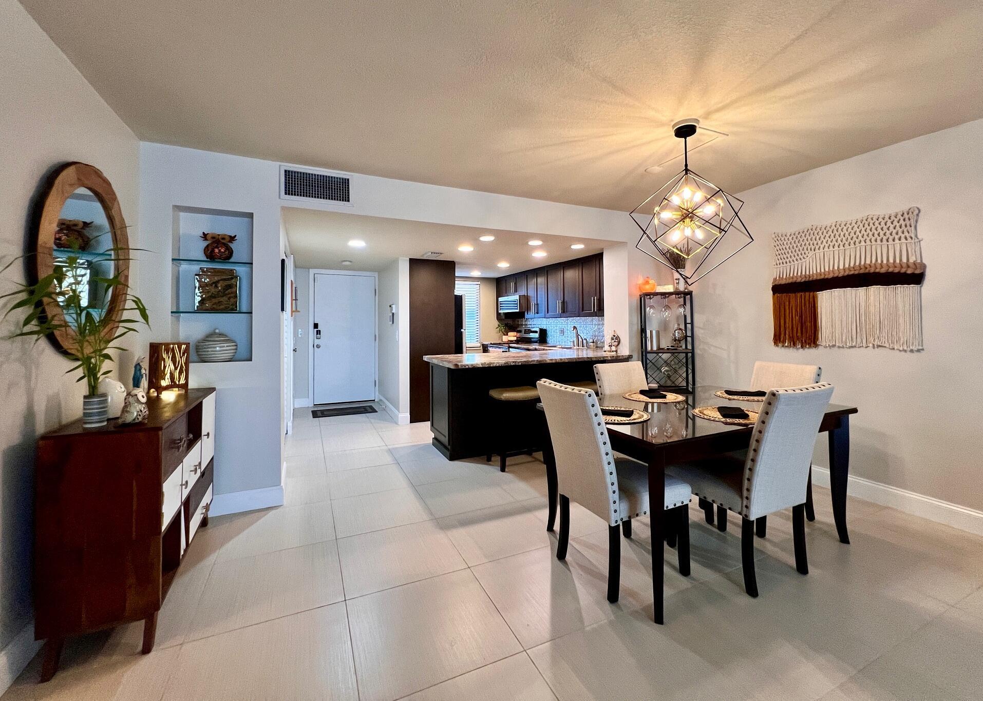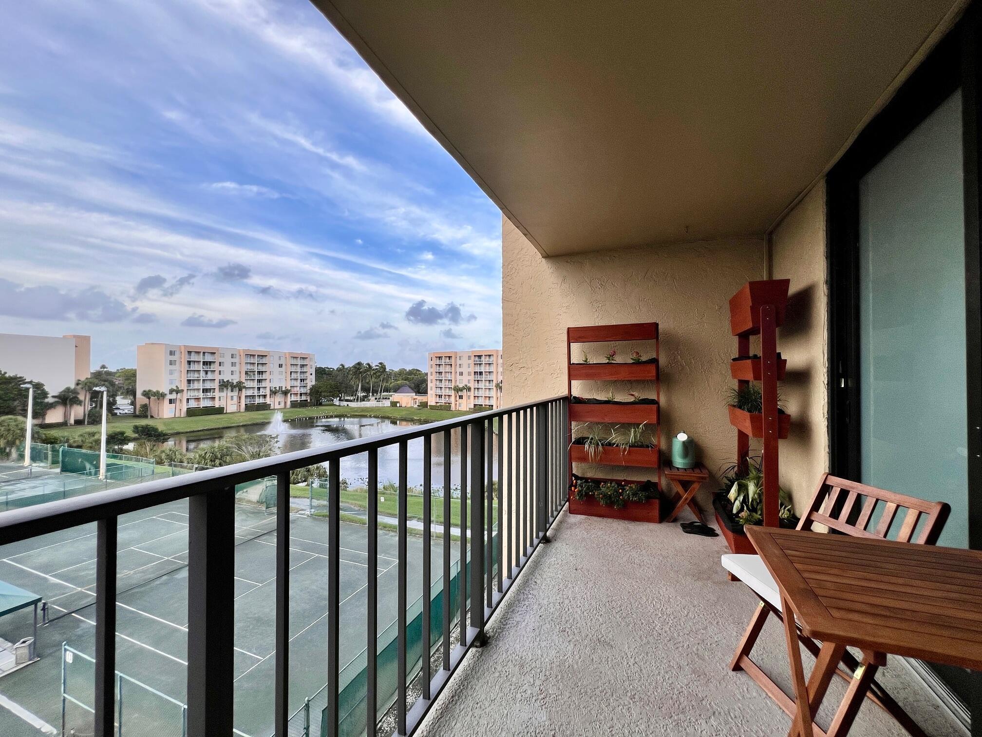 Gorgeous & Spacious Updated Penthouse Condo With Lake Views! Gracious 2/2 Floor Plan. Stylish Updated & Open Kitchen Featuring Shaker Style Cabinets, Designer Decorative Backsplash, High Hat & Pendant Lighting, Large Breakfast Bar, and Newer Stainless Appliances Including a Stacked Washer & Dryer! Two Updated Full Baths. Large Bedroom Suite W/Updated Full Ensuite Bath. Balcony Offers Outdoor Space Lake & Tennis Court Views. Large Format Neutral Tile Flooring Throughout. Knock Down Ceilings (no popcorn!). Impact Windows, Including the Slider W/ Privacy Frost, Completed in 2022. Nicely Maintained W/ New Water Heater (2022) & Electrical Panel (2023). Dining Table & Chairs, Two Bar Stools, Couch, Patio Table, Chairs, Herb Garden Included. A Well-Priced Gorgeous Place to Call Home