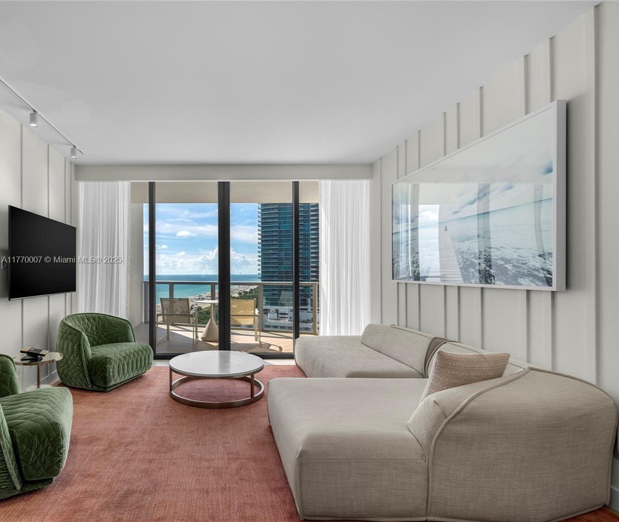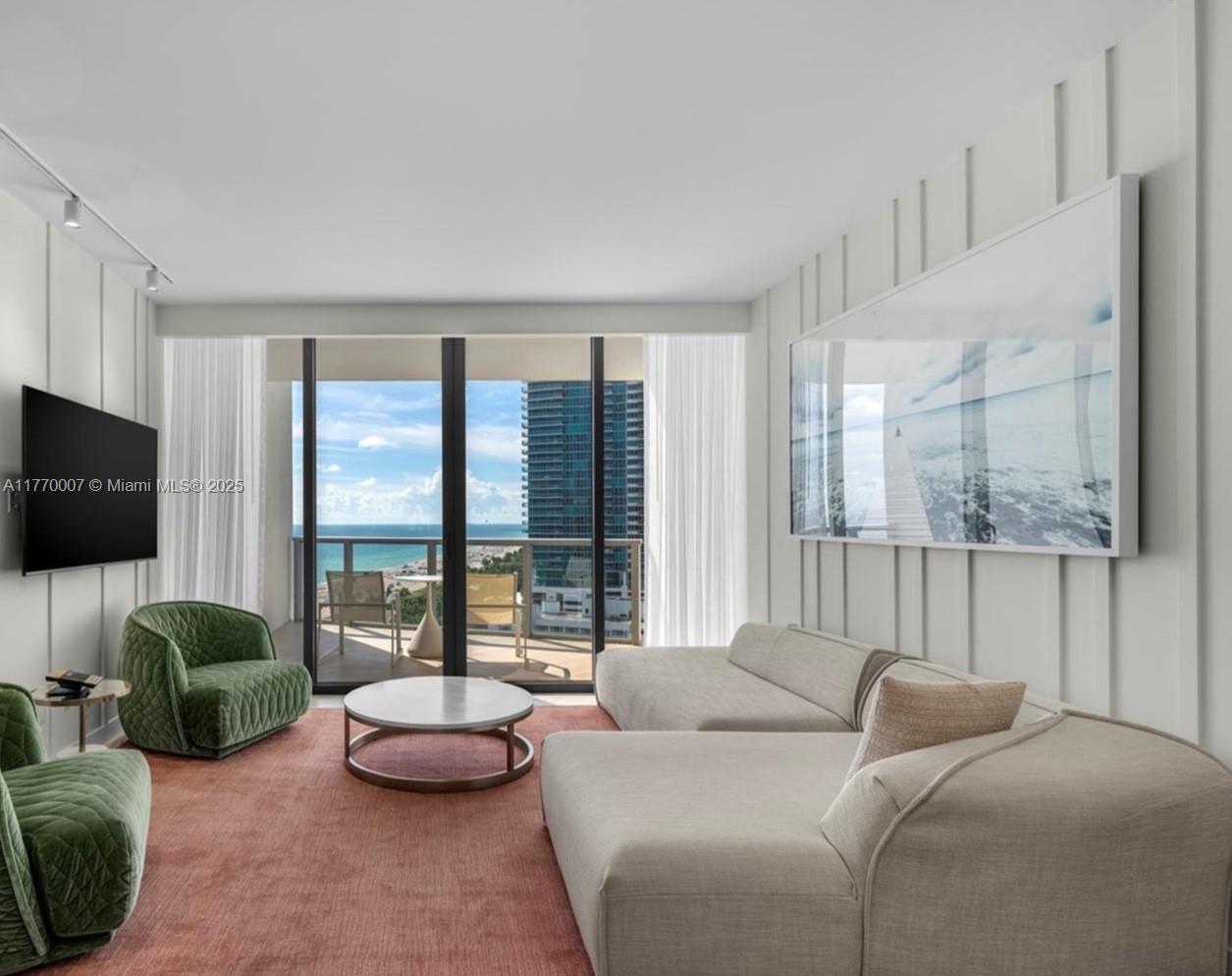 Discover the ultimate in luxury beach living with this expansive two-bedroom unit at The W in South Beach, a rare find on the market. This elegant 2-bedroom, 2-bathroom residence spans 1,543 square feet and includes a private den/media room. Enjoy breathtaking beach and ocean views from three distinct terraces. The unit features an open-concept living and dining area, complemented by a kitchen equipped with high-end Wolf and Sub-Zero appliances, granite countertops, and Italian cabinetry. The principal suite offers a private terrace with stunning views, wood flooring, a walk-in closet, and a chic bathroom complete with a sunken tub, dual sinks, and a glass/marble shower. Continues in Supplemental Remarks
