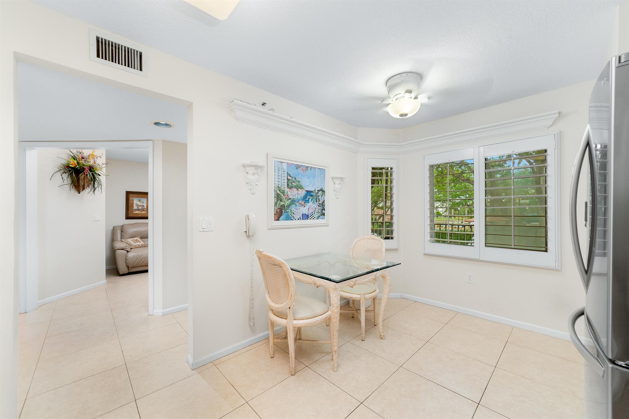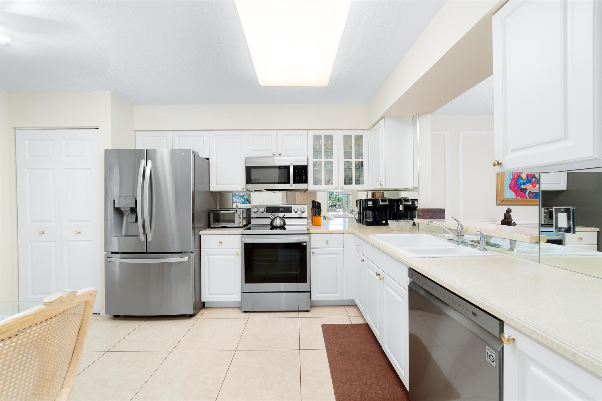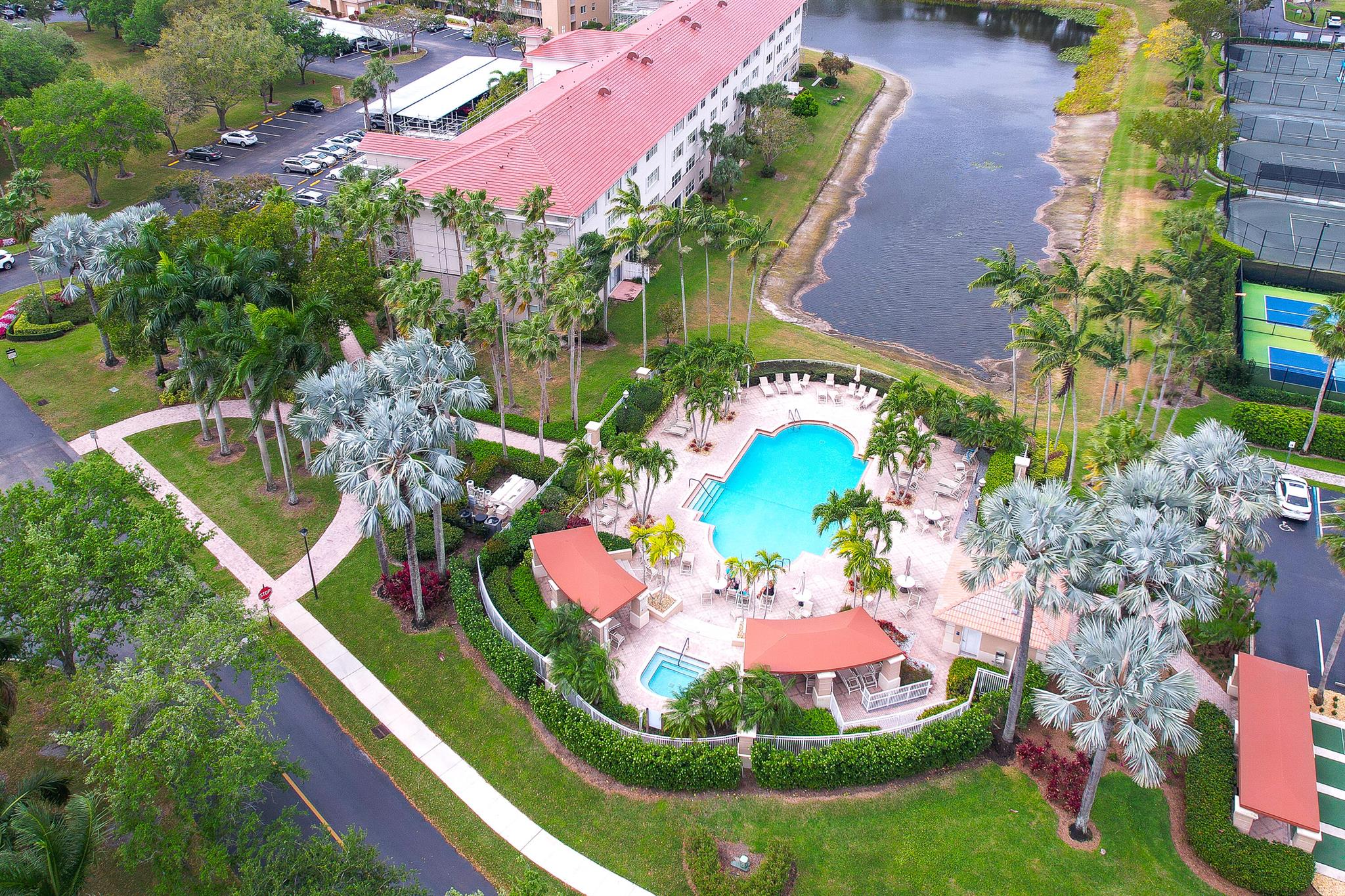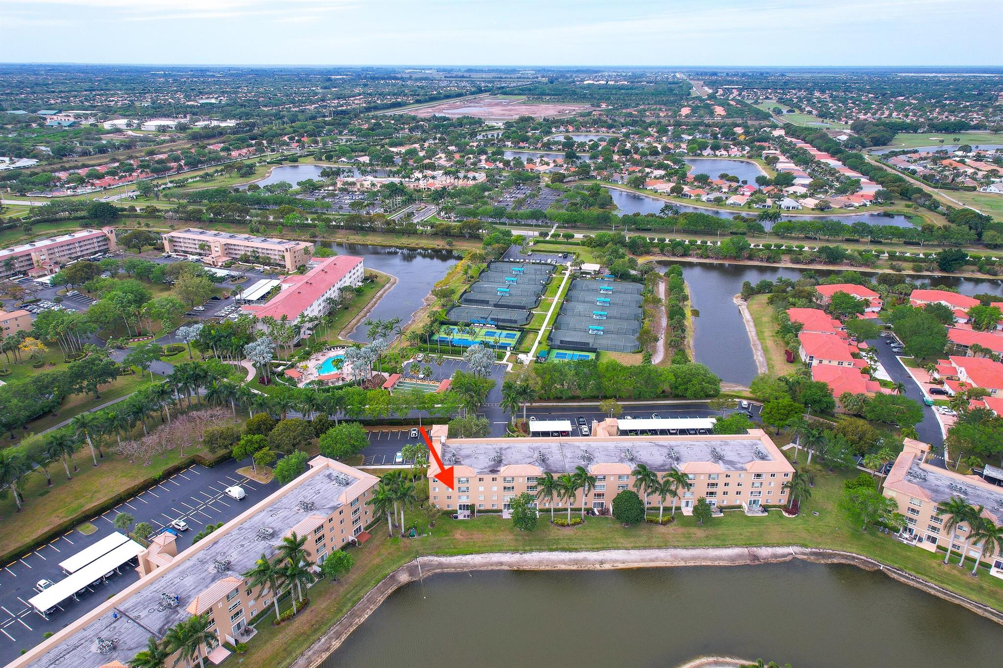 You'll love the gorgeous LAKE view from this bright and spacious unit in a fantastic, active 55+ community that has so much to offer! The eat-in kitchen is equipped with stainless steel appliances, Corian countertops, pantry and breakfast area. There is ceramic tile in the living areas and den, laminate in the guest bedroom and luxury carpet in the primary bedroom. The primary bedroom faces the lake, and offers a generous walk-in and strip closets. The en-suite primary bathroom is finished with dual sinks, separate tub and shower. Other notable features include a laundry room with a sink, plenty of storage closets, plantation shutters, 2023 AC and 2021 water heater. The roof is expected to be replaced in 2025. This unit is located steps away from the palm tree oasis of a satellite pool