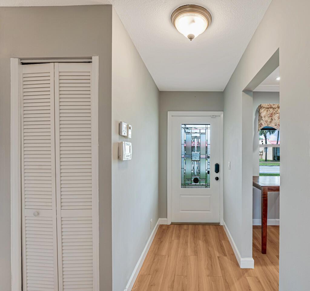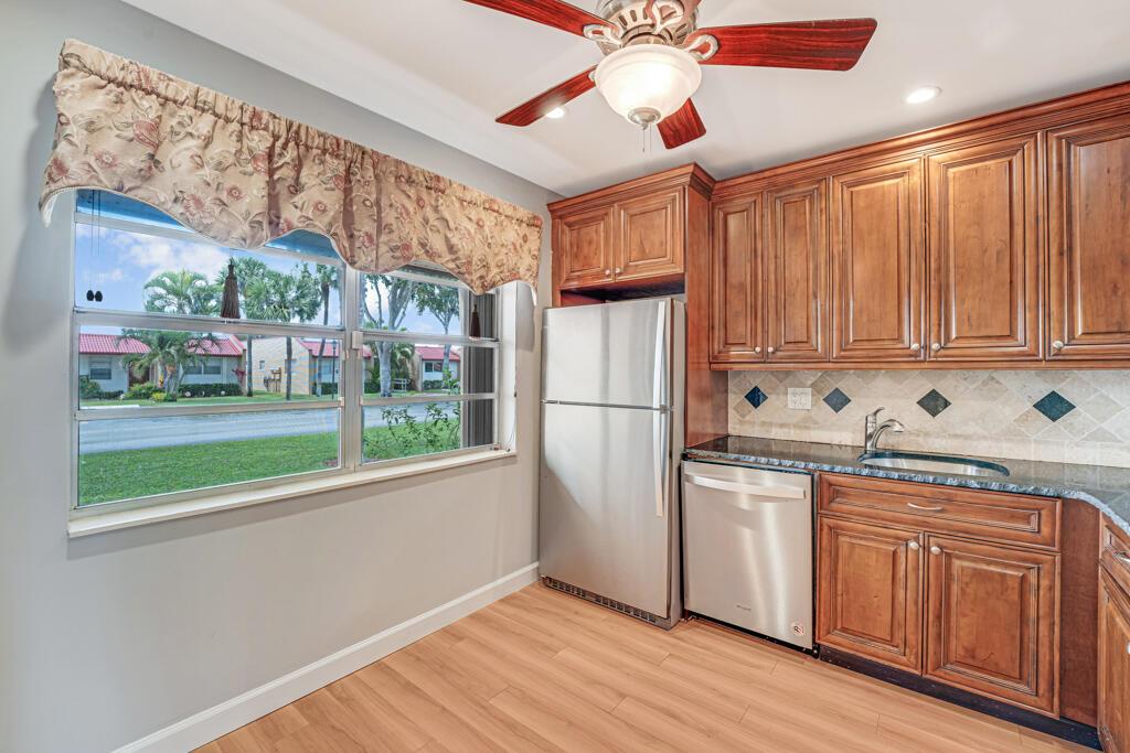 Bright & Spacious - Move-In Ready Corner Villa-Beautifully renovated 2/2 villa in Golden Lakes, a 55+ guard-gated community. This home offers a dedicated dining area, a glass-enclosed porch, and stunning lake views. The kitchen features Stainless Steel appliances, granite counters, and ceiling-height cabinets. Both baths are remodeled w/ walk-in showers. Roll-down & accordion storm shutters provide full storm protection. Just steps from the satellite pool. In-unit washer/dryer. Monthly fees cover cable, water, bldg insurance, & high-speed internet & more. Enjoy the active community w/ courtesy bus, fitness classes, weekly movies, & more. Just mins from downtown WPB, the beach, PBI Airport, & major highways like the FL Turnpike. A little piece of heaven I Seller open to holding mortgage!