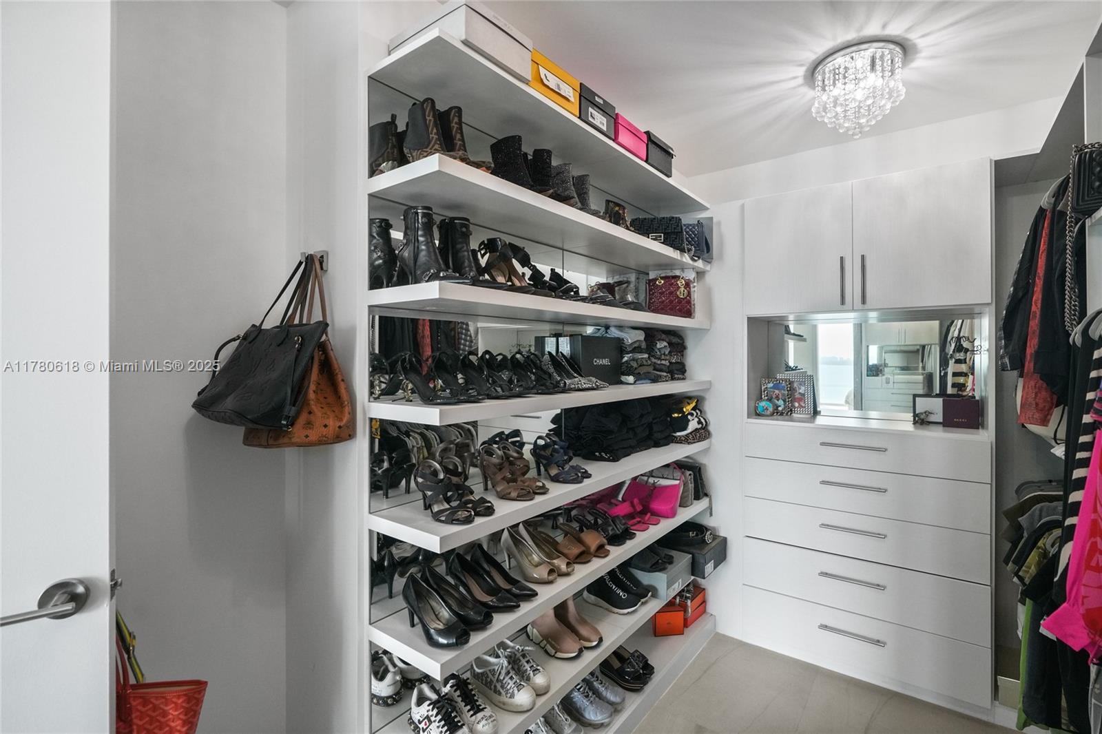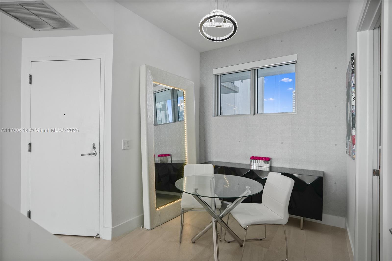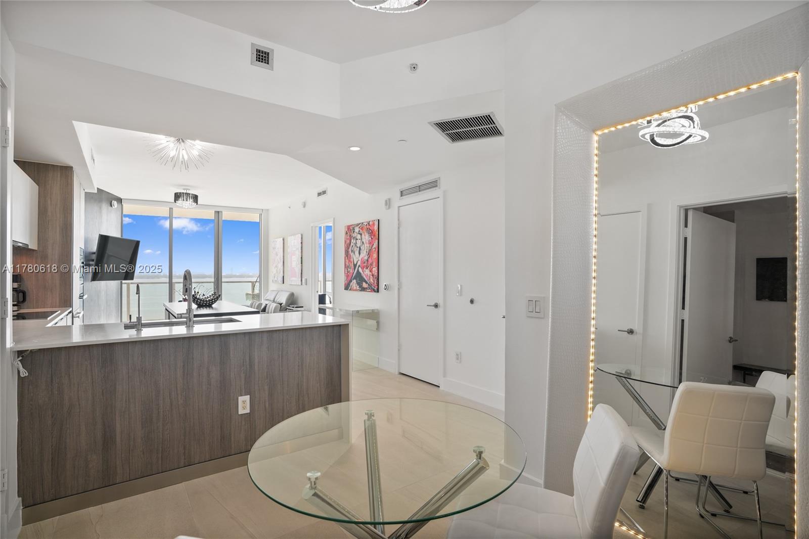 This stunning 2-bedroom, 3-bathroom condo with a den features luxury upgrades like a UV light system, 3M water filter, and Roberto Cavalli wallpaper. The master suite offers a custom closet, full-wall mirror, updated shower with new handles, and sleek floating vanities. Italian porcelain floors, a black kitchen island, and electric blackout shades add to the elegance. Designed by Thom Filicia, the condo includes private elevator access, top-tier appliances, and bay views. Amenities feature two pools, beach club, gym, spa, tennis courts, dog park, and 24-hour concierge. Spot #664 parking included. Located 10 minutes from the Design District, Midtown, and the American Airlines Arena, enjoy exclusive Miami events like sunset cruises and beachfront yoga.