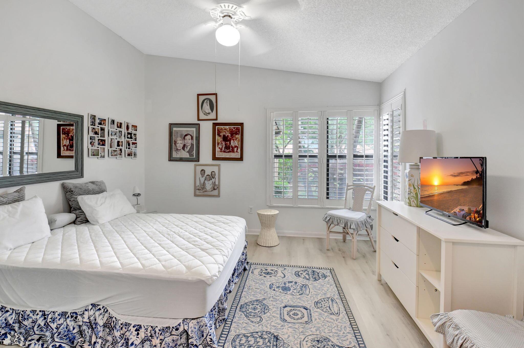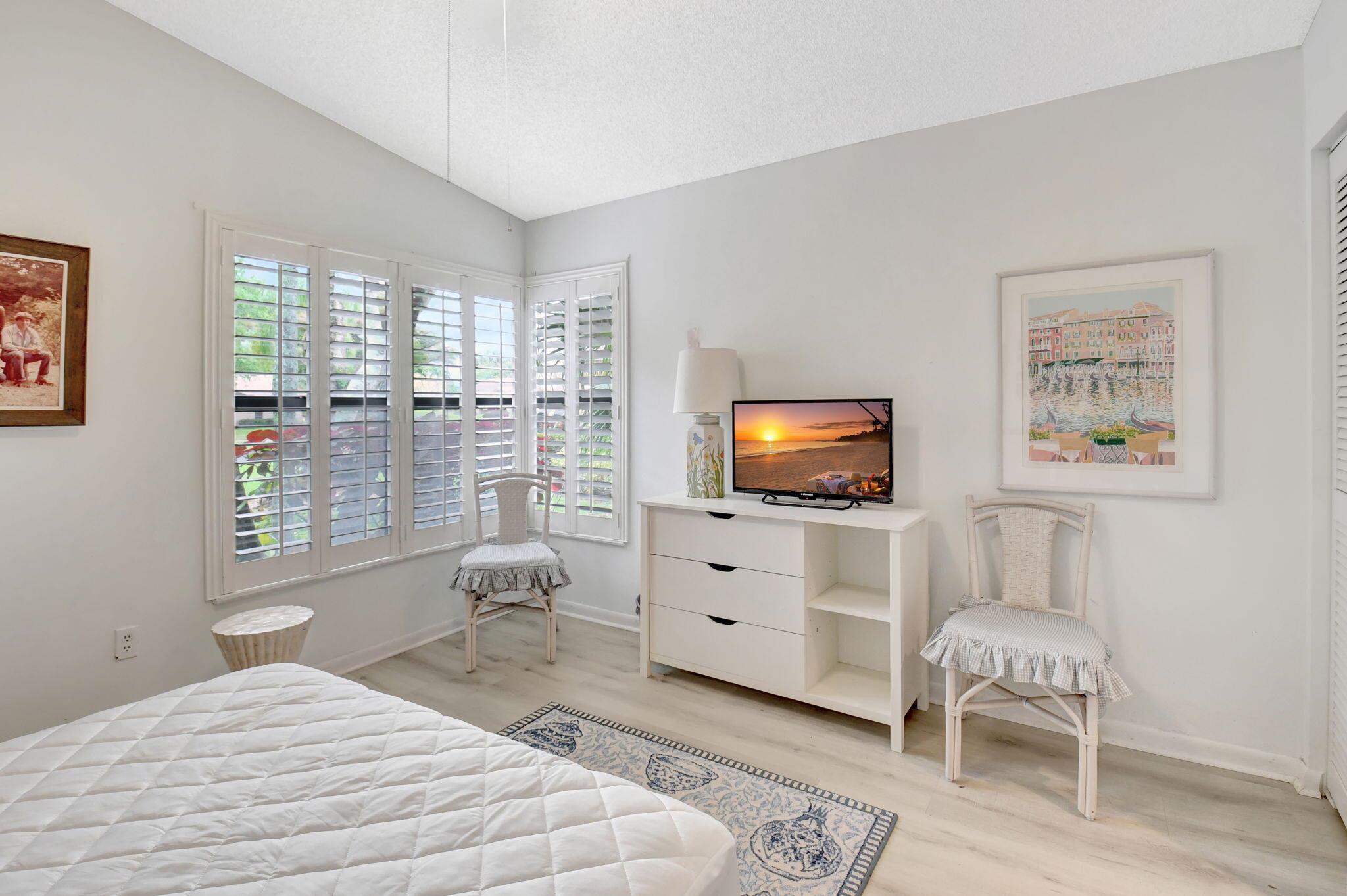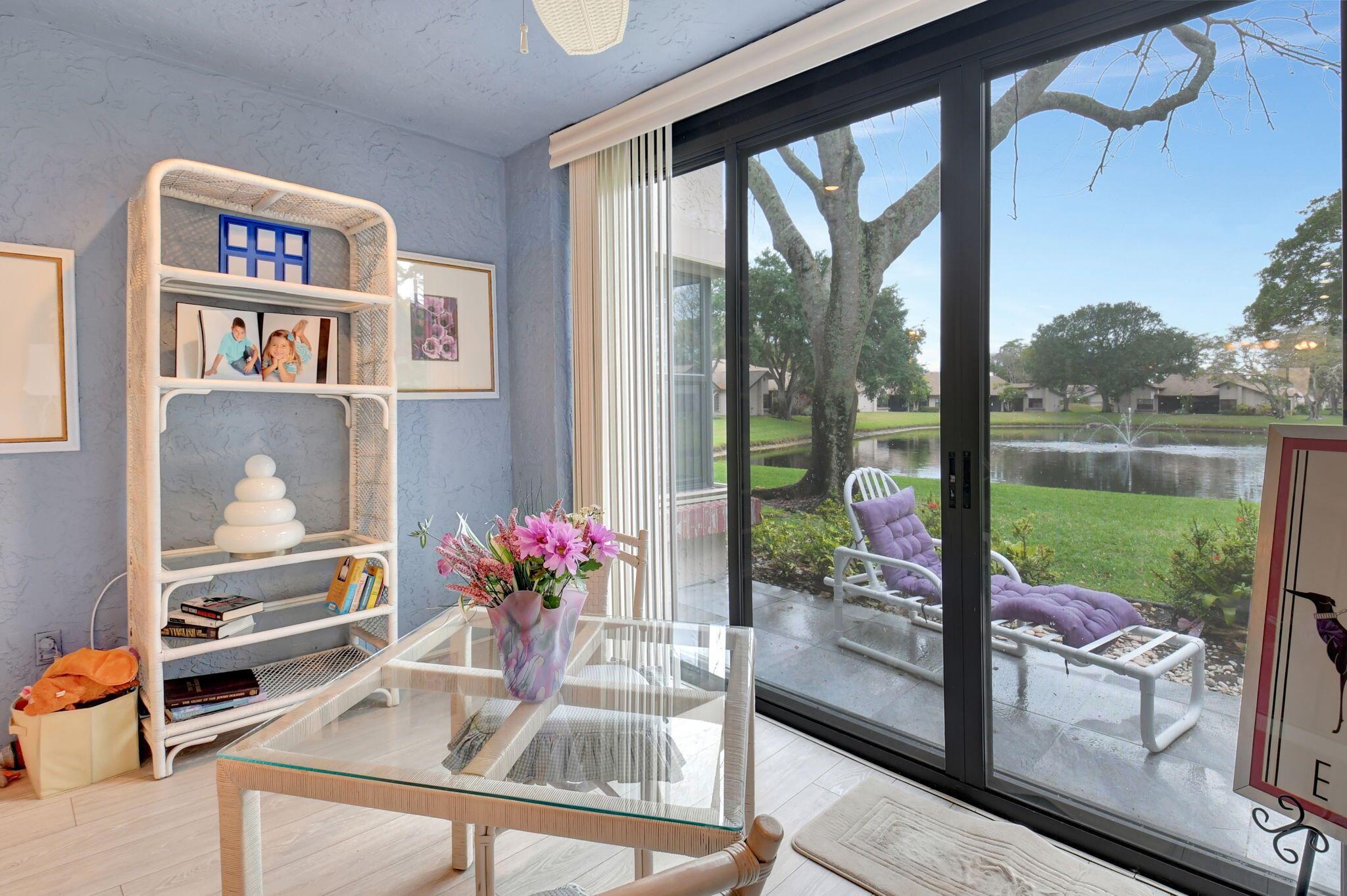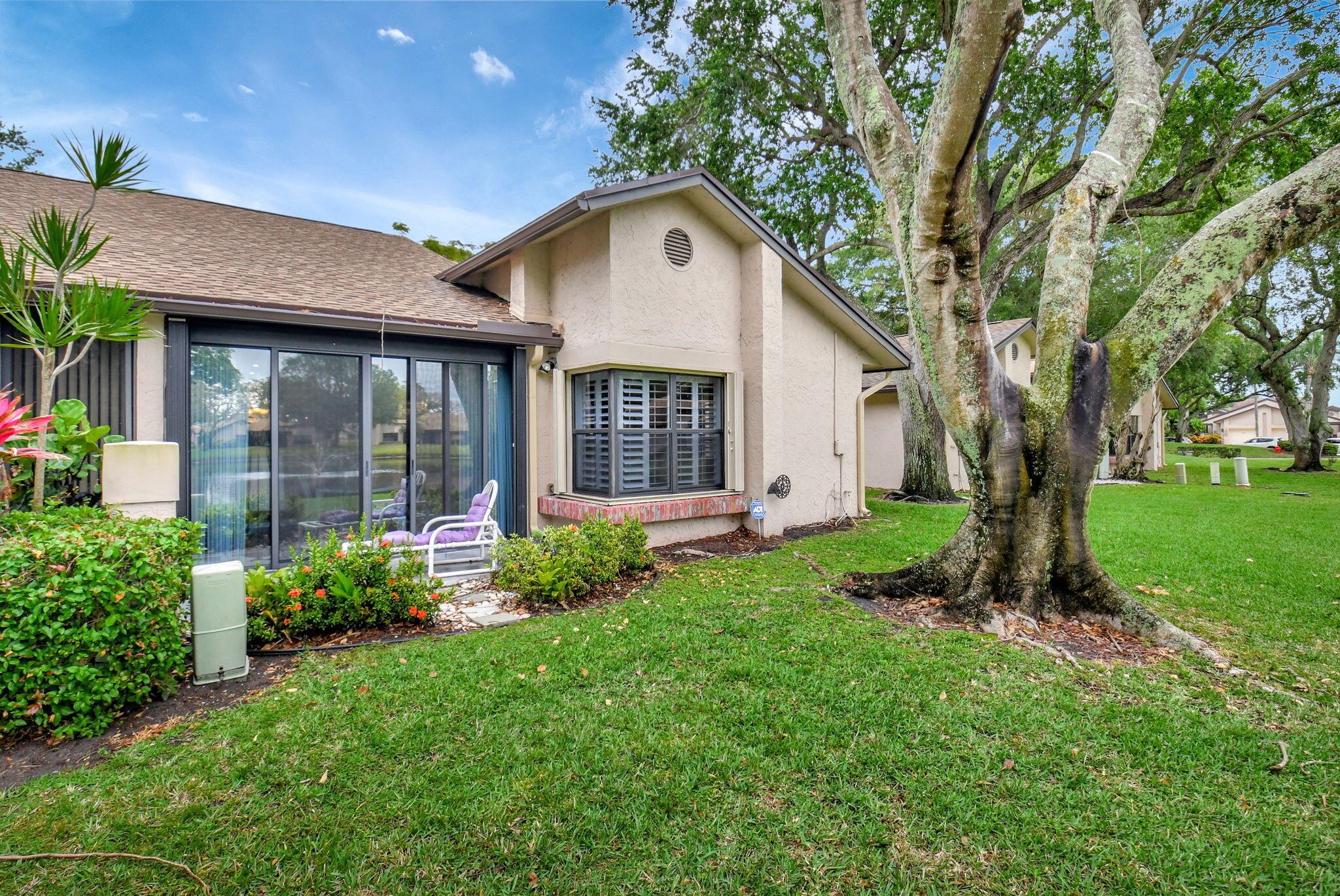 Great long lake view - 3 Bedroom, 2.5 Bathroom updated Villa with a private courtyard and 1.5 car garage. Enjoy the lake view from almost everywhere in this home. Updated eat in kitchen with plenty of cabinet space. Updated bathrooms plus new windows with accordion shutters plus beautiful Plantation Shutter throughout. The roof was replaced in 2024. Easy walking distance to clubhouse, community pools , and other amenities. Boca Delray is a non-mandatory membership community with a 24 hour manned gate, newly remodeled clubhouse, fitness center, 2 community pools, Har Tru tennis courts, Pickleball, bocce, and an 18 hole executive golf course. Affordable golf memberships are available.