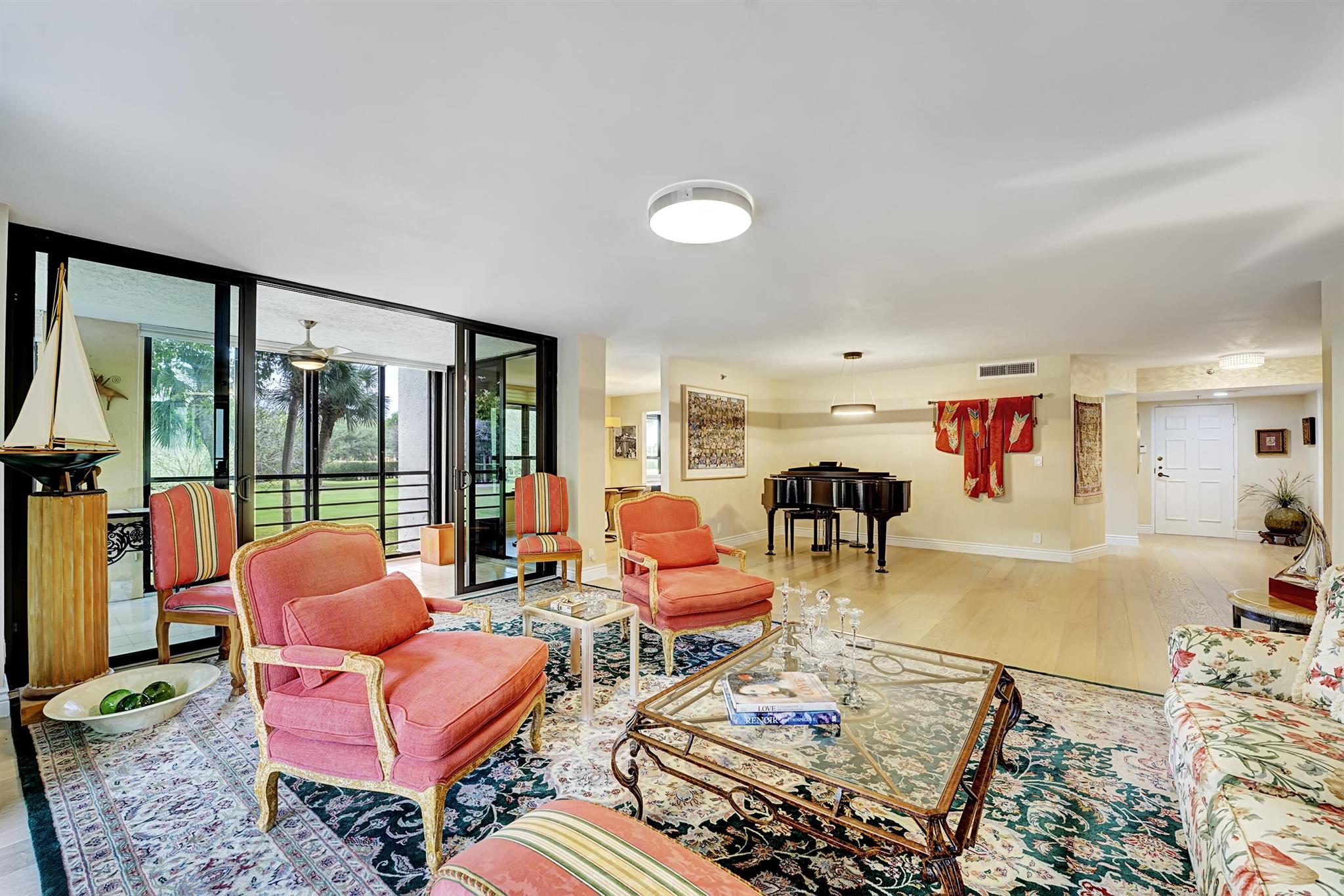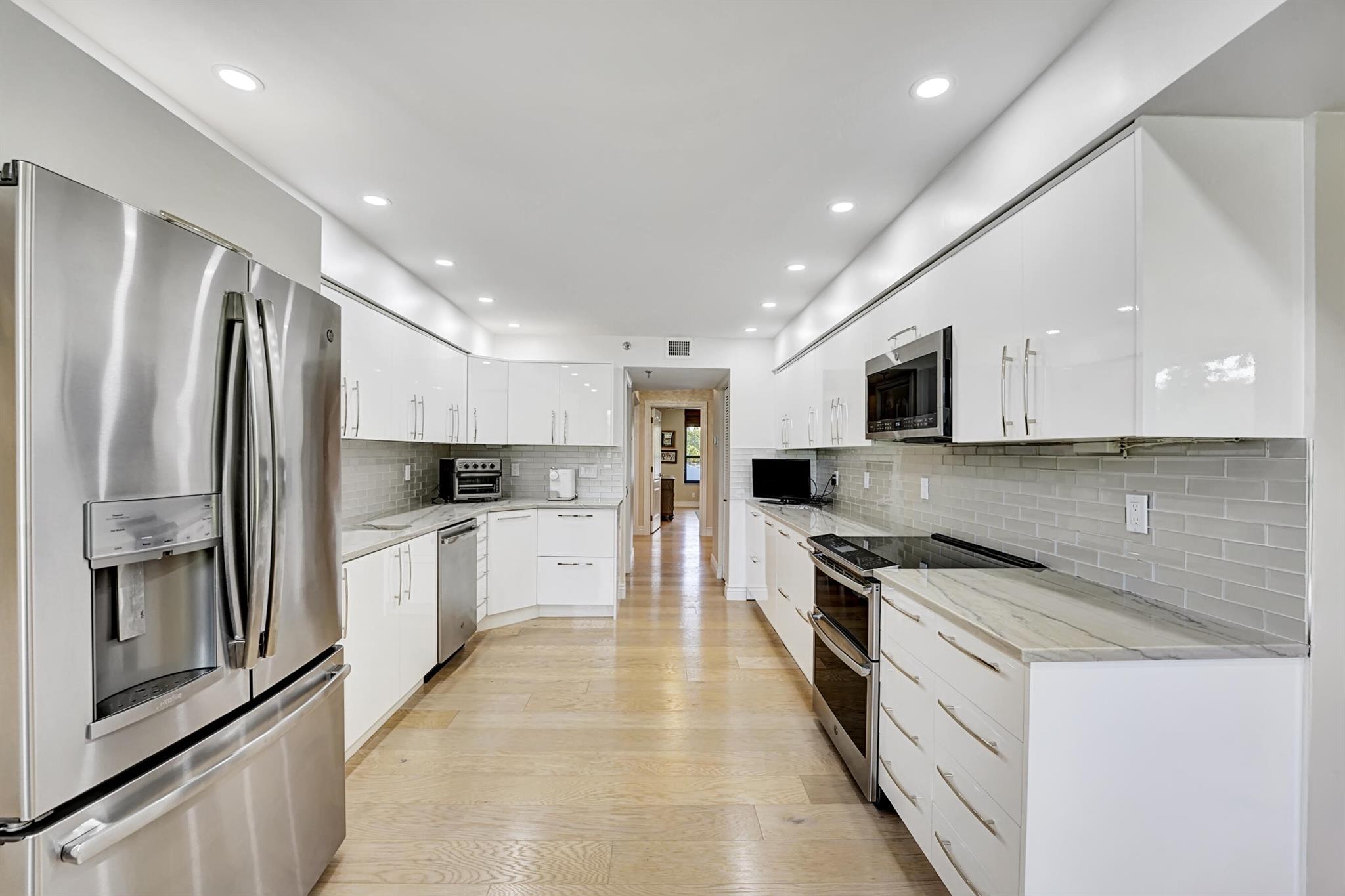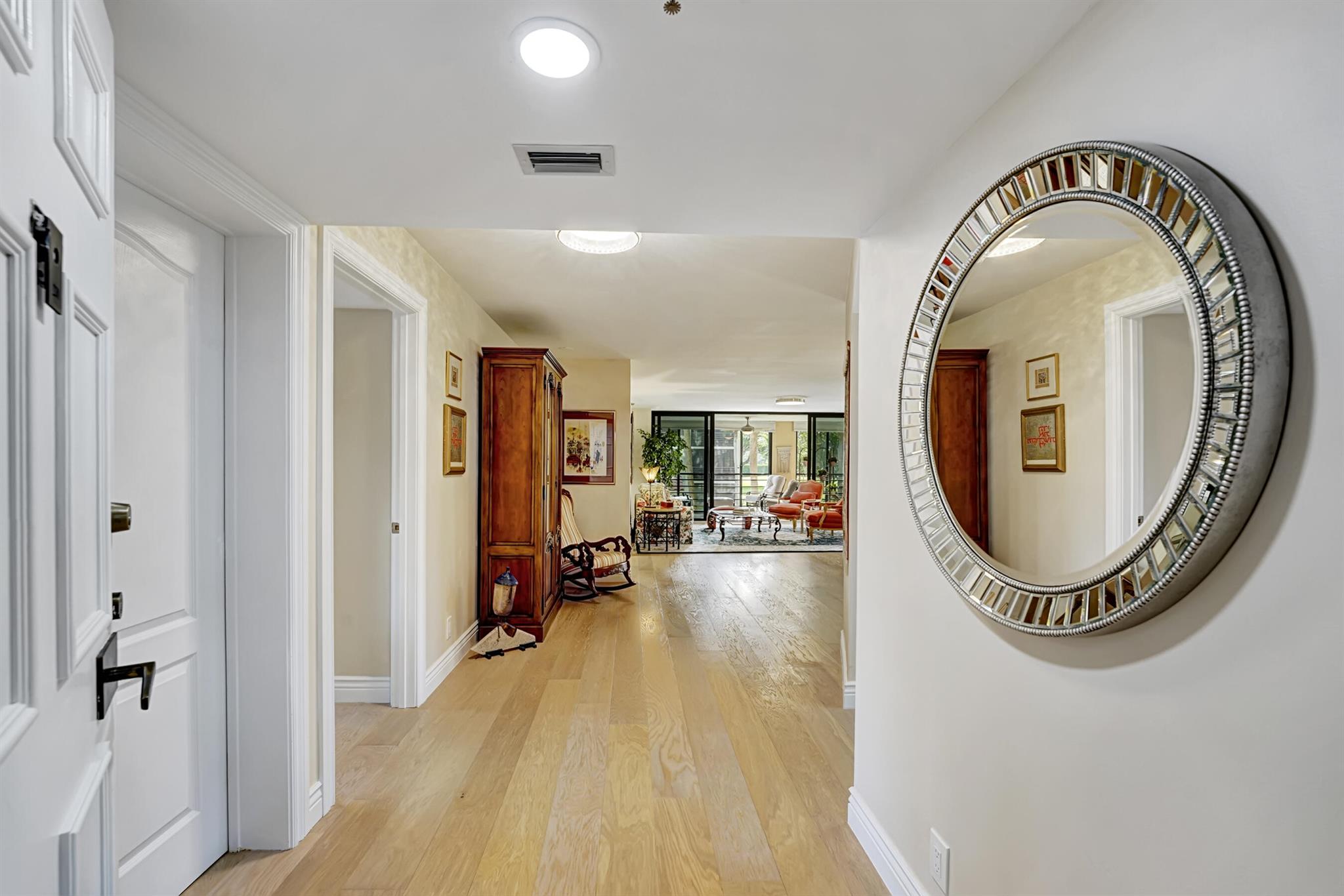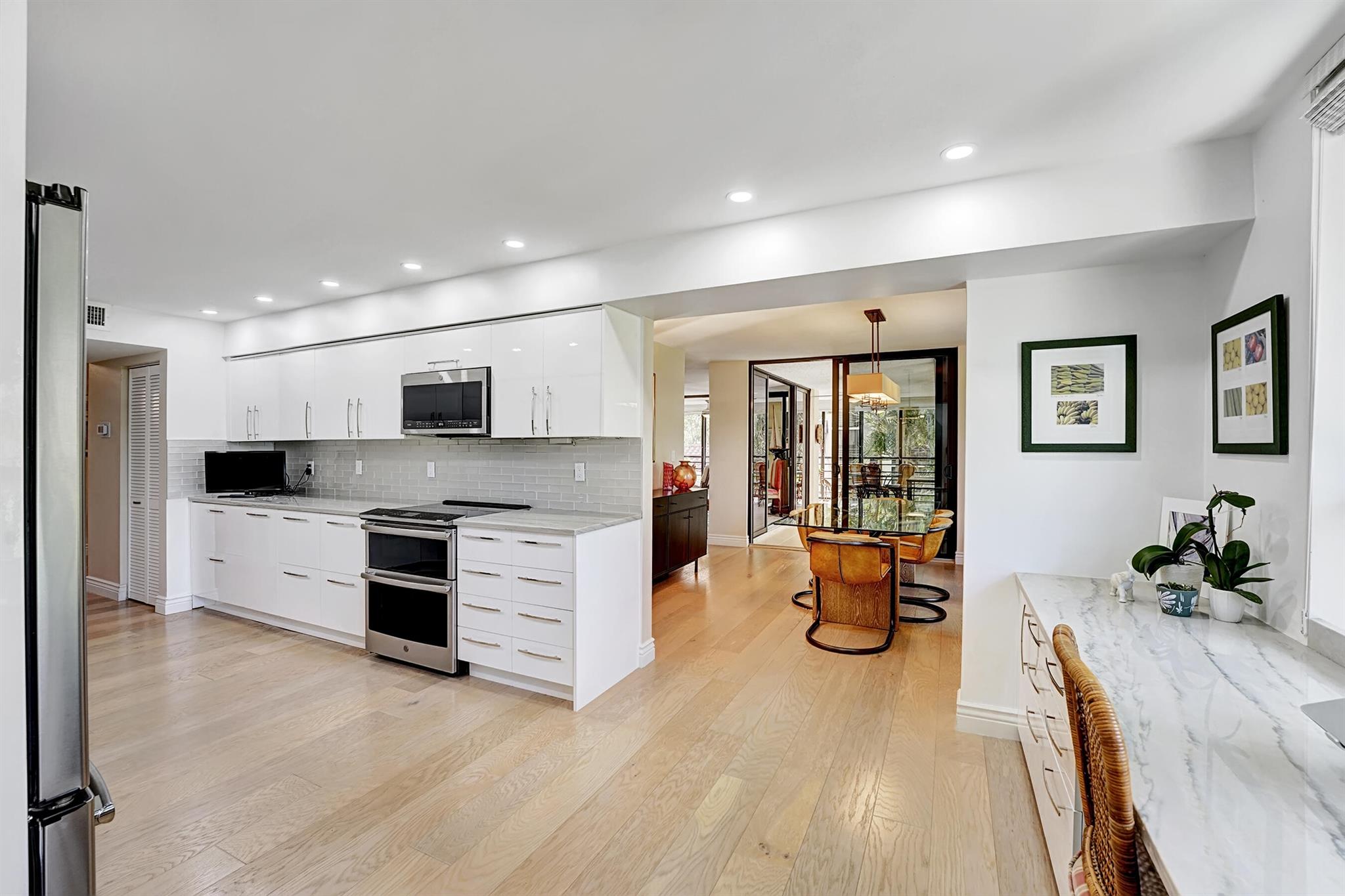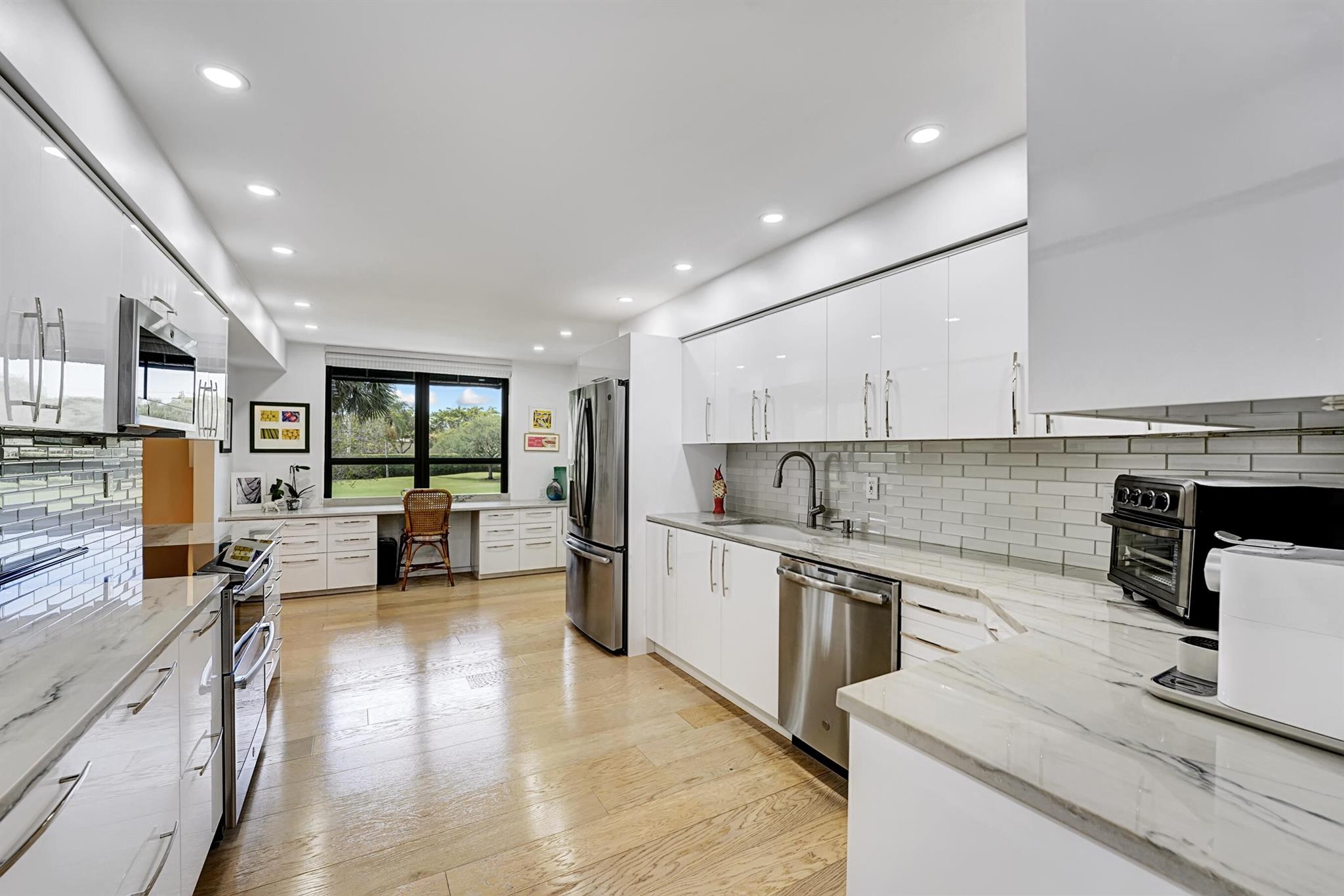 Don't miss the opportunity to own this stunning, move-in ready corner condo that lives like a private home. Completely renovated with meticulous attention to detail, this spacious residence has an expansive wraparound balcony with a gorgeous view of the golf course. Warm wood flooring flows throughout, complementing a host of luxury upgrades. The contemporary chef's kitchen is a true showstopper, featuring quartzite countertops, a double oven range, ample storage with easy-access drawers, a large walk-in pantry with shelving, and a built-in workstation overlooking the greens. The primary suite offers a spa-like bathroom with generous storage, an oversized shower, a high-end toilet, along with a massive walk-in closet outfitted with custom shelving.