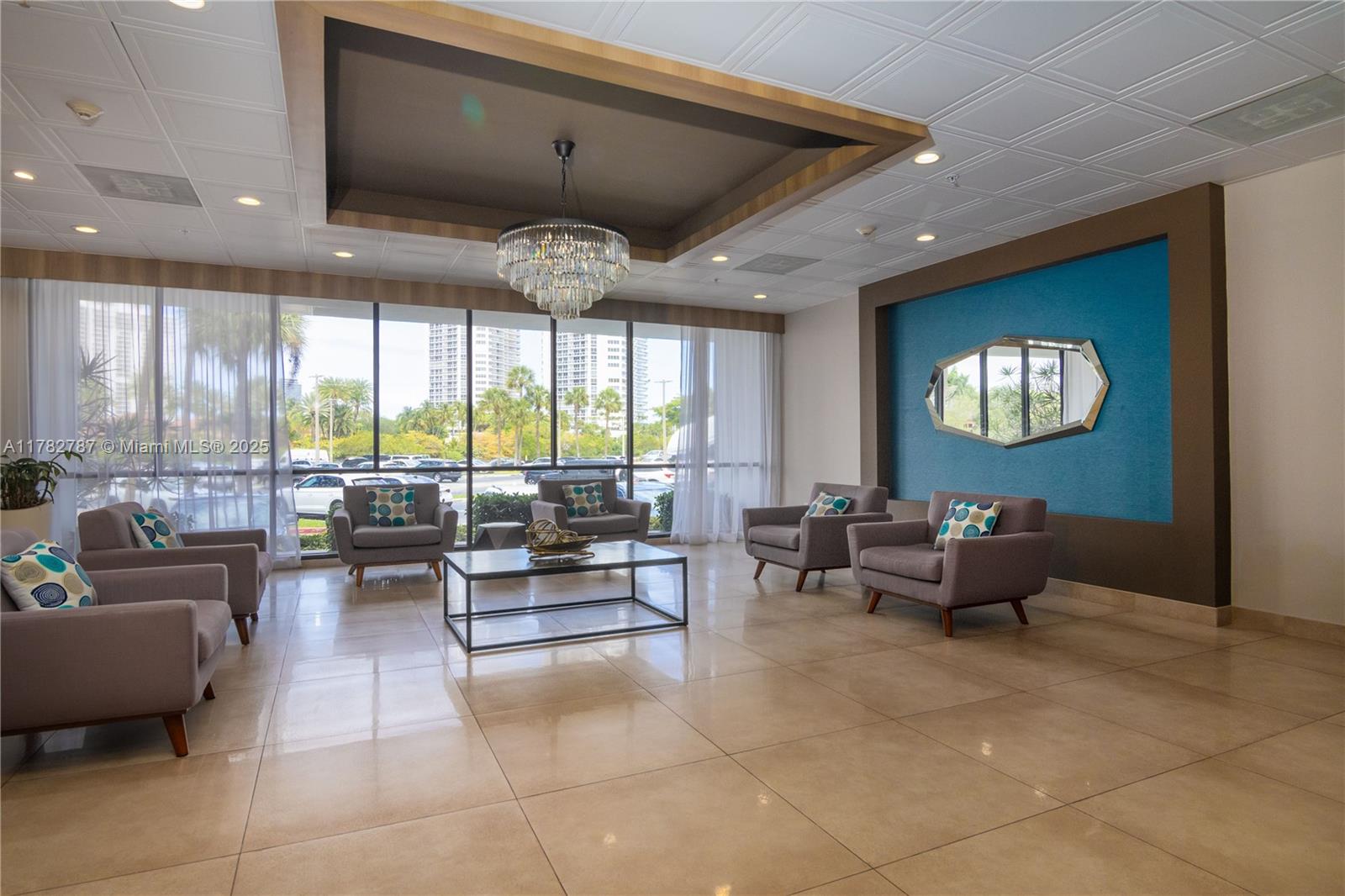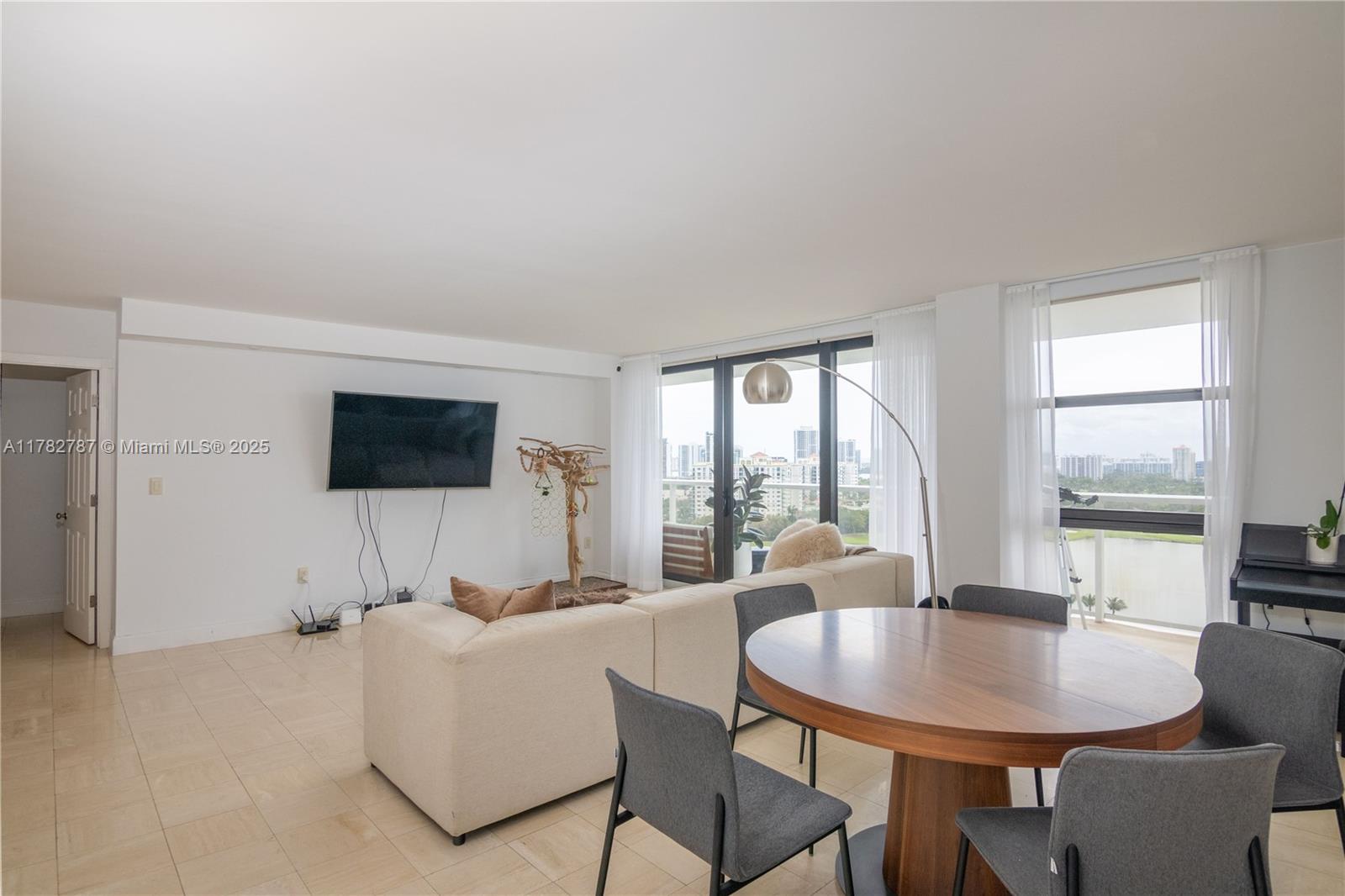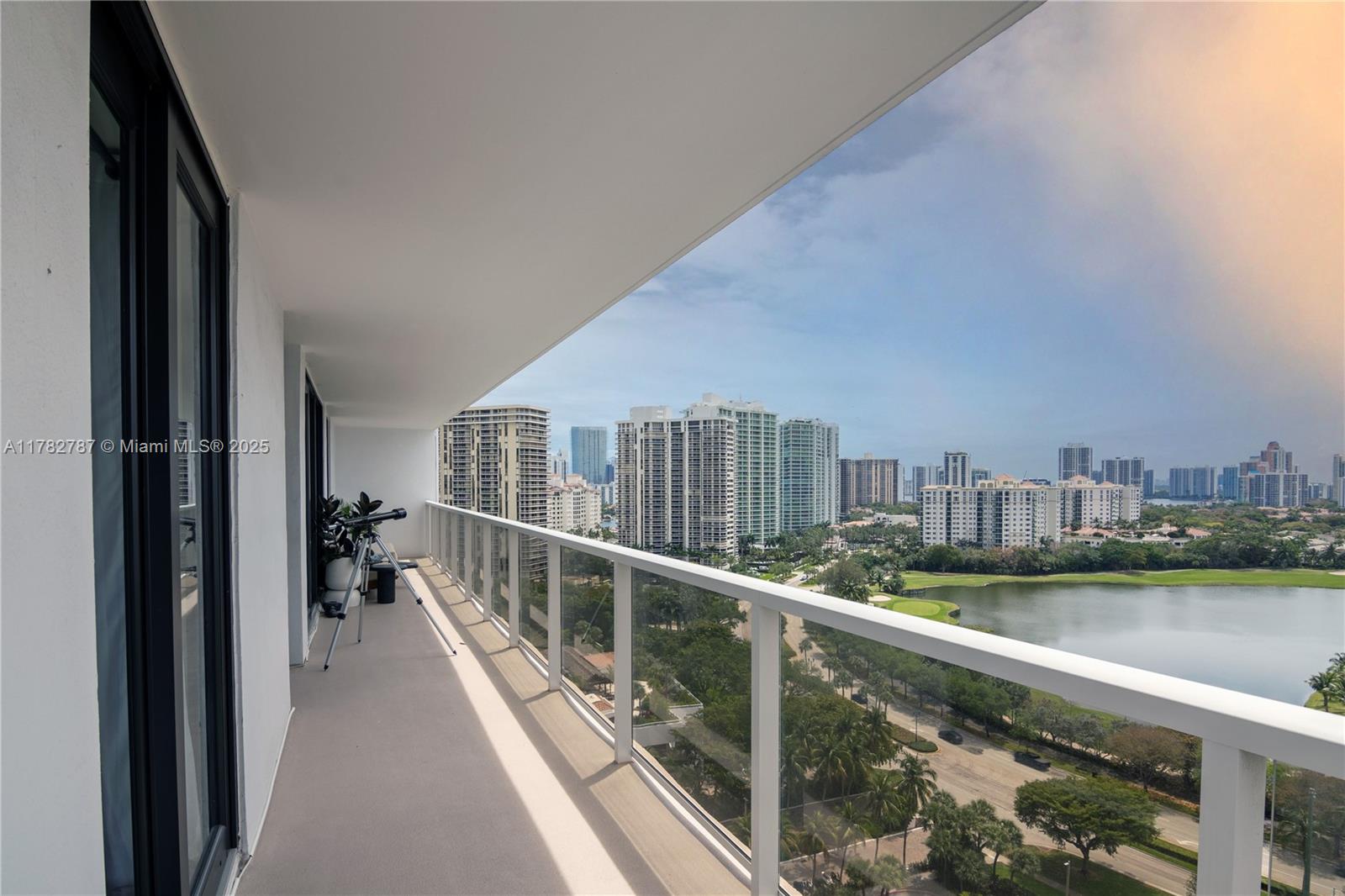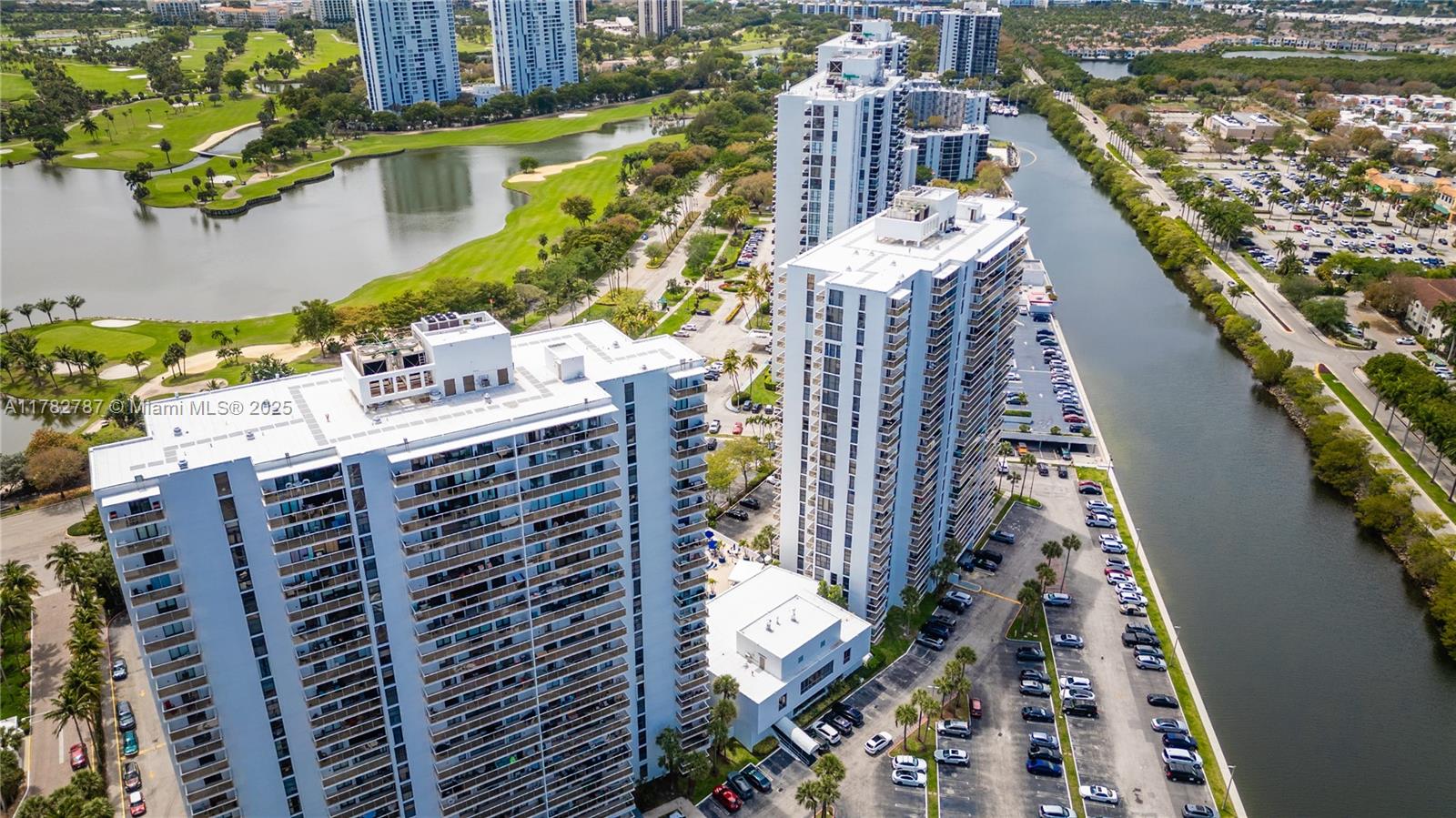 Soaring from the 19th floor, this 3-bed, 3-bath condo offers stunning golf and city views in a bright, open layout. With 1,465 sqft of tile-floored living space, the home features a well-equipped kitchen with an electric range, microwave, refrigerator, washer, and dryer in the unit. Enjoy morning coffee or sunset wine on the spacious open balcony. Central cooling and ceiling fans ensure year-round comfort, while a doorman provides added security. The waterfront building offers assigned and guest parking, blending convenience with elevated living. This high-rise retreat is perfect for those seeking comfort, style, and serene views in every direction.