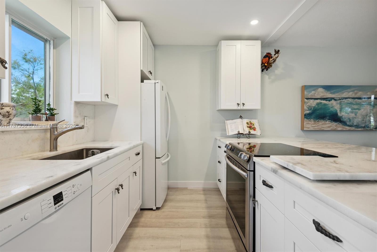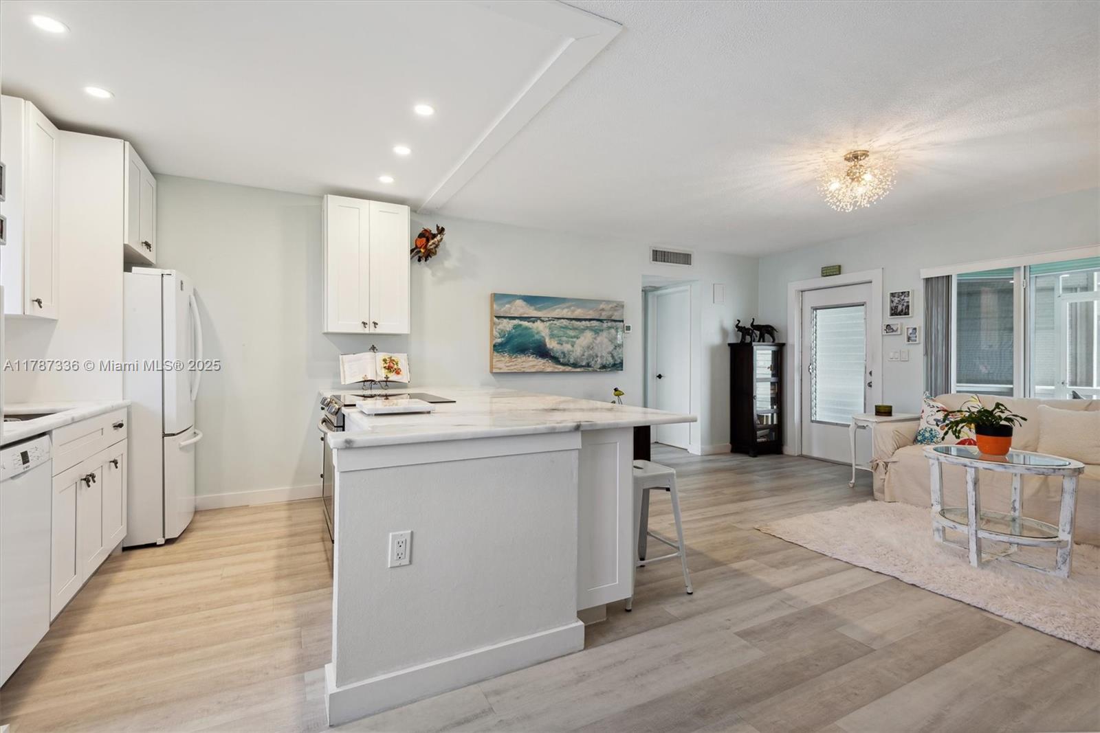 EAST FORT LAUDERDALE | Remodeled Corner Unit in highly desirable Coral Ridge neighborhood. Open concept floor plan, gourmet kitchen with soft-close cabinetry, pewter hardware, oversize Quarzite cooking island with under-counter storage space. Neutral tones, light, bright & airy, new baseboards/hardware/light fixtures/hardware throughout! Mohawk soundproof flooring, newer HVAC, and some Hurricane Impact Glass. Spacious bedroom with walk-in closet and updated bathroom. This is a well-maintained boutique building in a walkable community, easy access to beaches, shopping, restaurants, hospital and all major highways. Enjoy the pool and golf views from your tranquil and roomy Lanai. Inspections passed, all assessments paid by the seller.