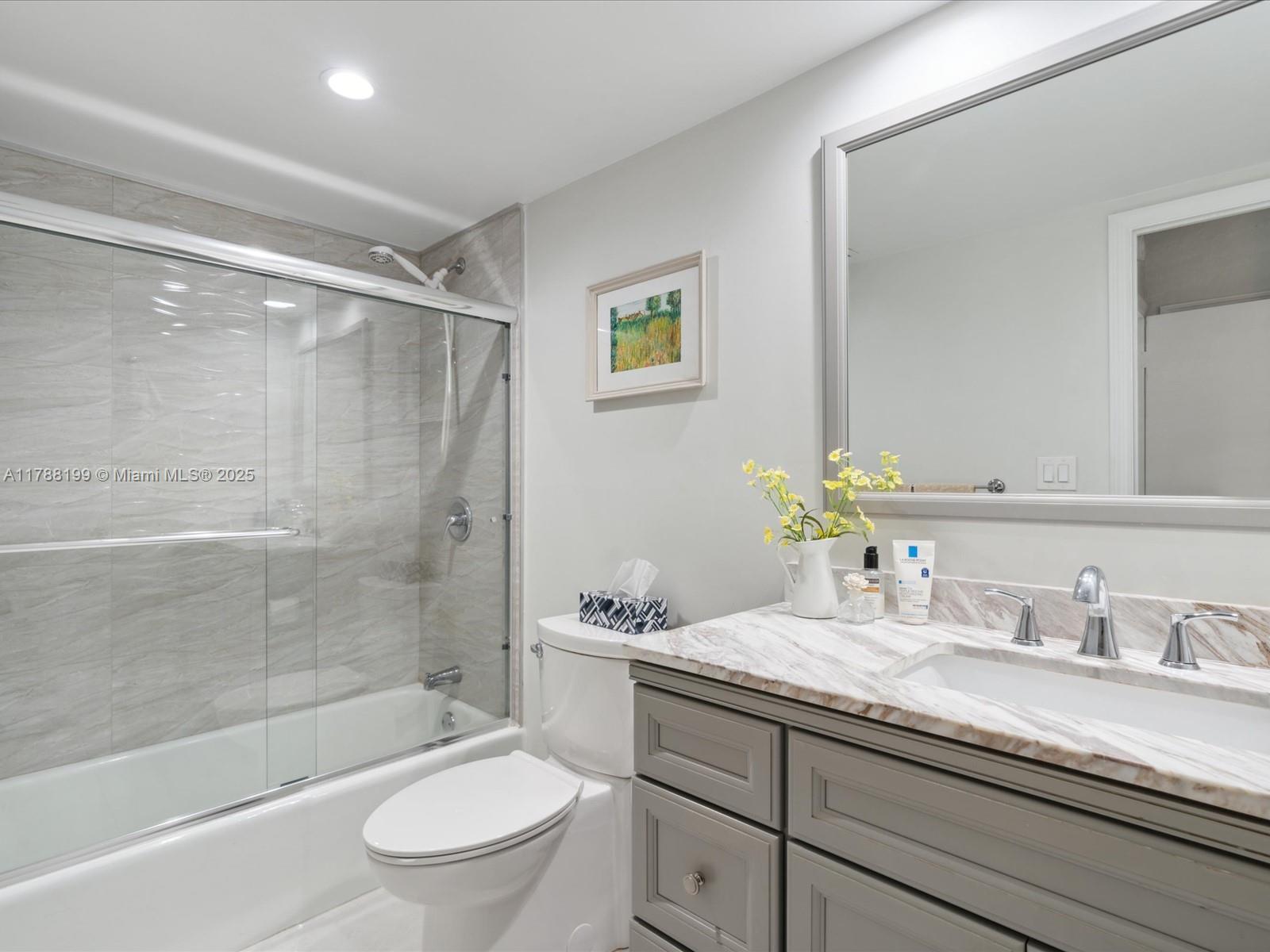 Step into this beautiful and remodeled unit! This large 1 bed, 1.5 bath is elegant and very spacious! Entryway has 2 separate closets. Bedroom has 2 separate large built-in walk in closets. Upgraded primary bathroom with shower and tub! Upgraded powder room. Both bathrooms have new vanities with natural marble and new toilets. Fabulous upgraded bright open kitchen with an island for entertaining. Prime location in Sunny Isles, right across the street from the beach. Minutes from Aventura Mall, Bal Harbour Shops, Casinos, Airports, shopping centers, and grocery stores. Full service building with pool on intracoastal, gym, bbq area, convenience store, and 24/7 security and valet. 1 covered assigned parking spot included. HOA includes cable, wifi, water and A/C.