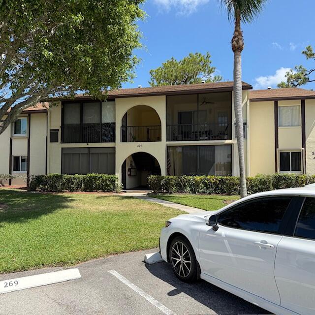 This apartment, situated in a 55 and Over Community, boasts a central location near dining and shopping options. It features a first-floor layout with a spacious enclosed balcony and a large storage closet. All windows are hurricane-resistant, with the exception of the front door, and the balcony is equipped with storm shutters. The community is welcoming and includes amenities such as a swimming pool and clubhouse. The unit requires updates and tender loving care. The tile at the entrance is optional and can be removed if not desired. All offers are welcome, and the owner will respond promptly