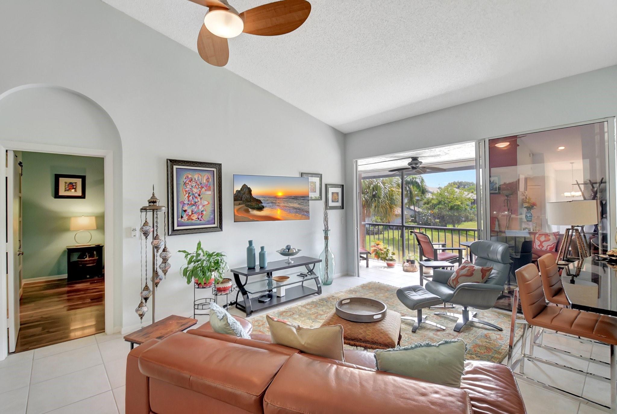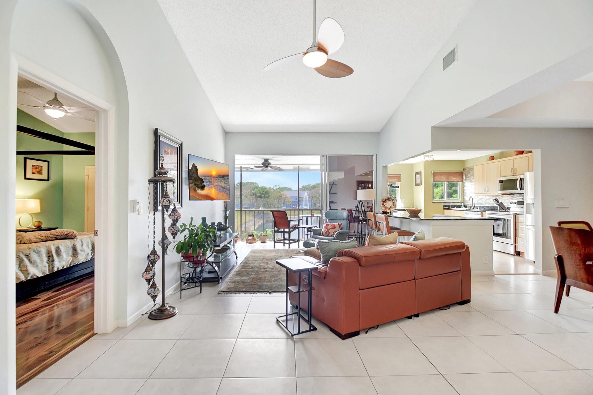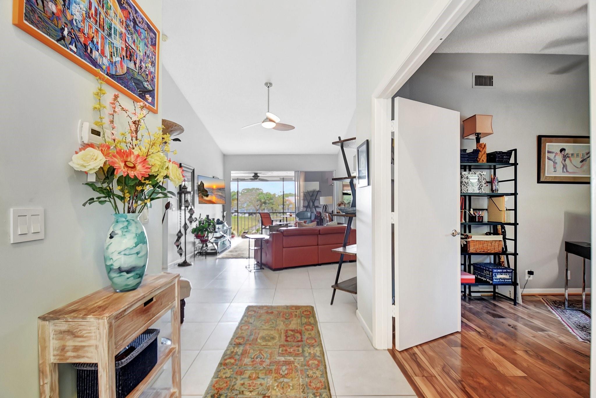 TENANT OCCUPIED UNTIL 9/2026 - INSTANT INCOME! 2nd floor residence in a prime Boynton Beach location only 10 minutes to the beach. Meticulously maintained home with expansive lake views from nearly every room. Soaring vaulted ceilings and an open-concept layout create a bright and airy feel throughout. Upgraded vinyl and tile flooring run seamlessly throughout the home. Renovated kitchen has solid wood cabinetry, newer appliances and ample counter space for entertaining. Spacious primary bedroom features a large walk-in closet with custom shelving and remodeled ensuite bath complete with an exquisite walk-in shower. Guest room w/custom murphy bed. Enjoy sunsets from your covered and screened-in balcony overlooking the lake. Impact windows, accordion shutters and private attached garage!