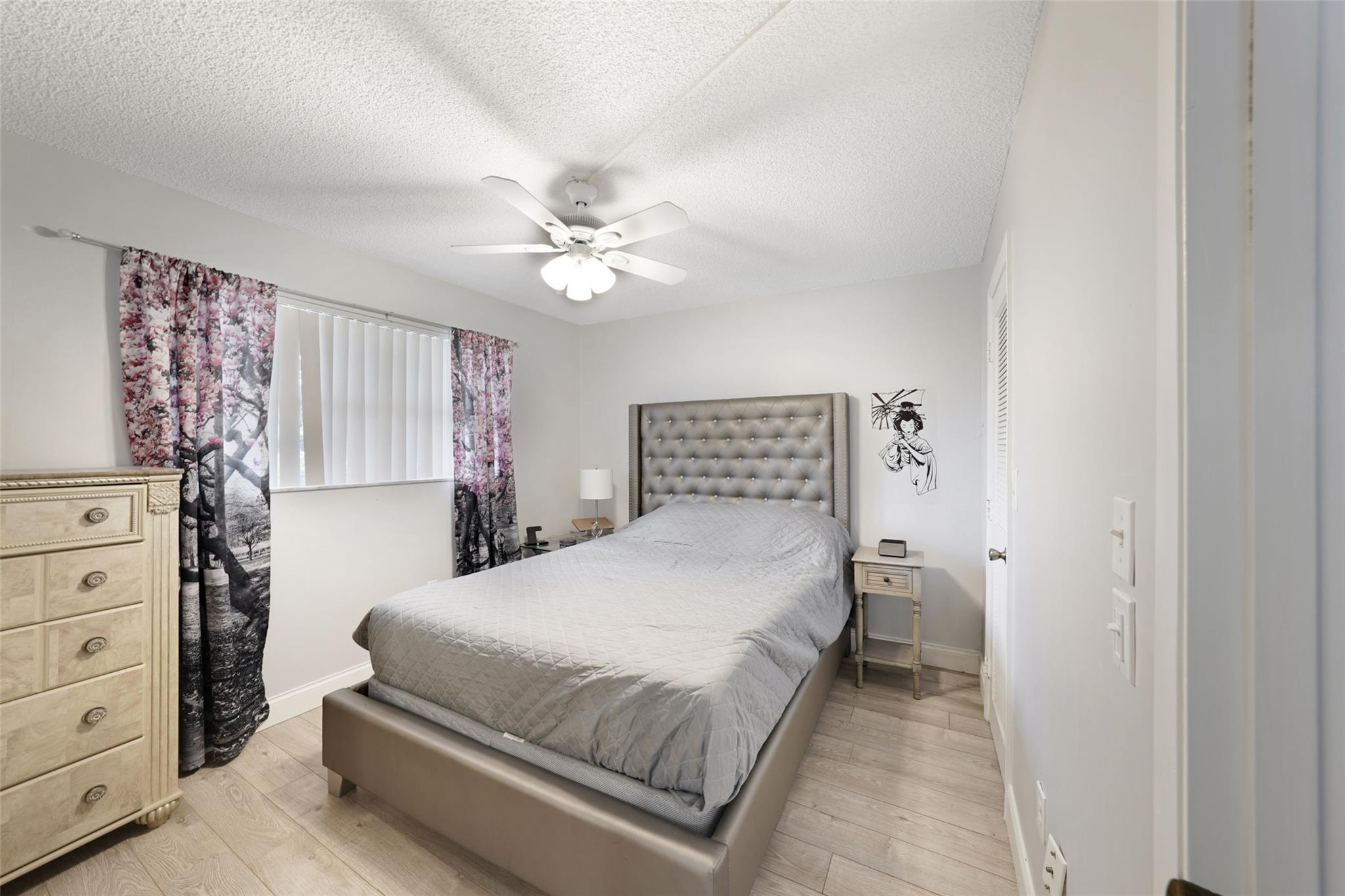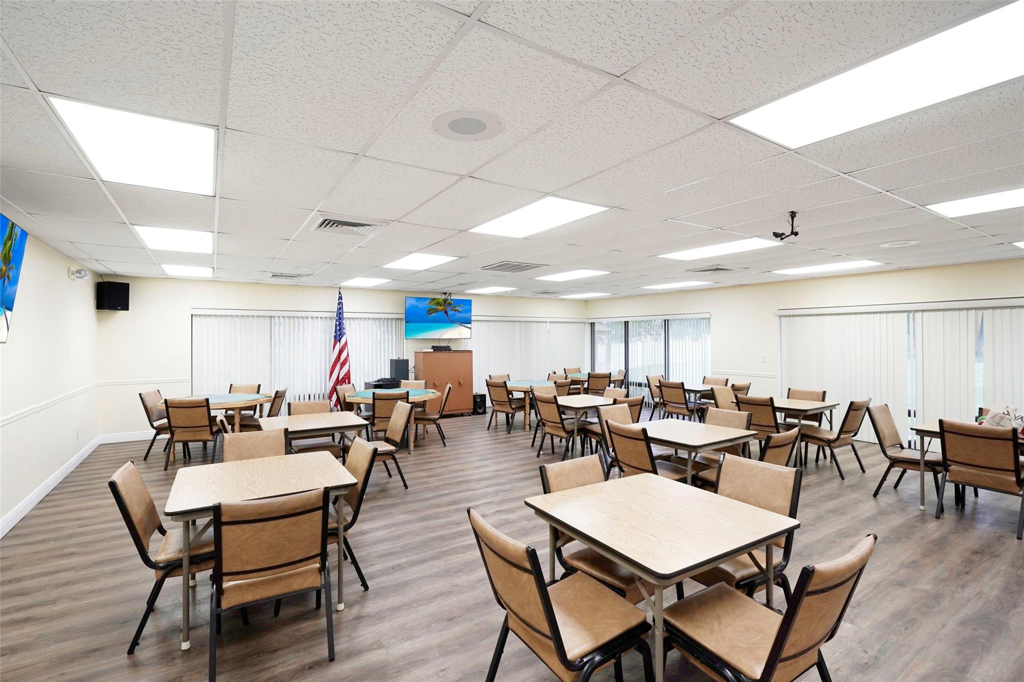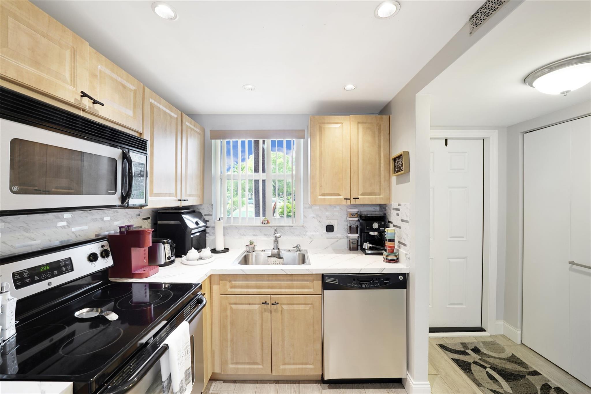 Beautifully remodeled 2-bedroom, 2-bath unit on the 1st floor. The extended living area and Florida room feature hurricane impact windows and doors, including a back door that serves as an emergency exit and opens to a serene lake view. The spacious master bedroom includes a walk-in closet, with laminate flooring throughout the unit. The renovated kitchen features recessed lighting and stainless steel GE appliances (range, microwave, dishwasher from 2012), complemented by a new Whirlpool refrigerator (2024). A/C and W/H are Rheem models from 2016. This is an active 55+ community, the complex boasts its own golf course with free access for residents. The clubhouse offers a wide range of amenities including tennis courts, indoor and outdoor heated pools, sauna, and gym.