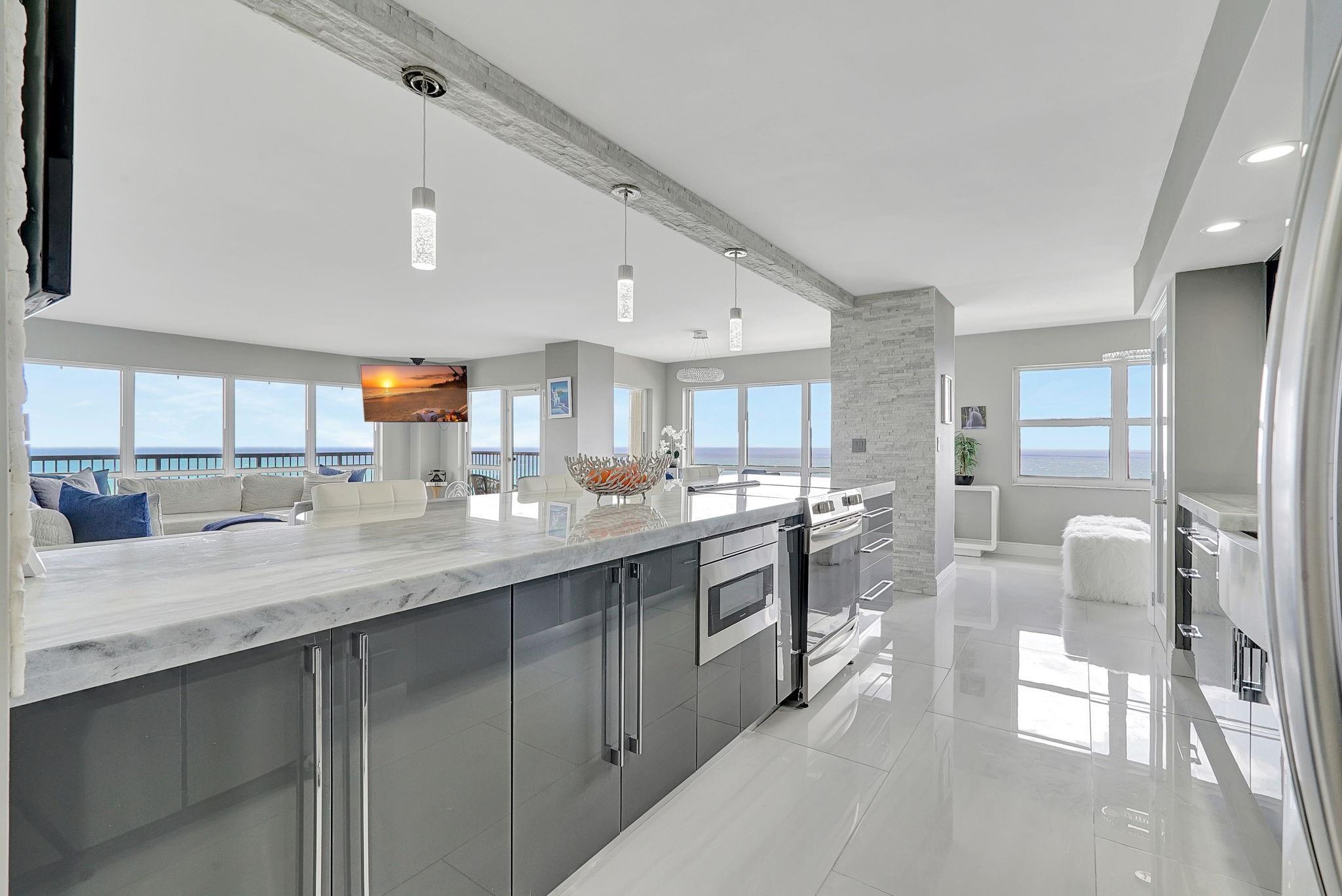 Welcome to this spectacular 3bedroom, 2.5 bath luxury penthouse perched directly on the beachfront—where sweeping ocean views & elegant modern updates define everyday living. This residence boasts an open-concept layout flooded w/natural light & a seamless flow between indoor/outdoor spaces. The fully renovated Diemme Cucine Italian kitchen w/quartz countertops, Italian style bathroom cabinetry & ocean views from every bedroom offer upscale comfort w/timeless style. Unobstructed views of the coastline from your private balcony—perfect for morning coffee or sunset cocktails. W/ over $130k in special assessments already paid, enjoy worry-free ownership in one of the area’s most desirable buildings. Full-time residence or high-end investment this turnkey coastal gem delivers on all fronts