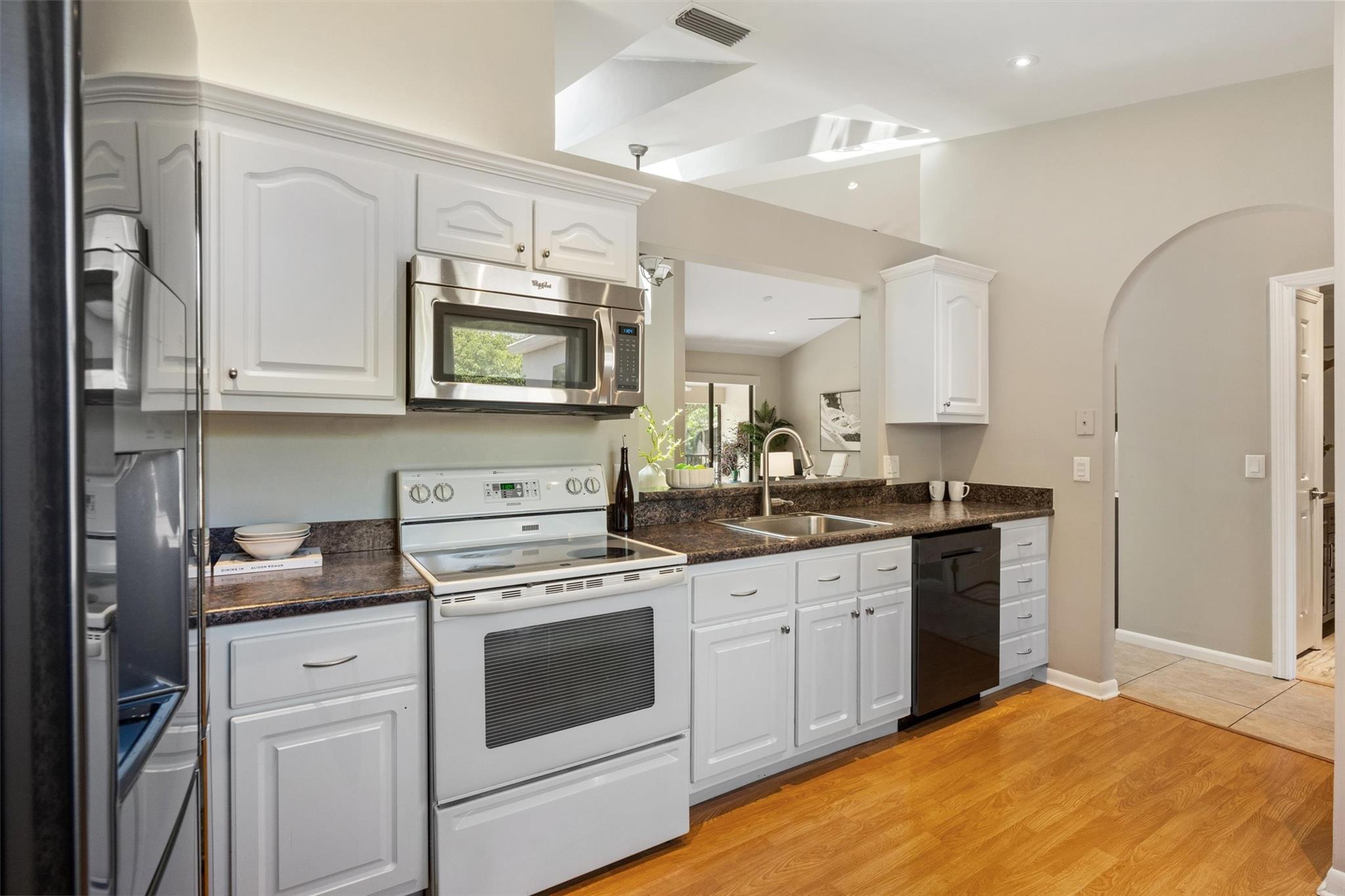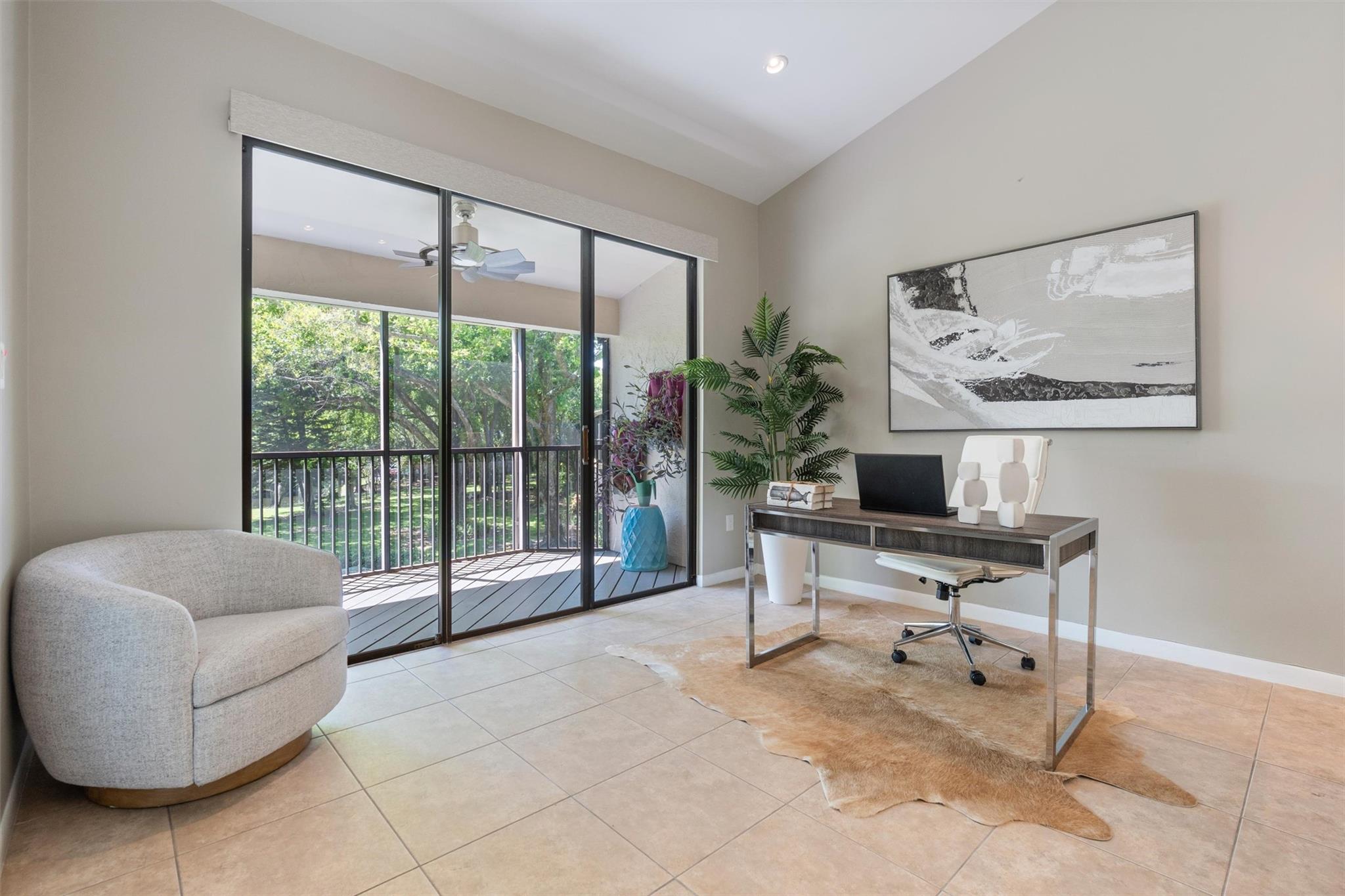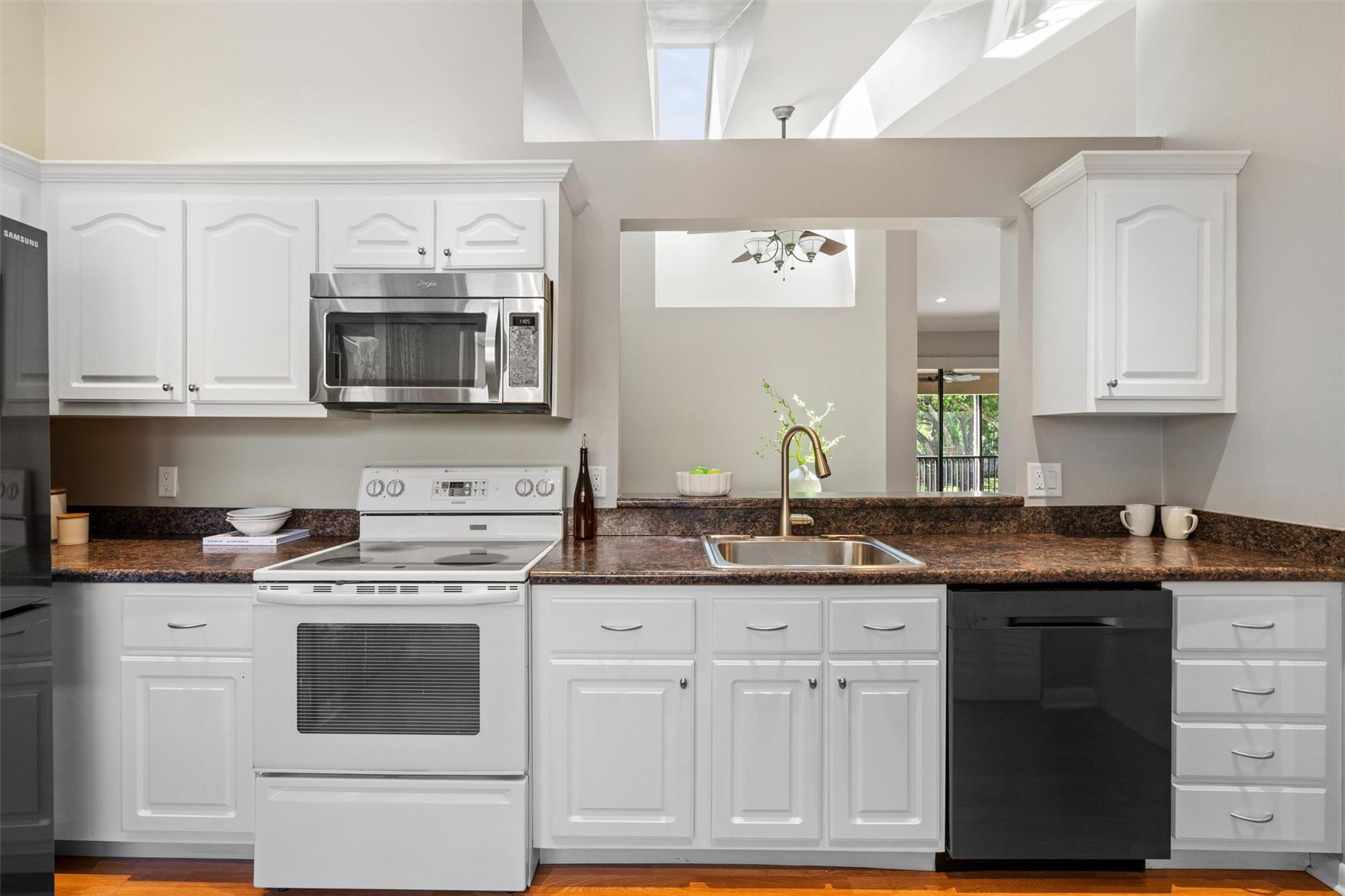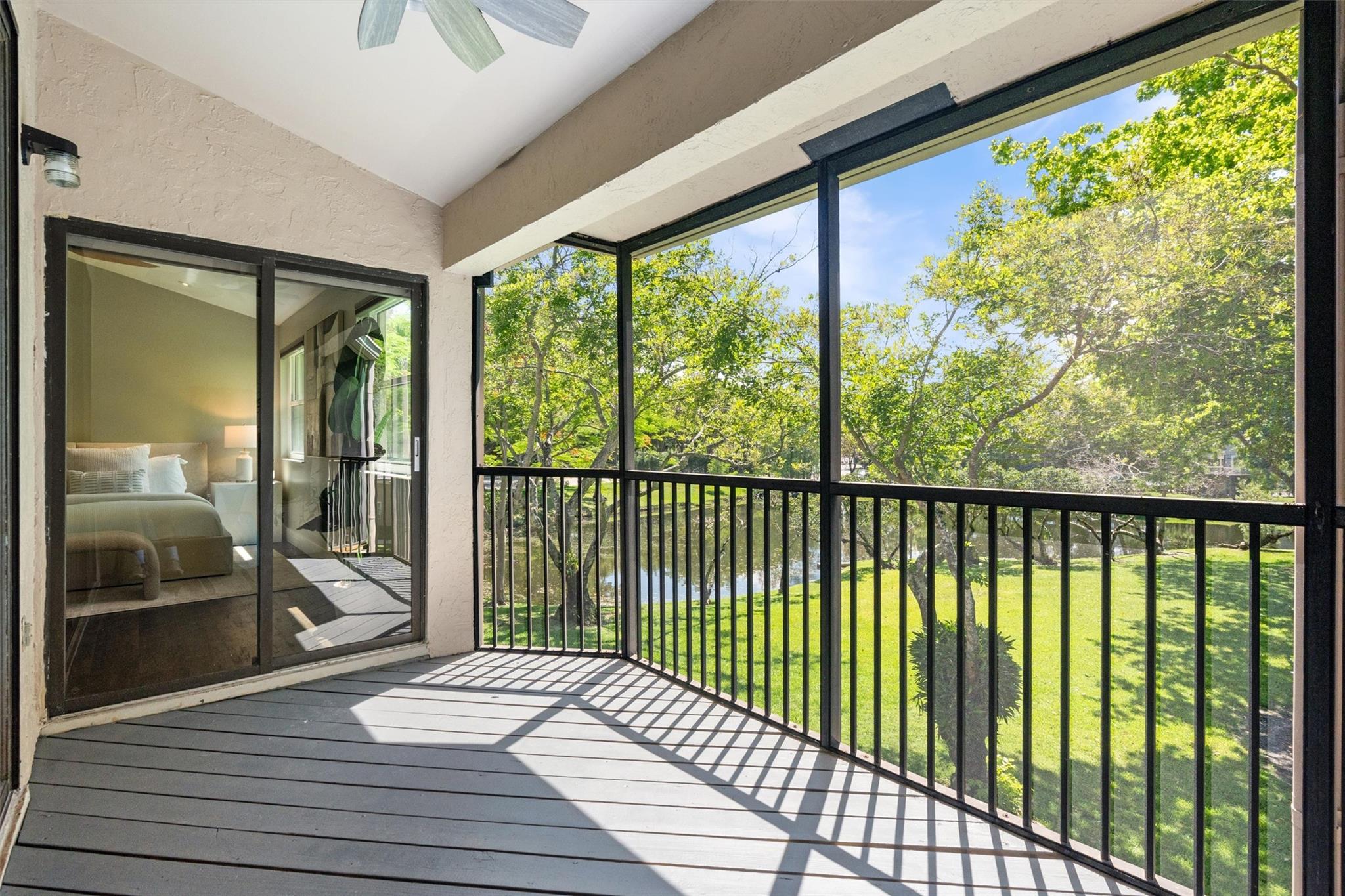 Welcome Home! You’re going to fall in love w/the open layout, cathedral ceilings & skylights which create a bright & airy flow throughout. Hunter Douglas blinds add a touch of class & ~YES~ those are 2 Big Ass Fans (literally!) offering both style & comfort. The bathrooms are generously sized & modern w/beautiful mirrors that elevate the design. Both bedrooms are comfortable in size & include closet built-ins for maximum storage. The primary suite features a stylish new barn door that opens to a beautiful spa-like bathroom & a walk-in closet. Enjoy the views of the lake & the lush, park-like grounds from the living area & primary bedroom. “Wine down” at the end of the day on your spacious screened-in patio ~ the perfect, serene place to relax. CHECK OUT THE VIDEO TOUR ABOVE!