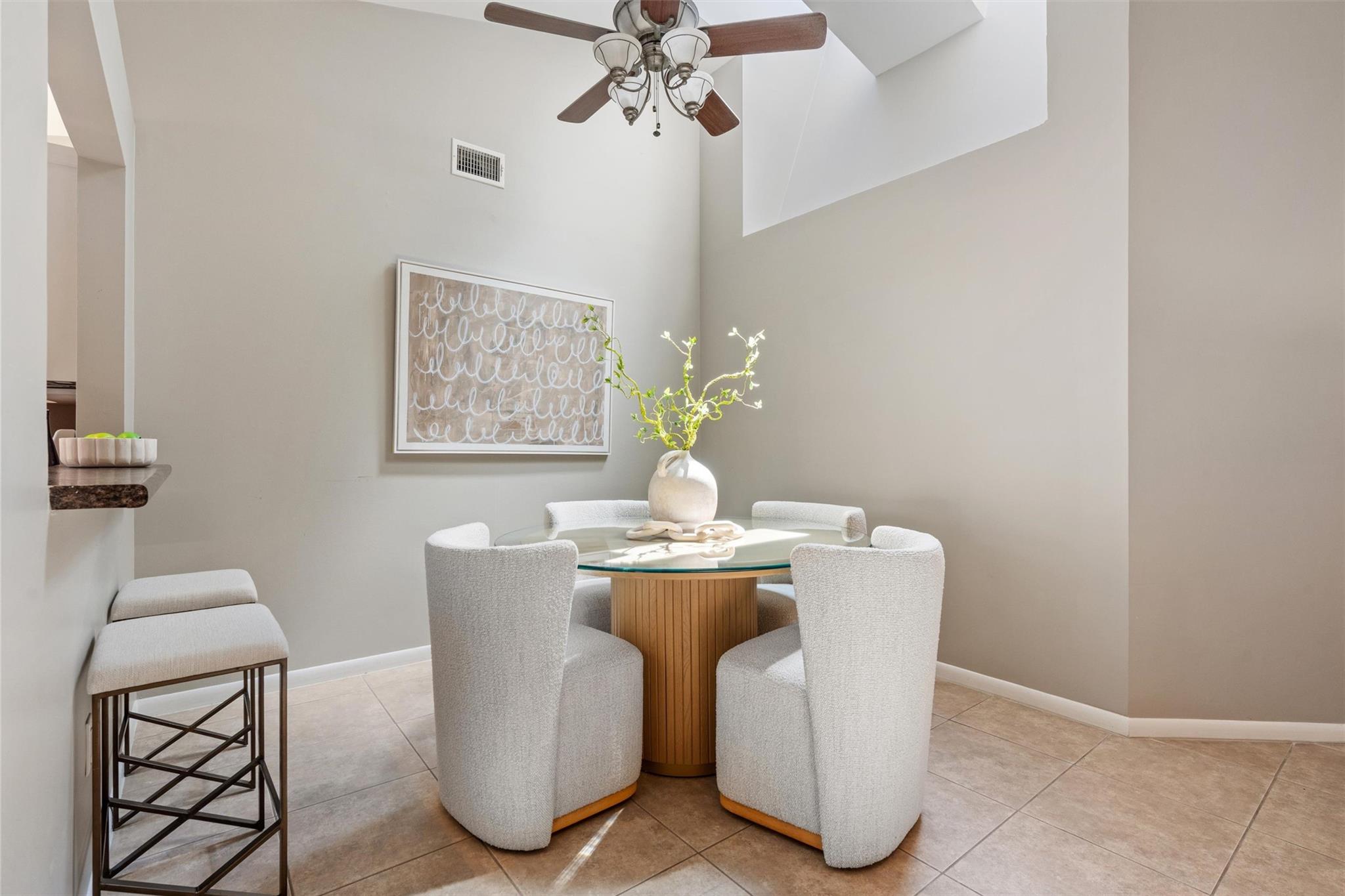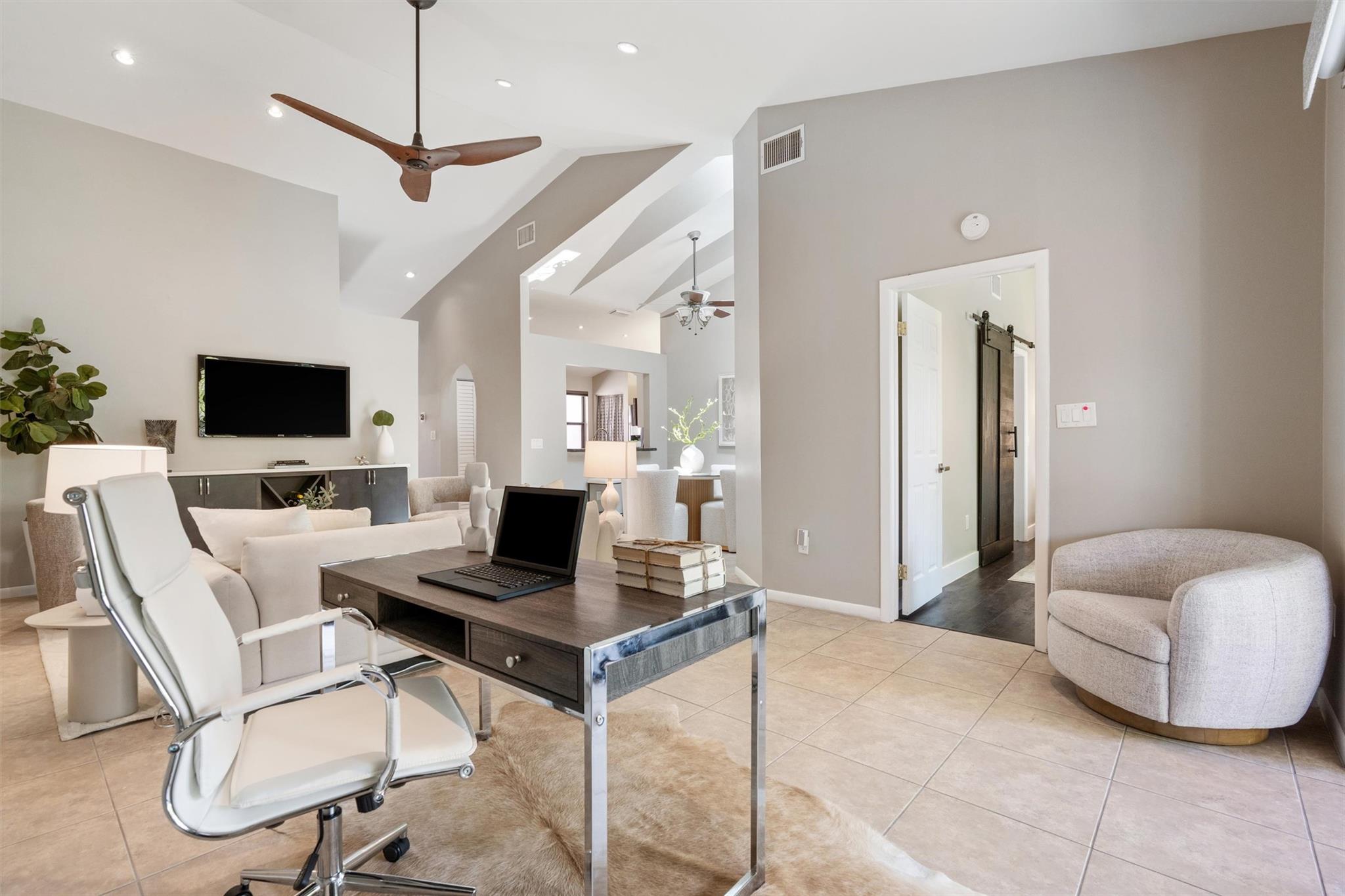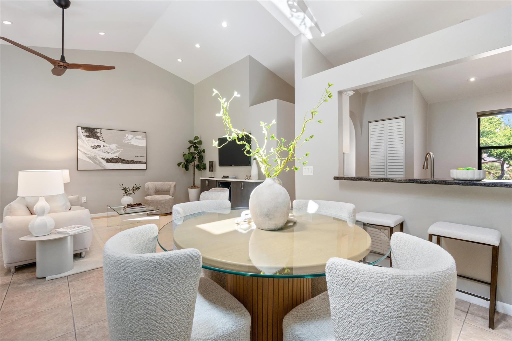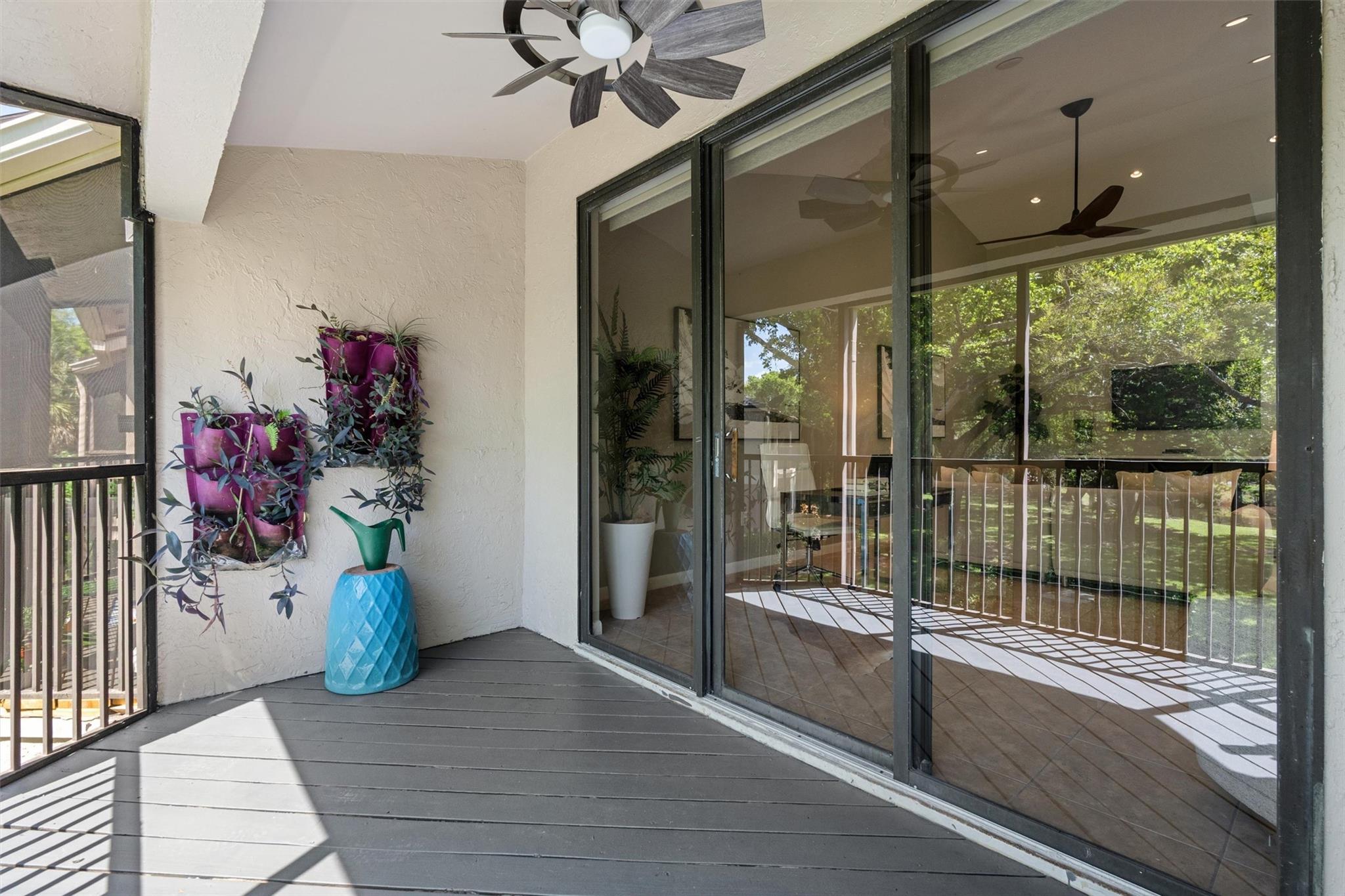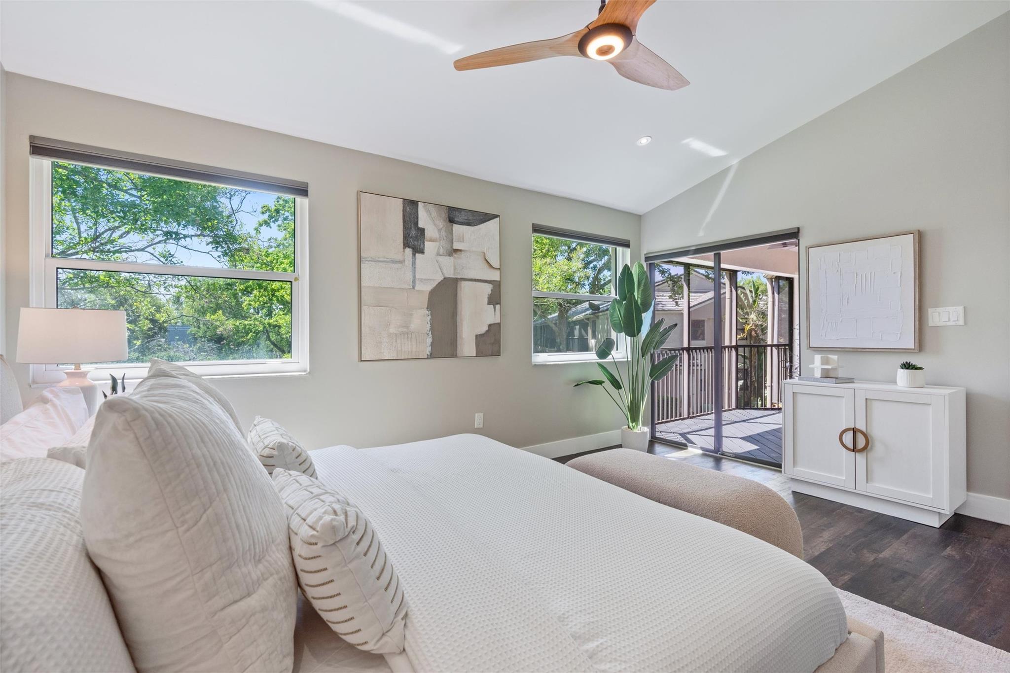 Welcome Home! You’re going to fall in love w/the open layout, cathedral ceilings & skylights which create a bright & airy flow throughout. Hunter Douglas blinds add a touch of class & ~YES~ those are 2 Big Ass Fans (literally!) offering both style & comfort. The bathrooms are generously sized & modern w/beautiful mirrors that elevate the design. Both bedrooms are comfortable in size & include closet built-ins for maximum storage. The primary suite features a stylish new barn door that opens to a beautiful spa-like bathroom & a walk-in closet. Enjoy the views of the lake & the lush, park-like grounds from the living area & primary bedroom. “Wine down” at the end of the day on your spacious screened-in patio ~ the perfect, serene place to relax. CHECK OUT THE VIDEO TOUR ABOVE!