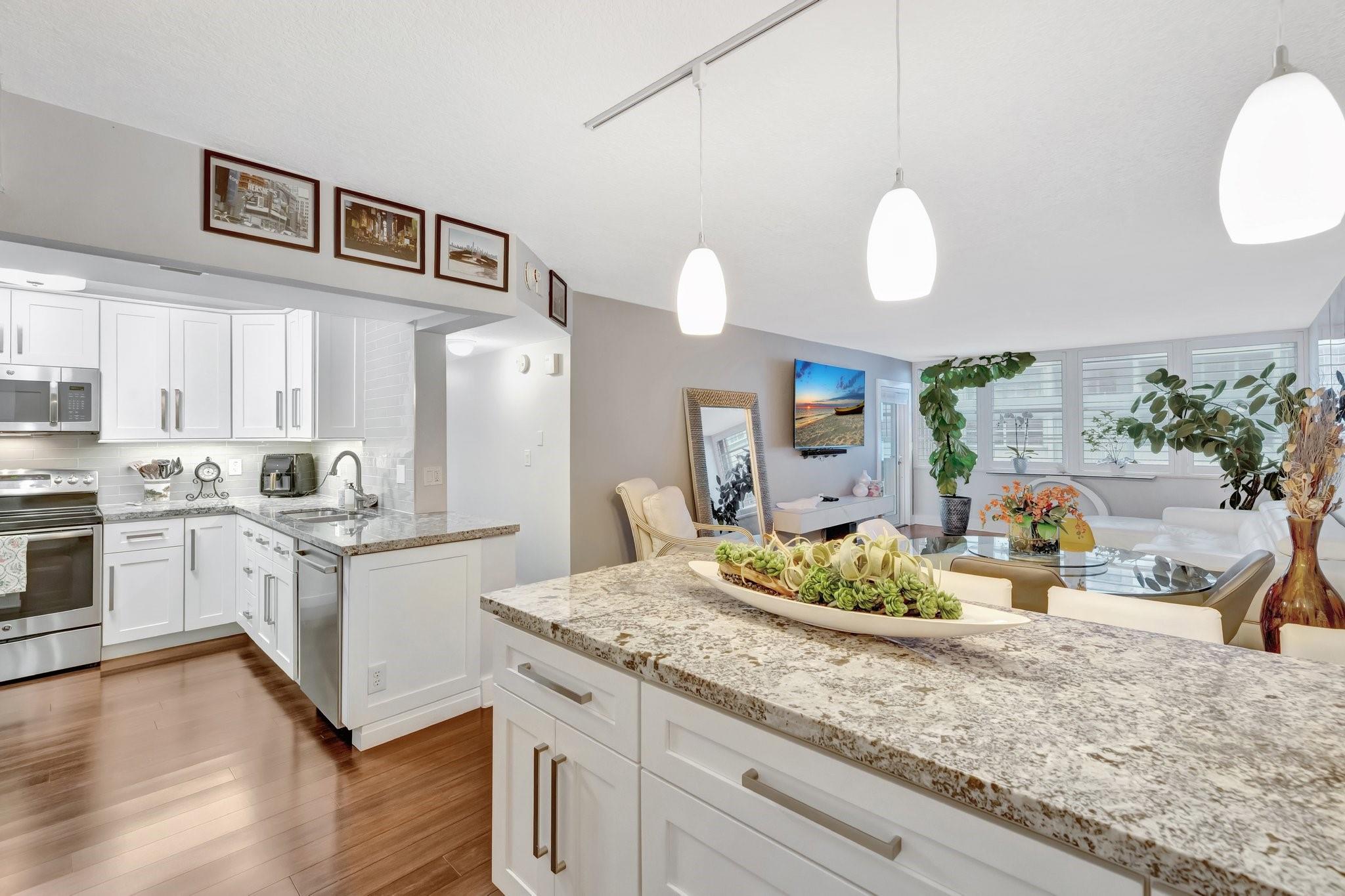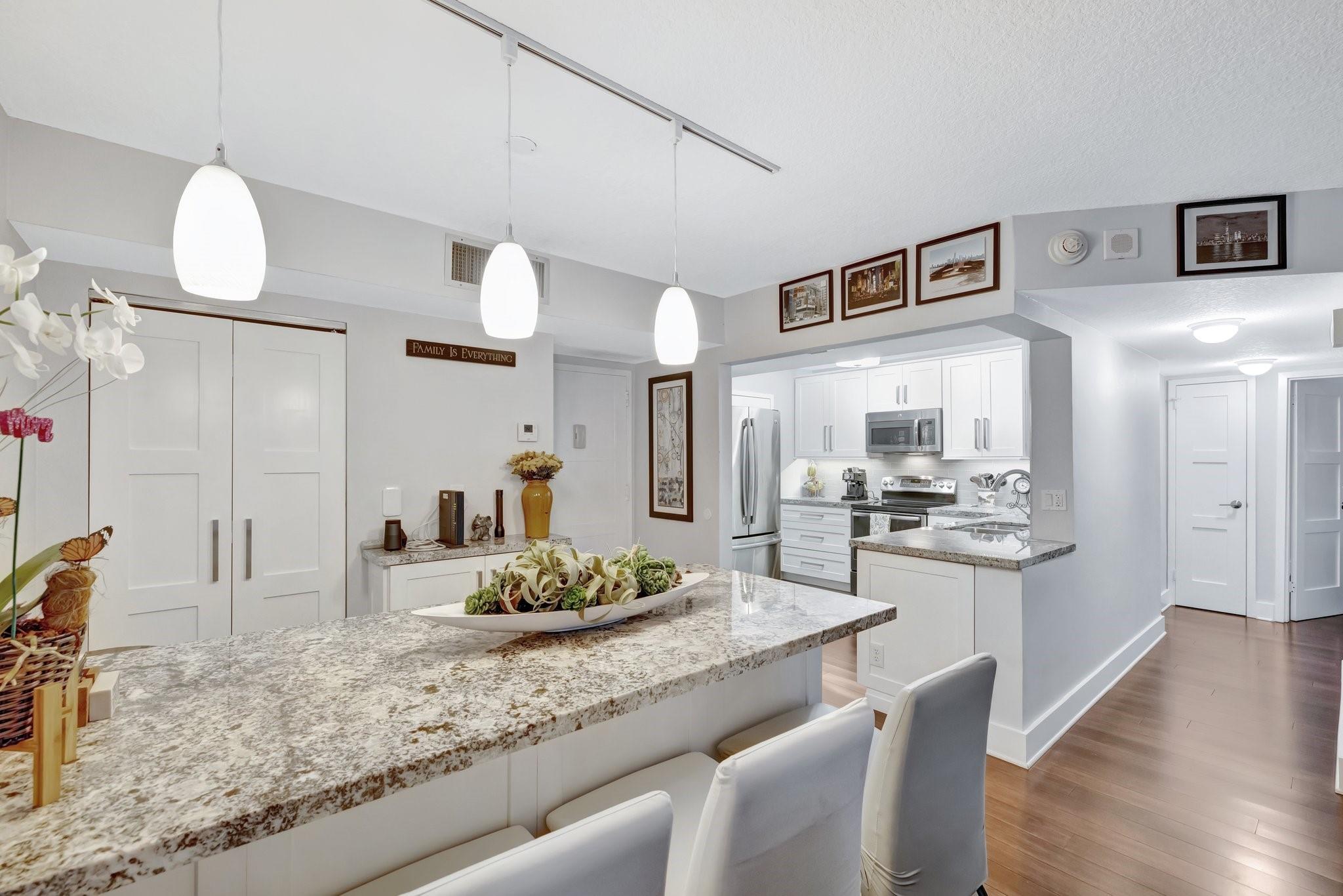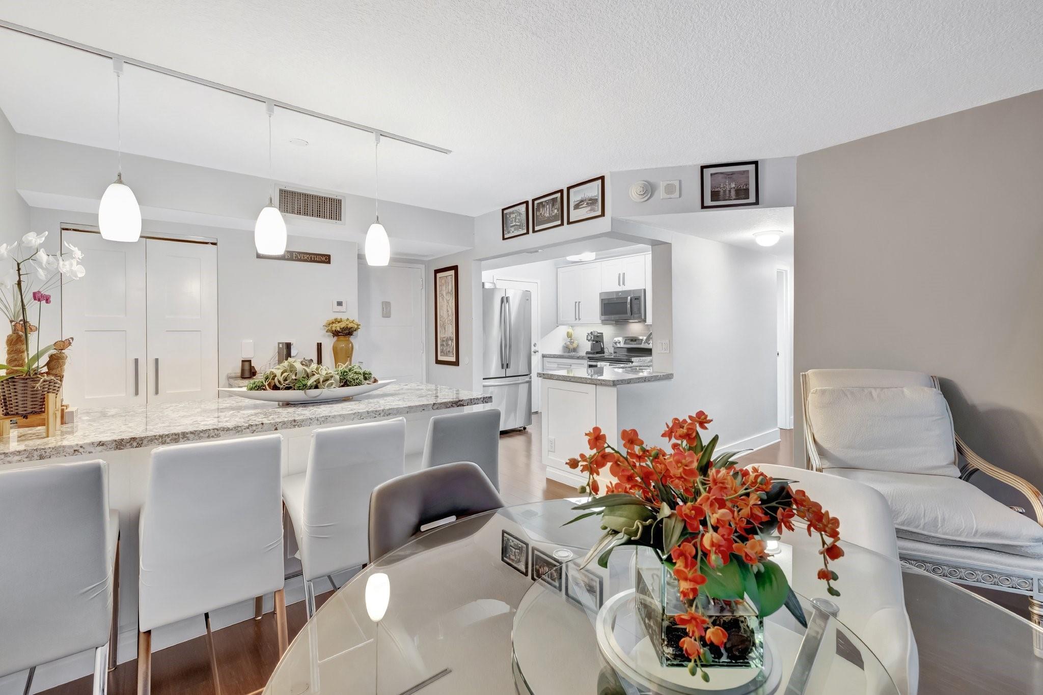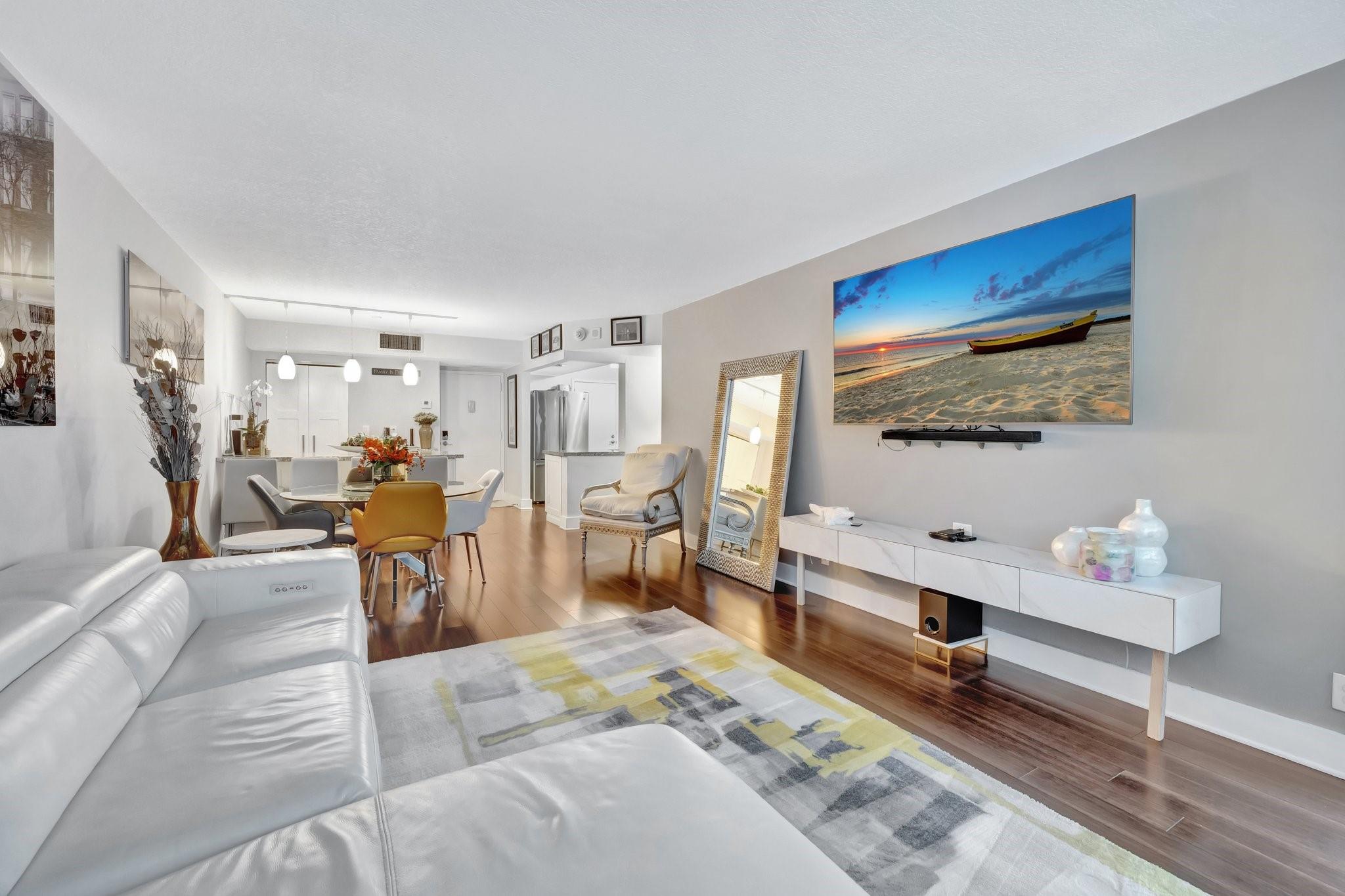 This impeccably maintained condo offers peace of mind and timeless appeal. Gleaming bamboo floors flow throughout the space, creating a warm, natural vibe. Expansive balcony invites you to unwind with morning coffee or evening cocktails while soaking in the breeze. Sunlight pours in through impact windows adorned with elegant Plantation Shutters. A modern open kitchen with bar seating seamlessly connected to living area for entertaining ease. Bedrooms provide generous space and natural light. Amenities include heated pool, sun-deck lounging areas with water views, fully equipped gym, sauna, 24 hour security, boat dockage when available. Whether you're entertaining or escaping, this condo offers the perfect blend of laid-back luxury and everyday convenience. Short distance to the beach.