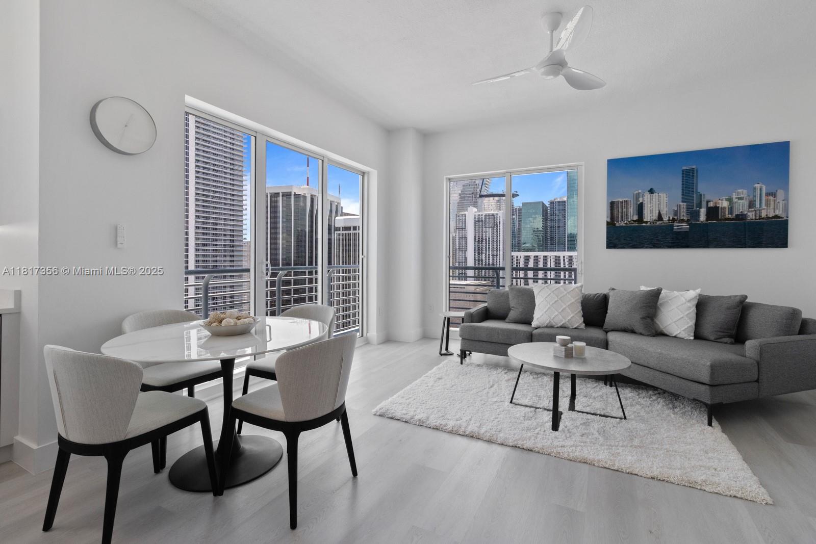 BEST PRICE! For this Exquisite residence renovated to perfection! High floor, Corner exposure with views of the bay. Floor plan consists of two private bedrooms, a living room anchored by two large sliding glass doors that enhances the home with lots of Natural Light. Once the sun goes down, the lights come on! Features include high ceilings, open kitchen, spacious baths, washer and dryer. Enjoy this completely renovated residence from kitchen to baths, all appliances and modern furnishings including a new A/C Unit! Building offers 24hrs front desk attendant, secured entry, rec room w/pool table, rooftop pool, rooftop gym w/locker room & sauna, lap pool in a serene setting, & more. Walk to the Arena, Bayside, Theaters, Museums, Brickell, & 7 miles to So Beach! COME VIEW TODAY!