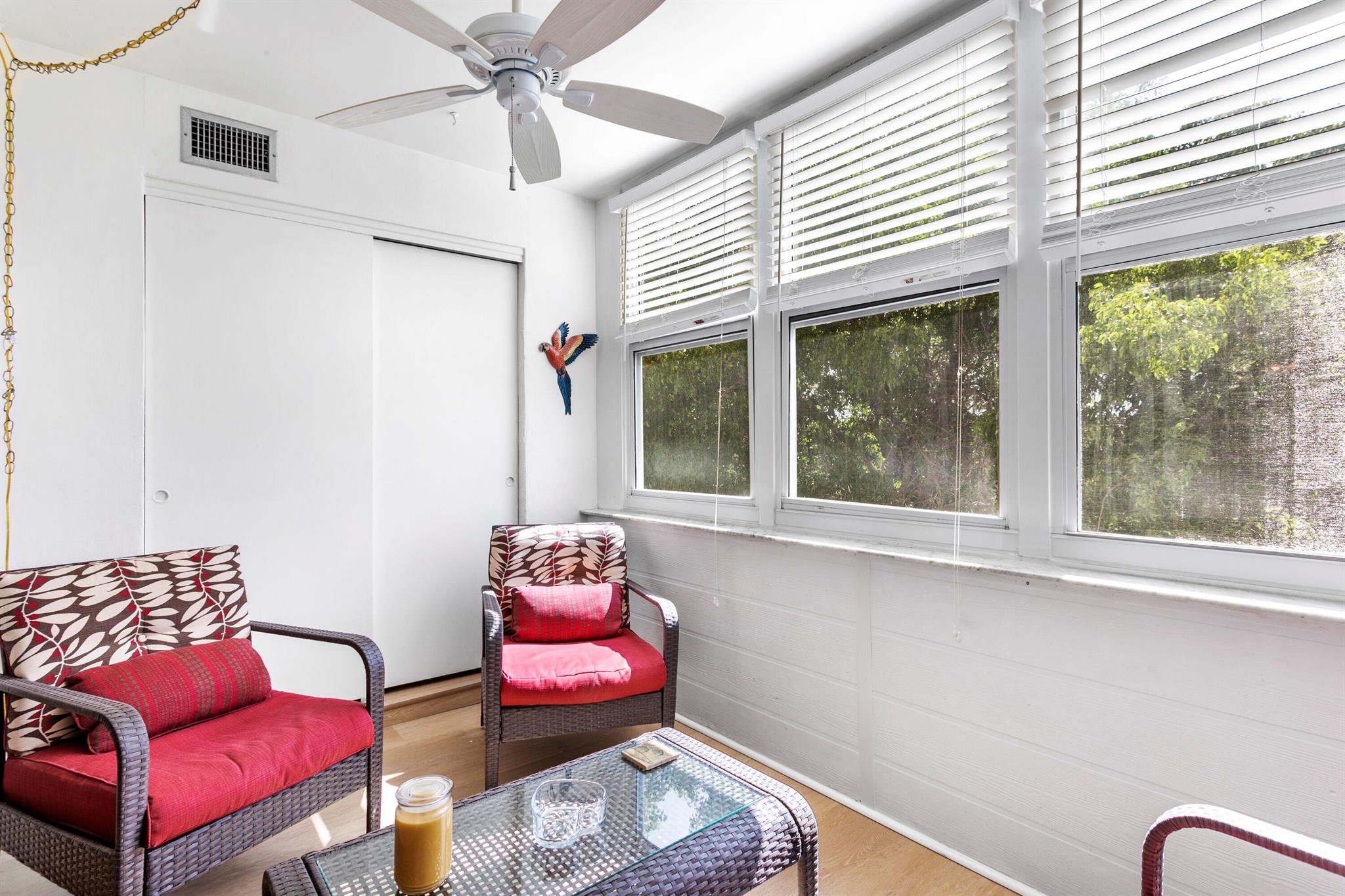 Move-in ready 2-bed, 2-bath condo near the beach! This turnkey home features hurricane windows, wood flooring throughout, and fresh carpet in the bedrooms. The spacious living area includes an extended sitting room and dining space, while the fully equipped kitchen has all the essentials. The primary bedroom boasts two closets, including a walk-in, with a step-in shower in its en-suite bath. The guest bedroom also has a walk-in closet, and the guest bath includes a tub. Newer AC and water heater. Located in an active adult community with pools, tennis/pickleball, a clubhouse, fitness center, movie night, theater and more! Monthly fee includes basic cable, water, sewer, trash removal and exterior insurance.