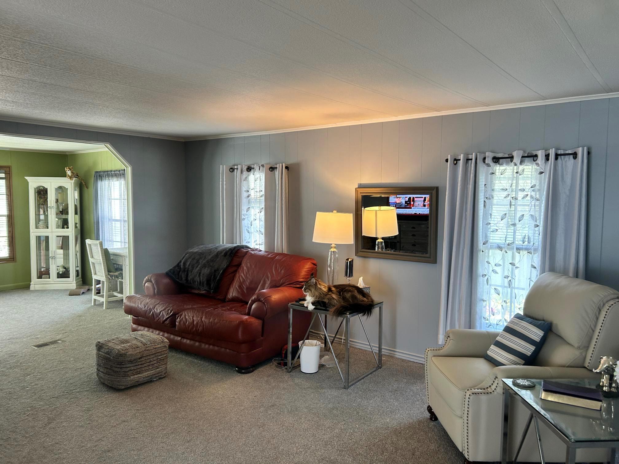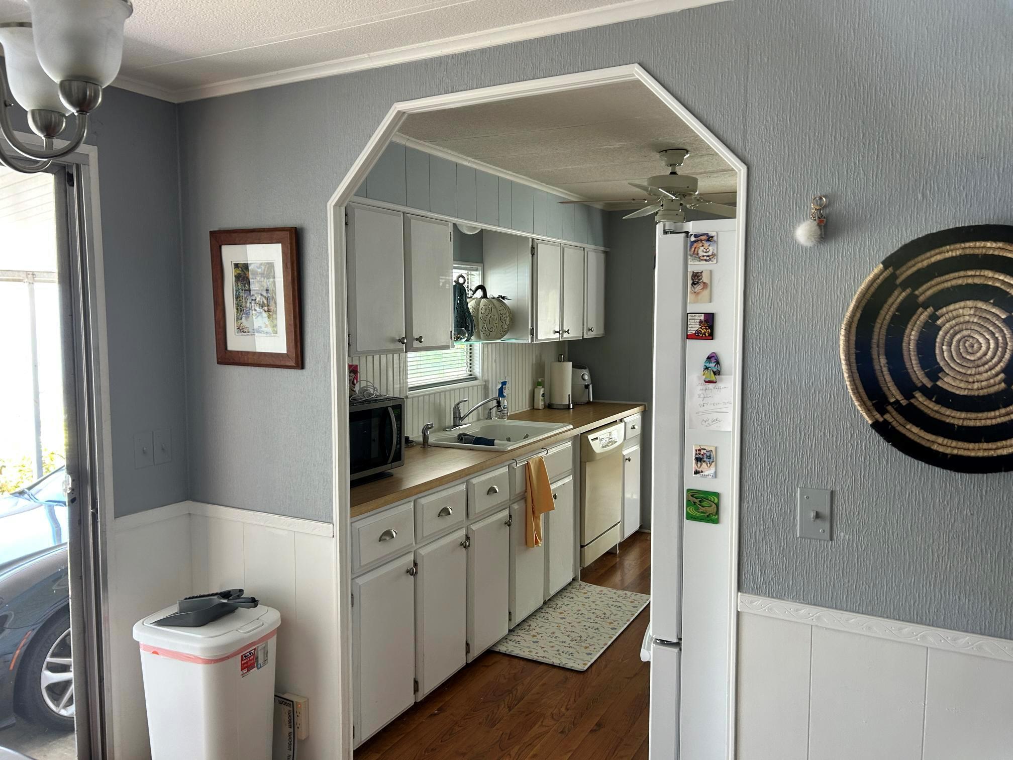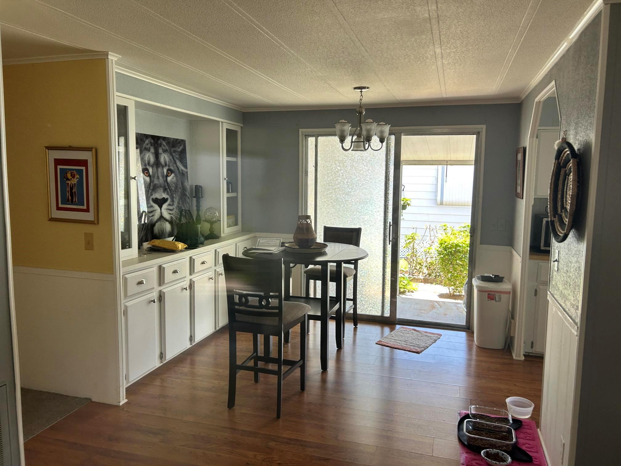 Spacious & Stylish 2 Bed, 2 Bath Home in Premier 55+ Community - Must See!Welcome to this large, tastefully furnished 2 bedroom, 2 bath home ideally situated near the front of the community for easy access. Enjoy not one but two inviting living areas perfect for relaxing or entertaining, plus a formal dining room with built-in cabinetry for added charm and storage.The expansive master suite features an enormous walk-in closet and serene views of the pond from both the bedroom and back patio. The well-designed galley kitchen includes a built-in wet bar, perfect for hosting guests.Stylish laminate flooring runs through the entry, kitchen, and dining areas, while cozy carpet adds warmth to the living room and bedrooms. Recent updates include a newer metal roof and newer AC unit,