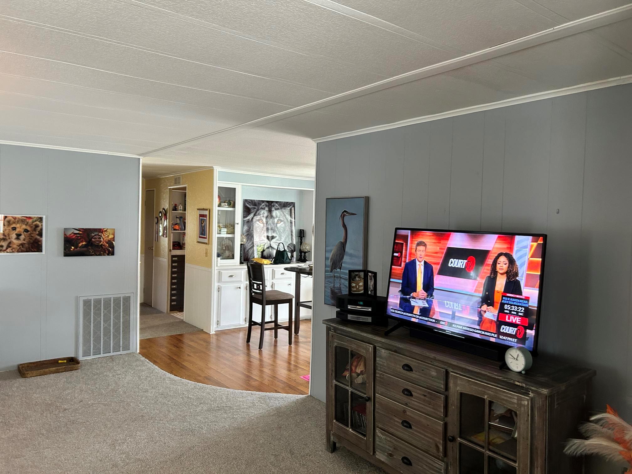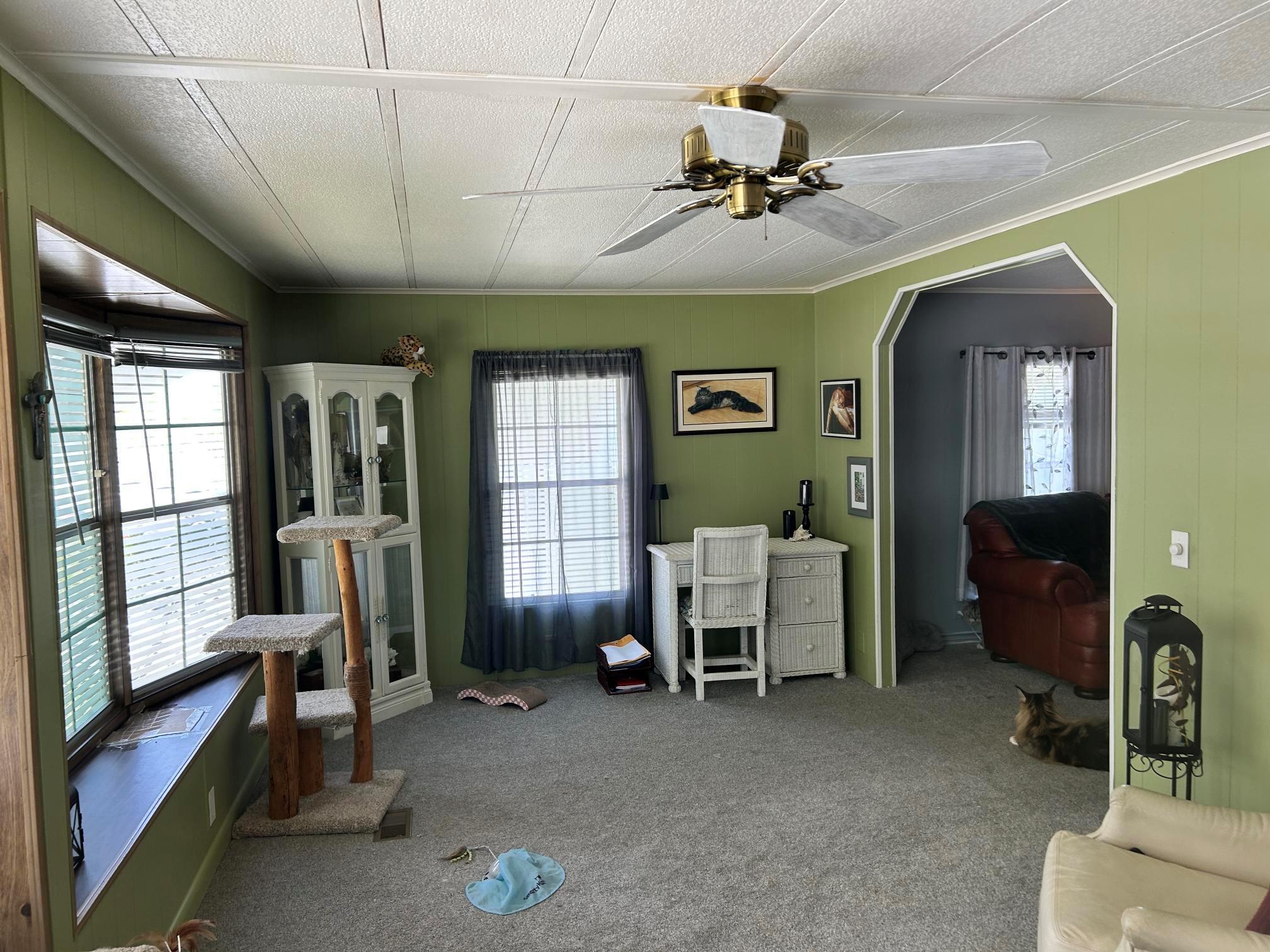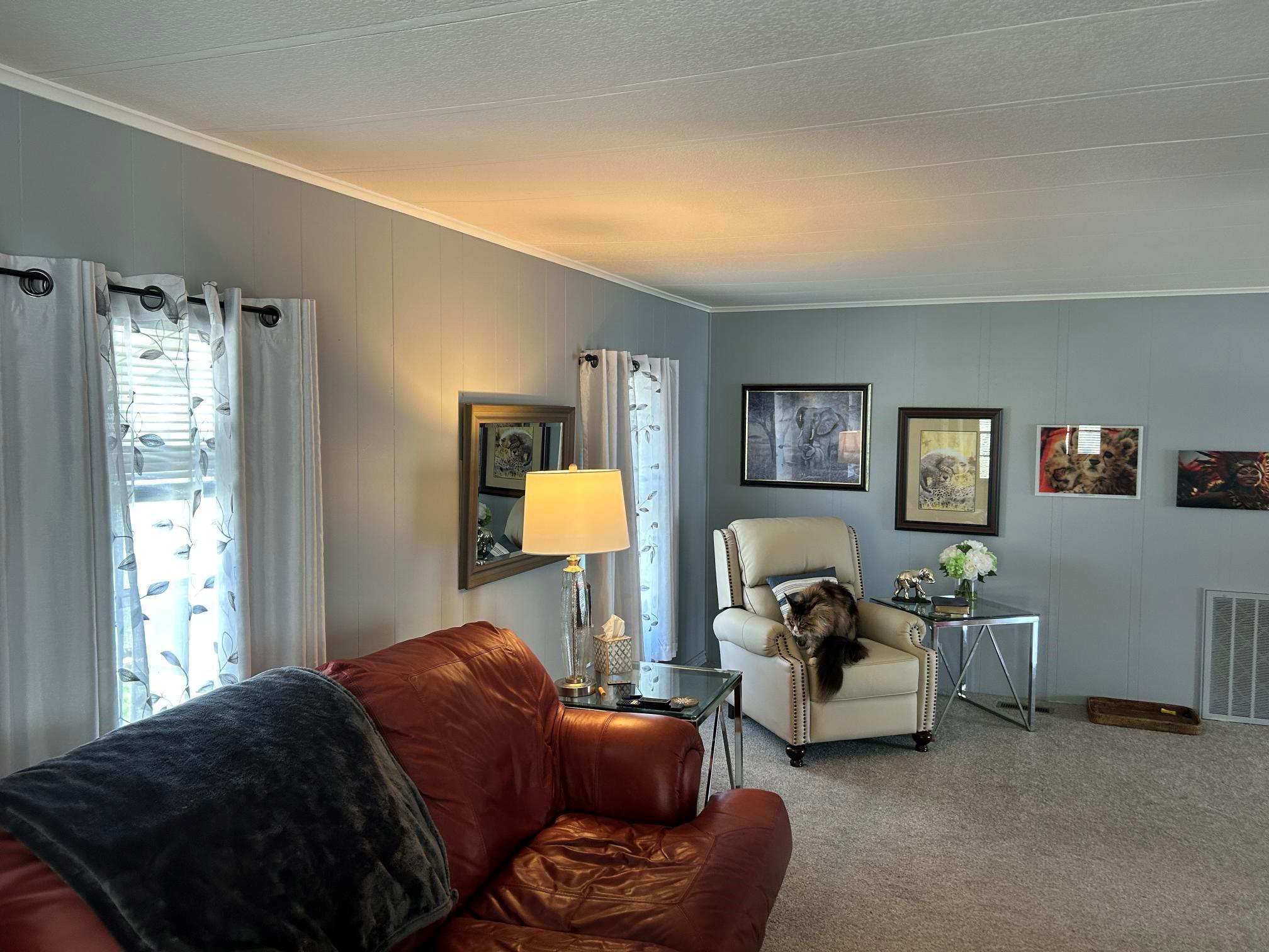 Spacious & Stylish 2 Bed, 2 Bath Home in Premier 55+ Community - Must See!Welcome to this large, tastefully furnished 2 bedroom, 2 bath home ideally situated near the front of the community for easy access. Enjoy not one but two inviting living areas perfect for relaxing or entertaining, plus a formal dining room with built-in cabinetry for added charm and storage.The expansive master suite features an enormous walk-in closet and serene views of the pond from both the bedroom and back patio. The well-designed galley kitchen includes a built-in wet bar, perfect for hosting guests.Stylish laminate flooring runs through the entry, kitchen, and dining areas, while cozy carpet adds warmth to the living room and bedrooms. Recent updates include a newer metal roof and newer AC unit,