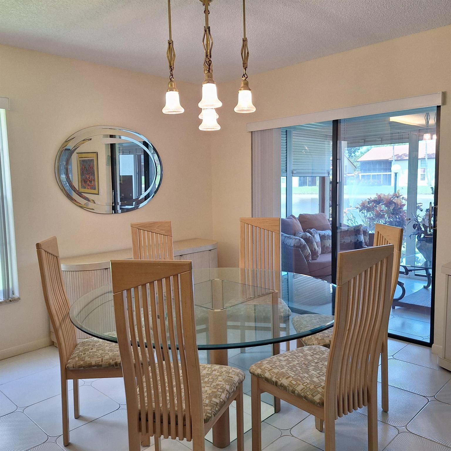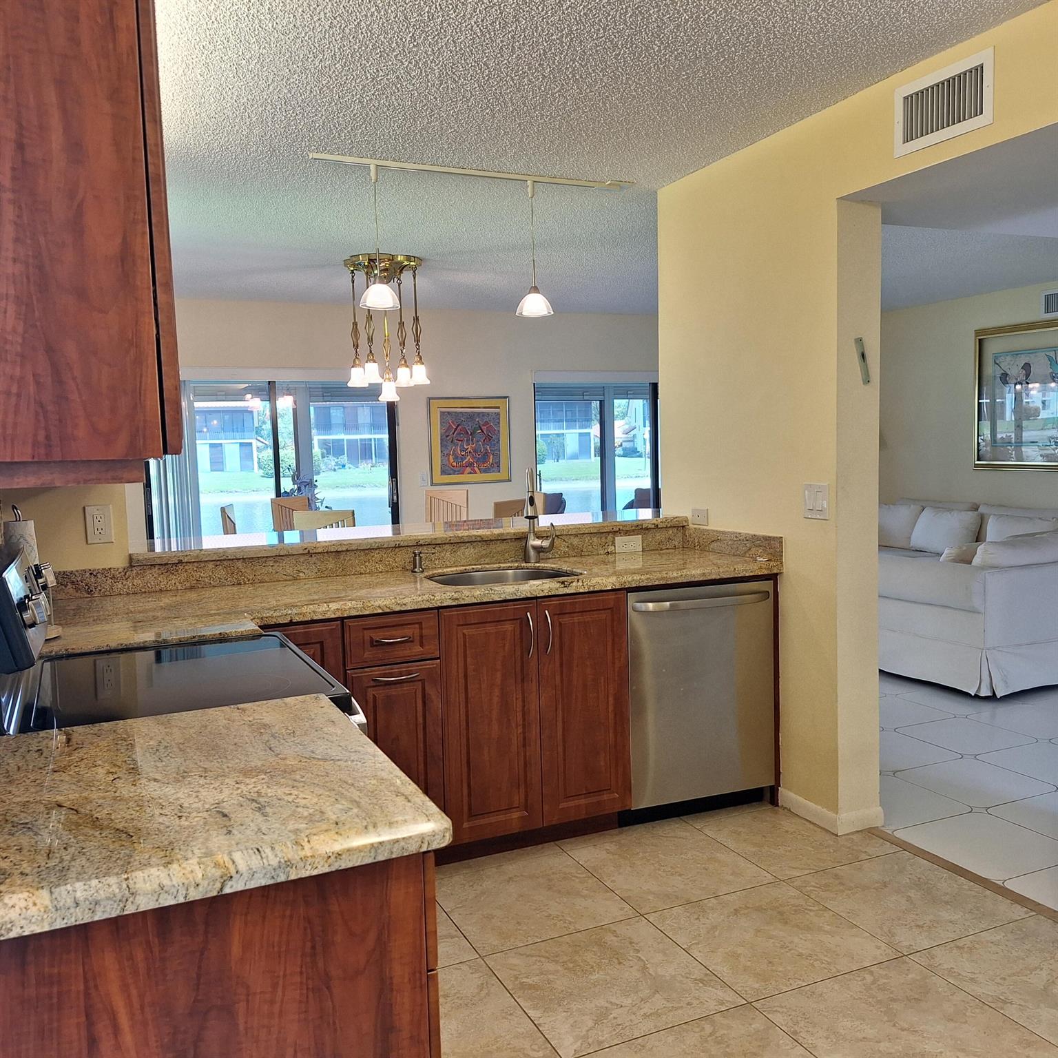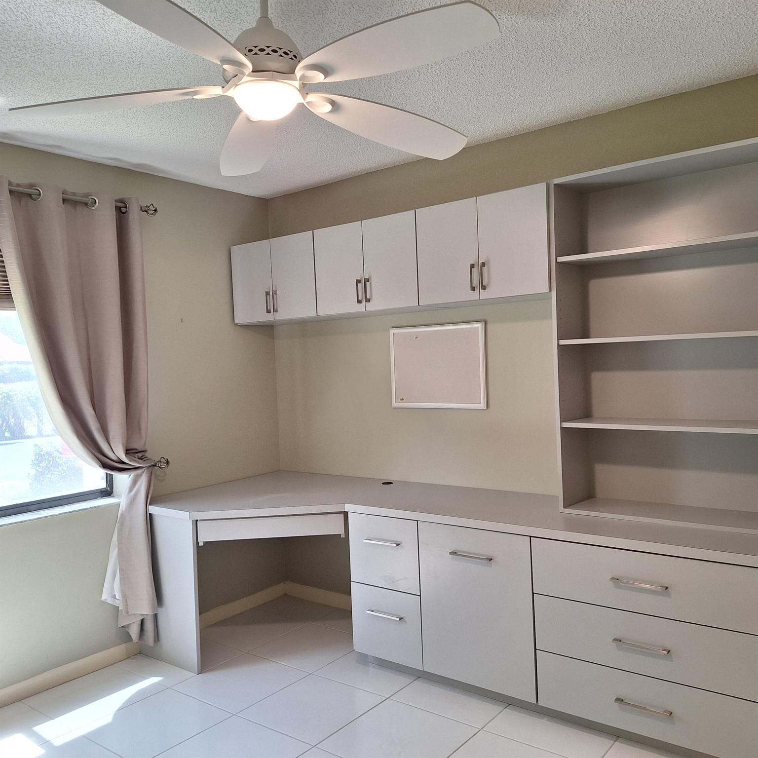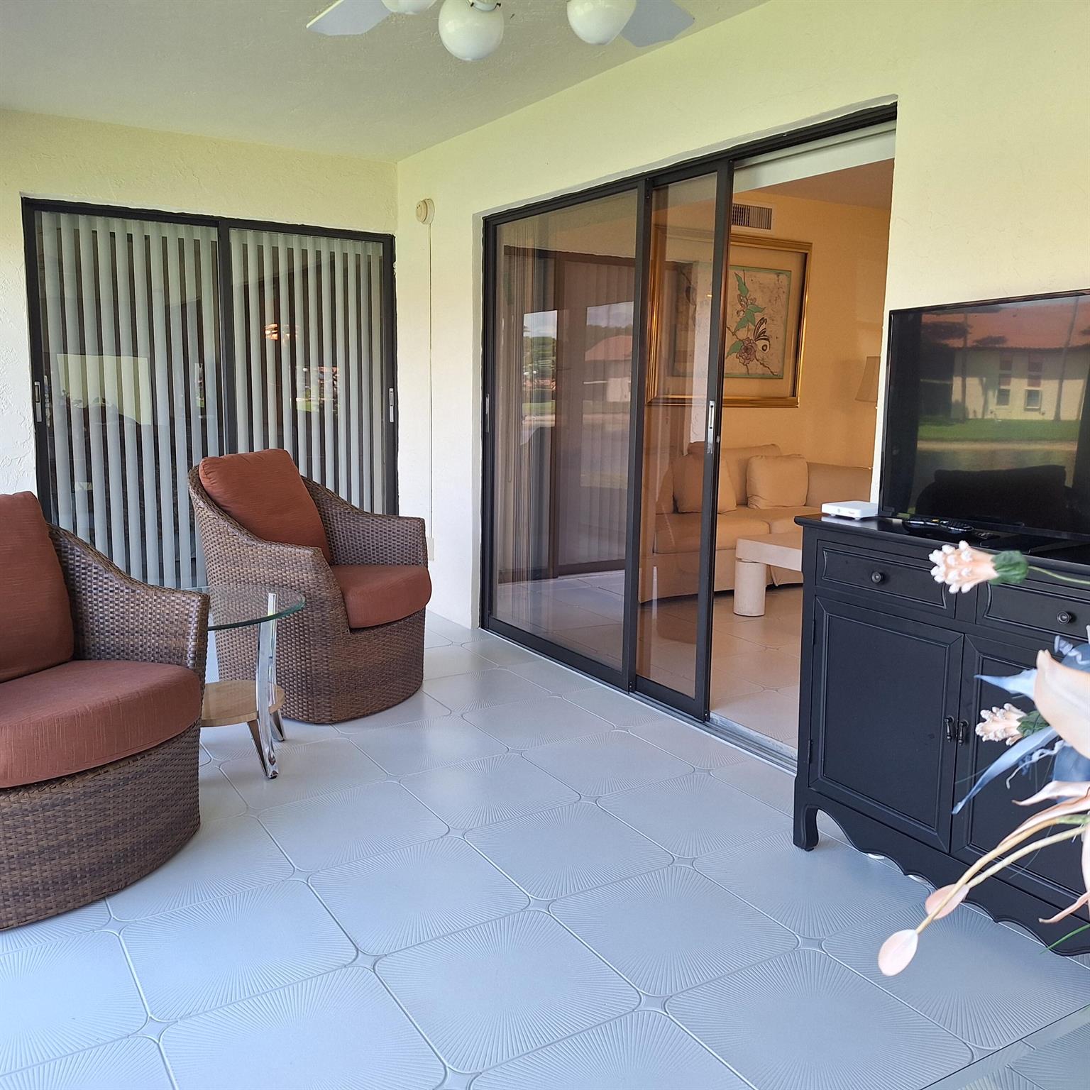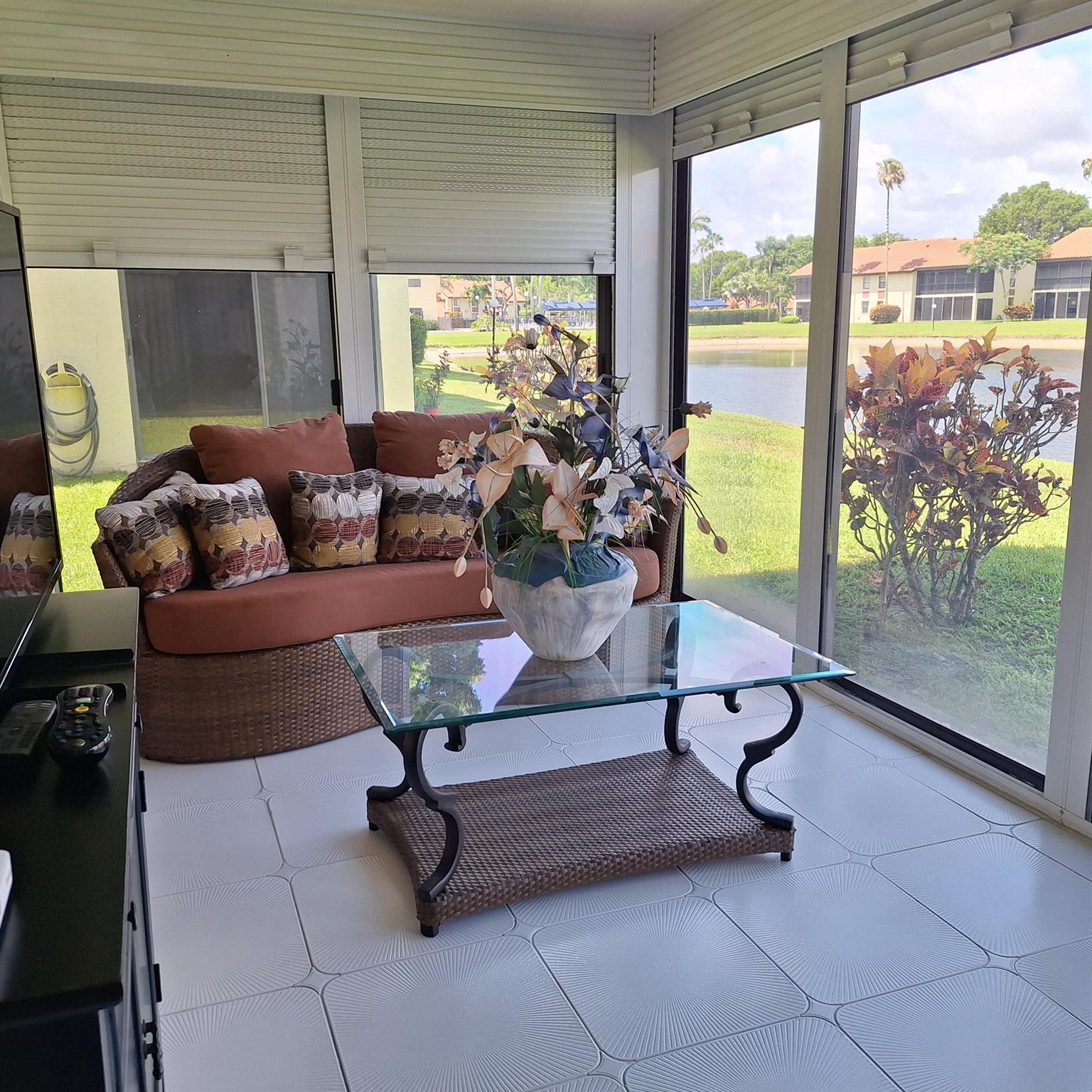 Reduced - bring your offer!! Bright, spacious, ground floor quad in sought after Palm Chase Lakes. The open great room showcases the stunning renovations from top to bottom. Starting with granite counters and stainless steel appliances in the kitchen and including the beautifully finished bathrooms, California closets, built-ins, crown molding, fans and so much more! Two bedrooms plus a den that can be readily converted to a third bedroom or office. Relax in the closed-in lanai overlooking a calming water view. Walking distance to houses of worship. Come join all the activities in this 55+ community!