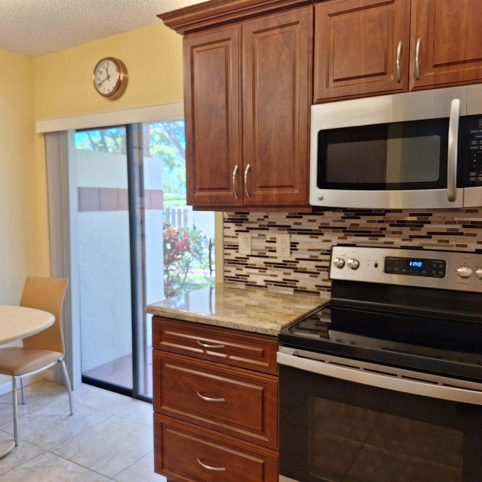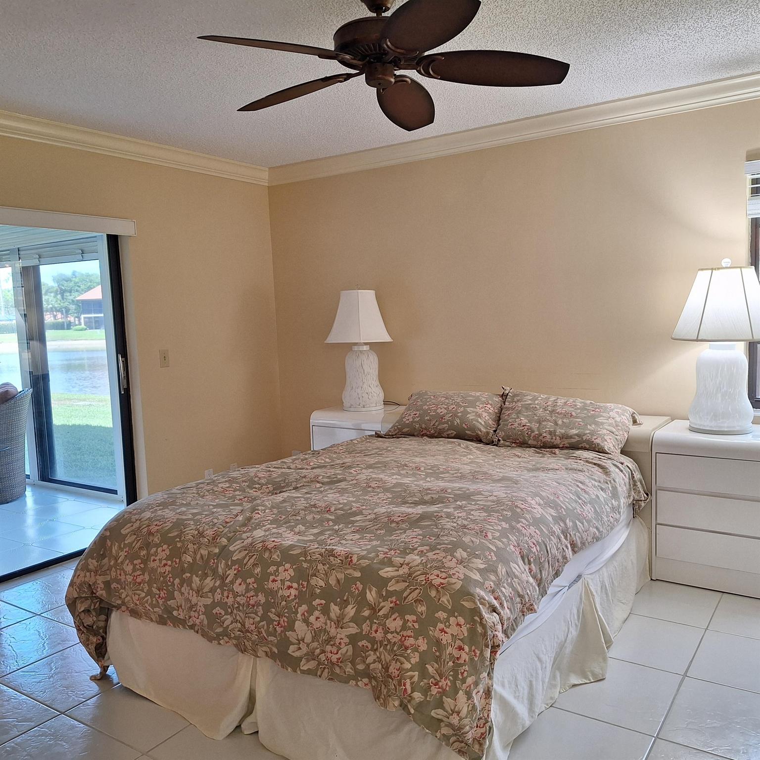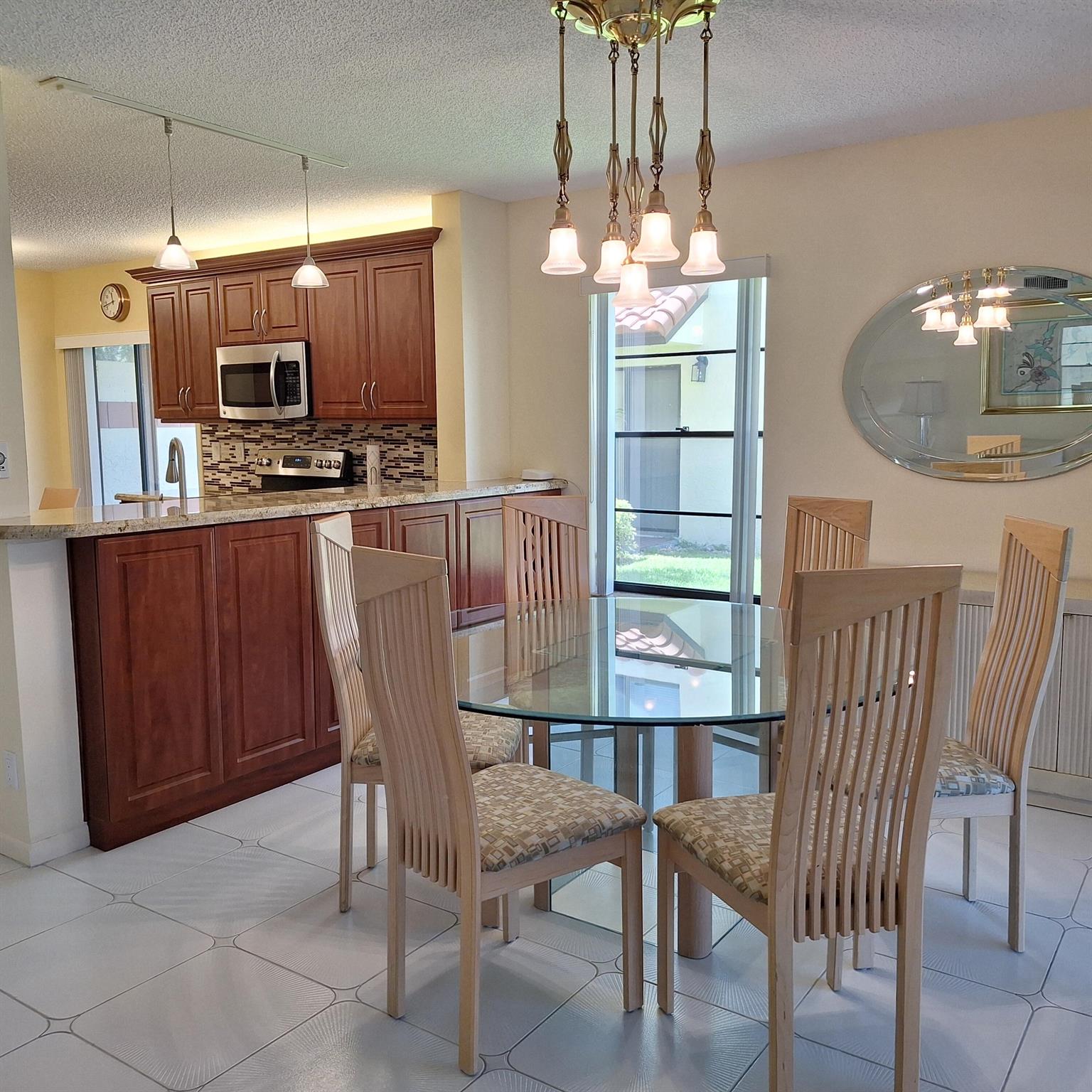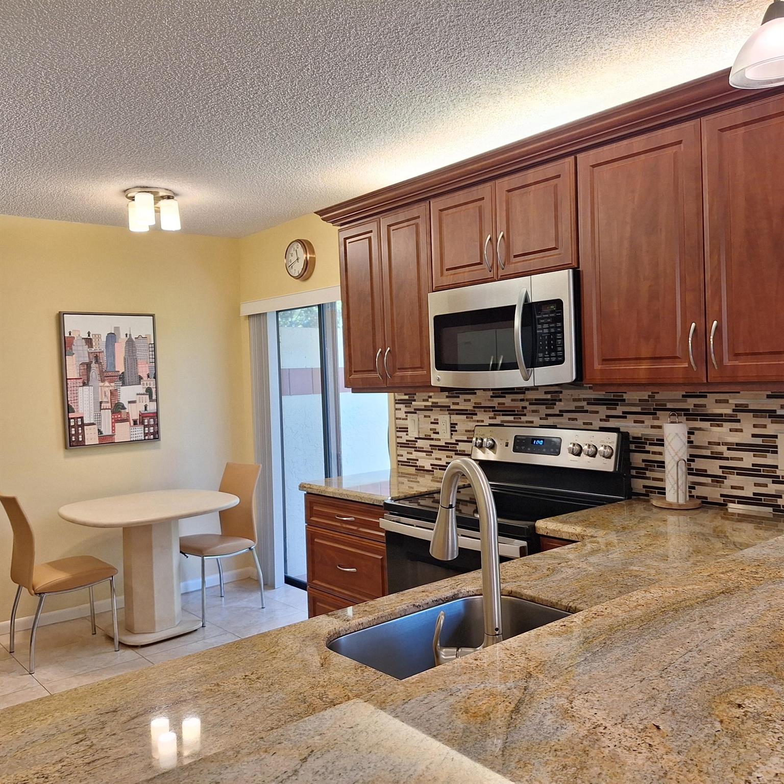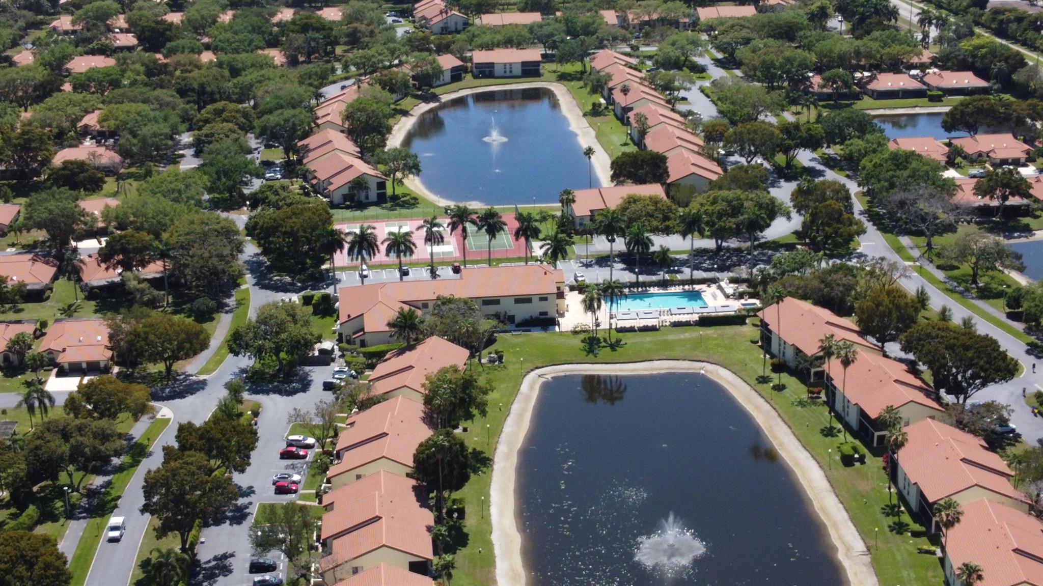 Reduced - bring your offer!! Bright, spacious, ground floor quad in sought after Palm Chase Lakes. The open great room showcases the stunning renovations from top to bottom. Starting with granite counters and stainless steel appliances in the kitchen and including the beautifully finished bathrooms, California closets, built-ins, crown molding, fans and so much more! Two bedrooms plus a den that can be readily converted to a third bedroom or office. Relax in the closed-in lanai overlooking a calming water view. Walking distance to houses of worship. Come join all the activities in this 55+ community!