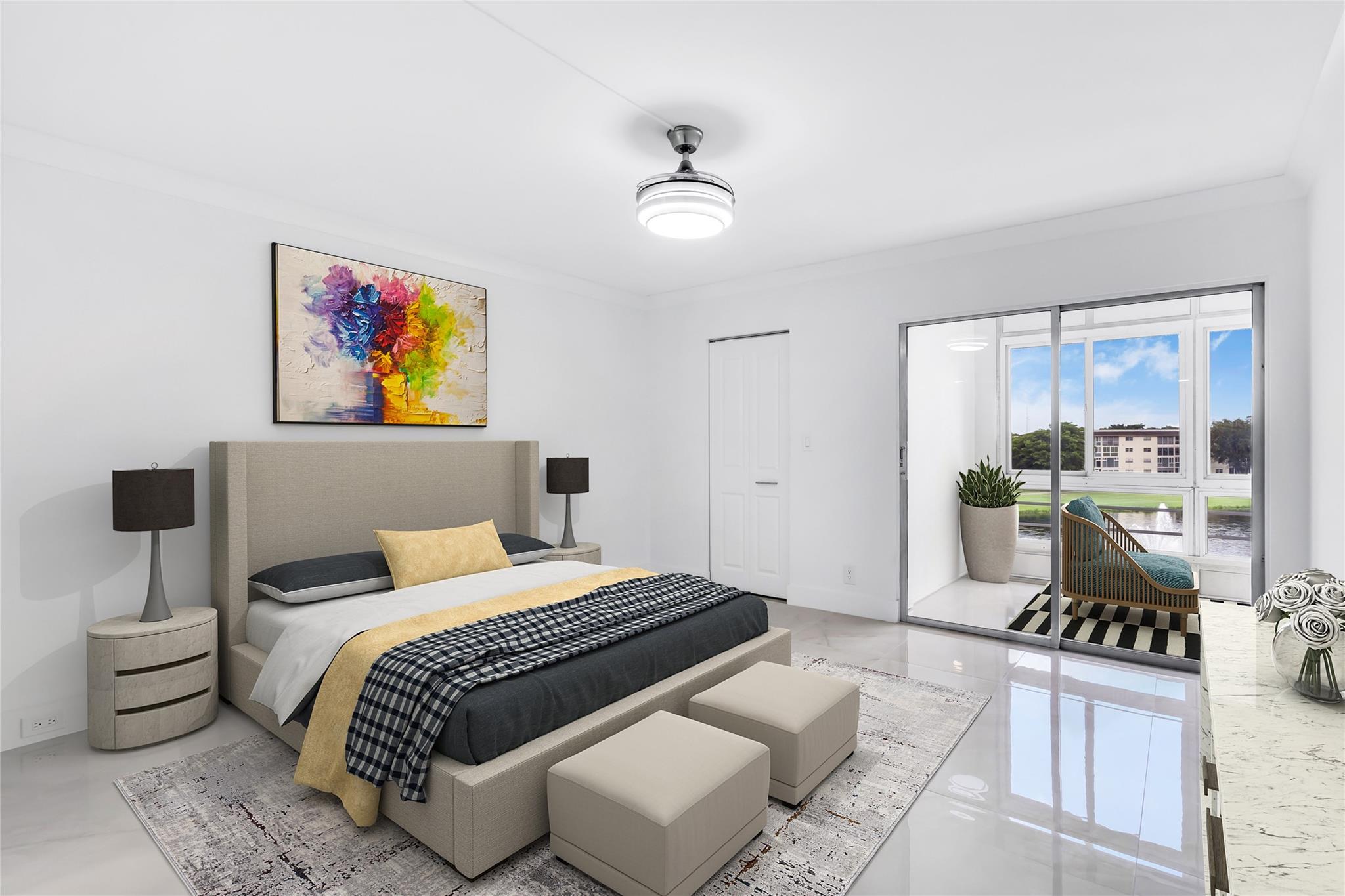REDUCED "Welcome to Paradise" – Stunning Lake View Condo in Portofino Experience luxury living in this exquisitely remodeled 2-bedroom, 2-bathroom residence featuring breathtaking lake views. The open-concept kitchen is a chef’s dream, showcasing sleek quartz countertops with a waterfall edge, modern cabinetry, and high-end finishes. Both bathrooms have been thoughtfully updated with luxury details, creating a spa-like atmosphere. Elegant 24"x48" crema rectified porcelain floors run throughout the unit, complemented by LED high-hat lighting for a bright, contemporary feel. Enjoy serene moments on the screened-in terrace, perfectly positioned to capture sparkling water views. This is more than a home—it's a lifestyle, including, Golf, Pickleball, Live theater, Restaurant and much move