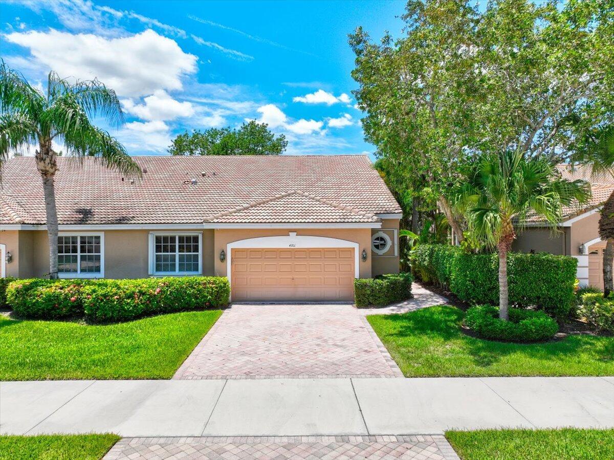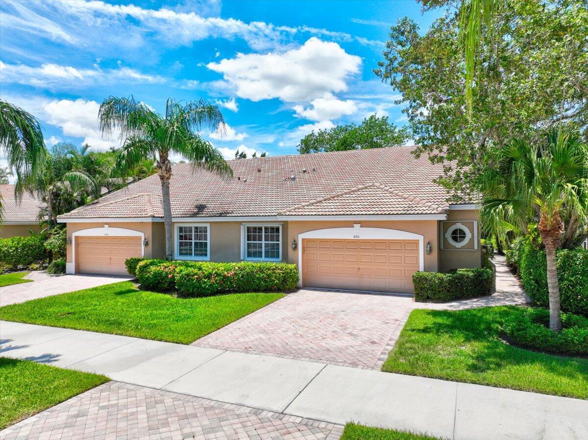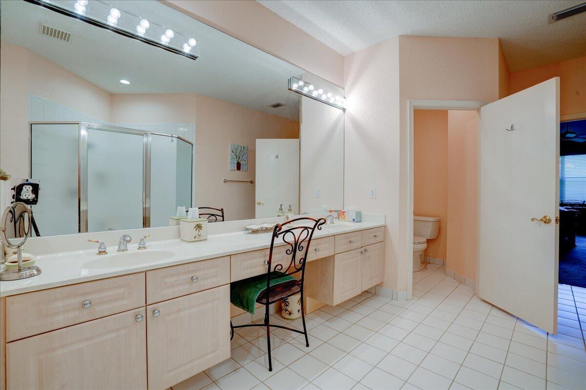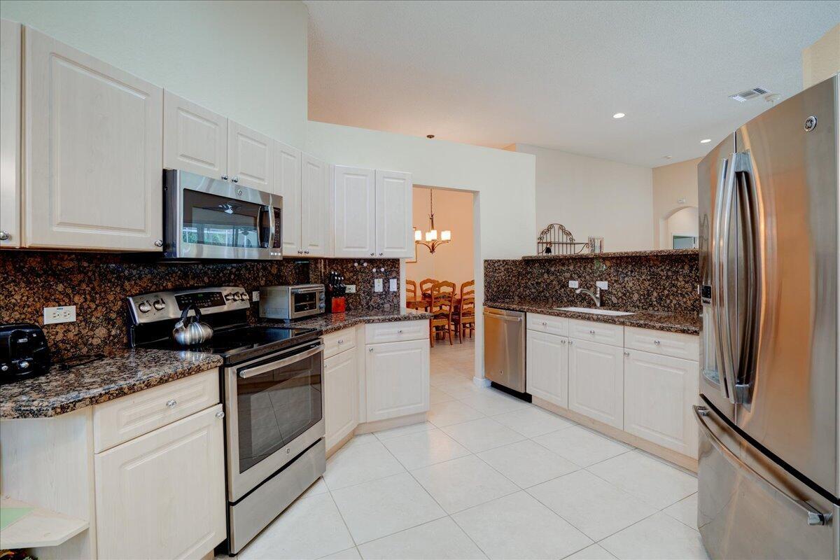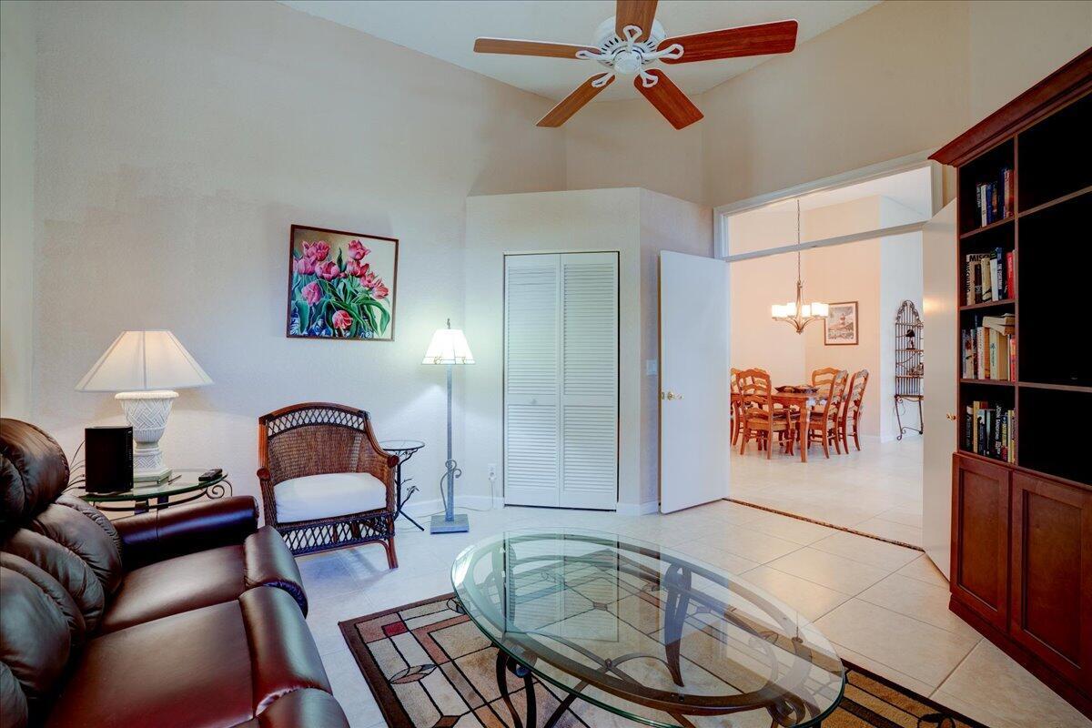 Located in the Cambridge neighborhood, this 2-bedroom + den home offers over 2,000 sq ft of living space and flexible design. The den can easily be converted into a third bedroom or home office. Features include an oversized garage with space for a golf cart, a large screened patio, and a bright great room layout with a separate dining area. The spacious kitchen includes a breakfast nook and updated appliances. The primary suite boasts two walk-in closets, dual sinks, and a separate tub and shower. Additional highlights include an interior laundry room with sink, accordion shutters, and energy-efficient southern exposure.