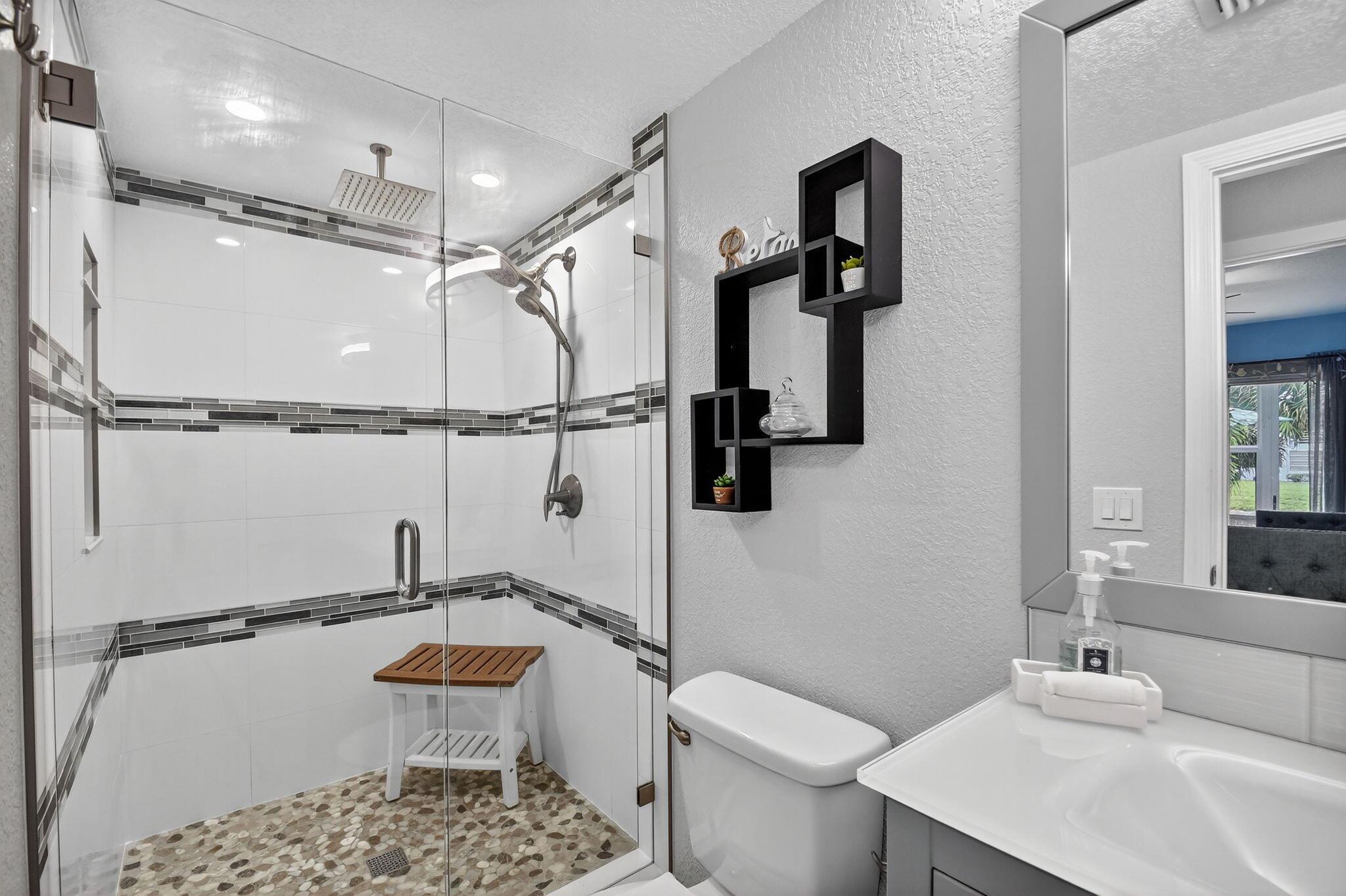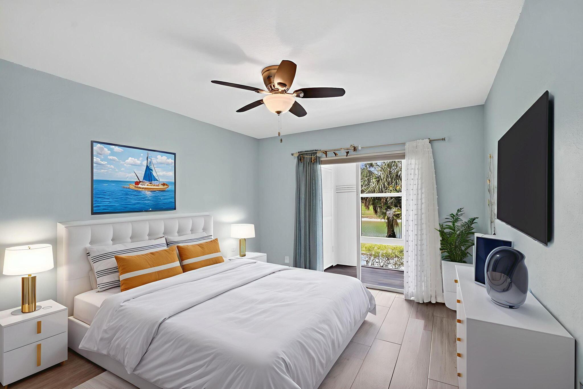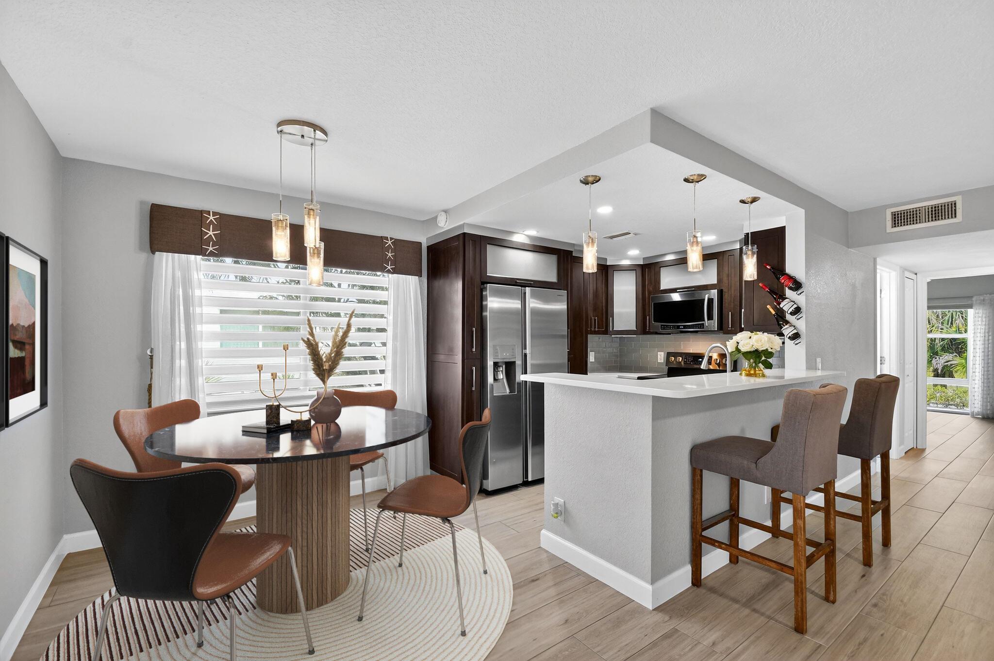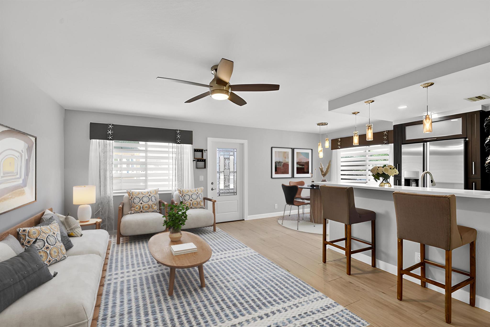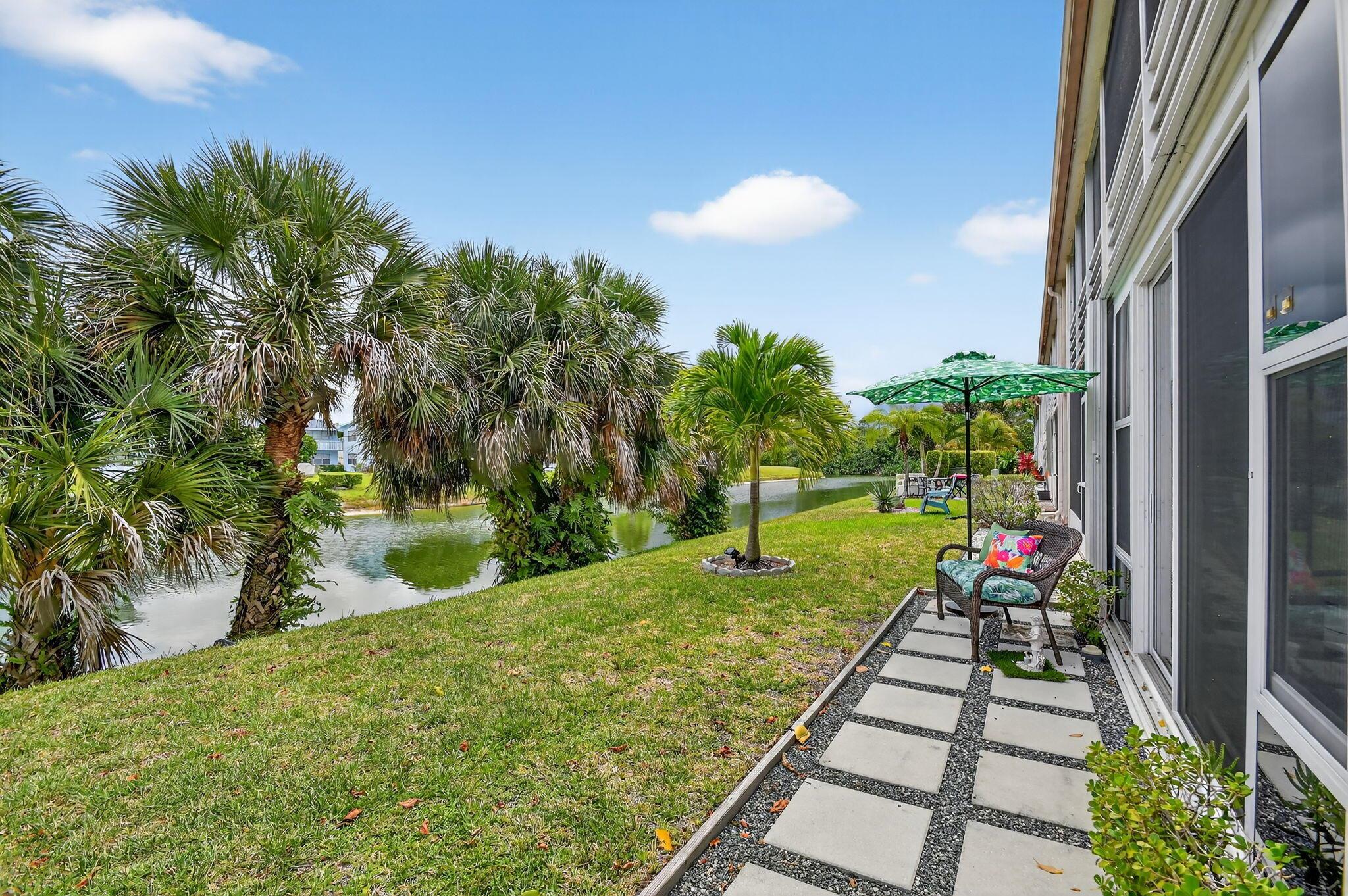 WOW! HIGH END UPDATED 2 BED 2 FULL BATH GROUND FLOOR CORNER CONDO WITH A SERENE WATER VIEW. ELEGANT PORCELAIN TILING THROUGHOUT, OPEN -CONCEPT GOURMET KITCHEN WITH PLENTY OF CUPBOARD SPACE AND STAINLESS STEEL APPLIANCES. TWO BEAUTIFULLY UPDATED BATHROOMS INCLUDING A LUXURIOUS JACUZZI. TAKE IN THE BREATHTAKING WATER VIEW RIGHT FROM YOUR OWN HOME. PLUS REST EASY WITH IMPACT WINDOWS AND HURRICANE SHUTTERS FOR ADDED PEACE OF MIND. NEW ROOF COMING SOON. SELLER WILL PAY THE ASSESSMENT. Assigned parking spot plus visitor parking available; local bus for errands/shopping both within & outside The Village; COME AND ENJOY RESORT STYLE LIVING IN THIS GATED COMMUNITY FOR ACTIVE ADULTS 55+. Clubhouse with theater, shows, movies, craft and card rooms, billiards, yoga, and dance classes. GREAT LOCATI