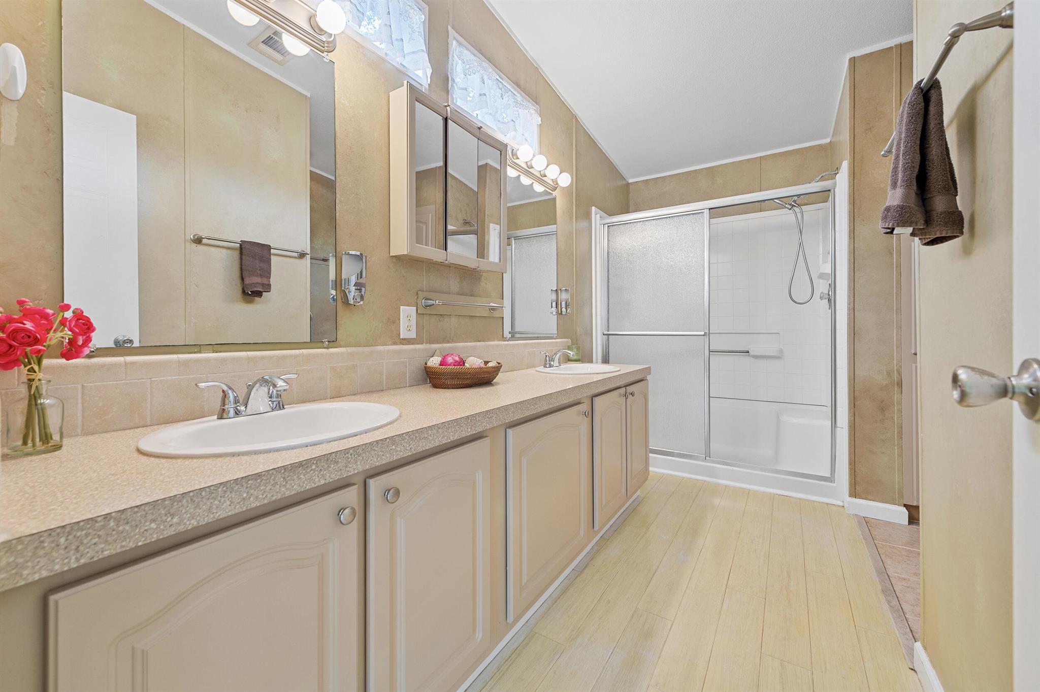 BEAUTIFUL RARE OPPORTUNITY FOR A TWO CAR GARAGE HOME IN THE MEADOWS!It's land leased and HOA pays property taxes. This outstanding property offers a spacious garage and an open-concept floor plan. The residence features three bedrooms and two full bathrooms, with a kitchen thoughtfully designed for entertainment. Recent improvements to this property include a new roof installed in 2021 with warranty coverage, an air conditioning unit added to the garage in 2023, and a new home AC system installed in 2019. The primary bathroom features double sinks and a walk-in shower with dual seating. Additional amenities comprise an interior laundry room and a full suite of appliances, including a dishwasher (2019), microwave (2019), refrigerator (2020), dryer (2019), hot wa