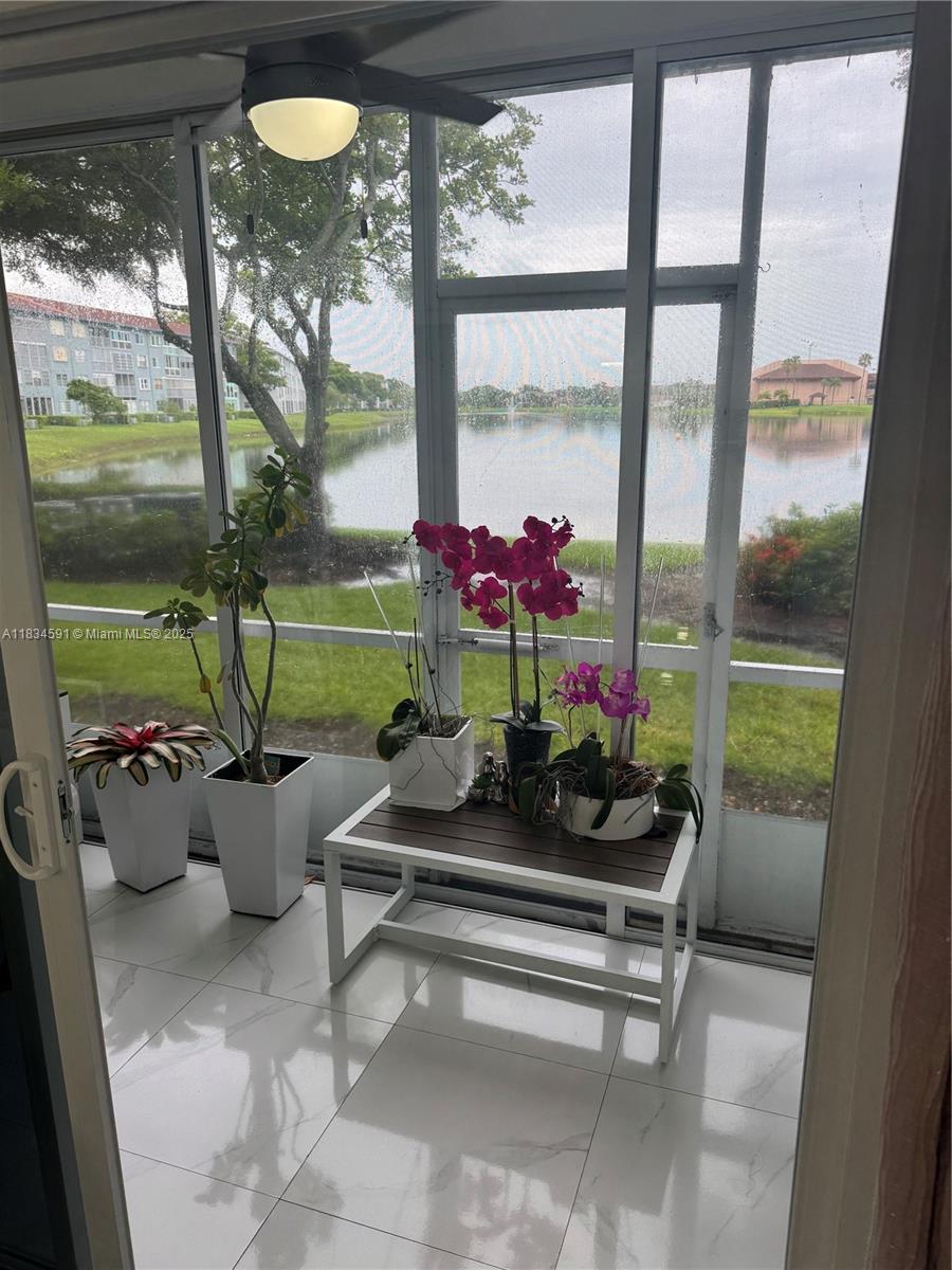 Beautiful first floor unit in well maintained 55+ age community of Century Village. New kitchen and built-in closet in master bedroom. Awesome lake view from living room and enclosed balcony. Impact glass throughout with zebra shades in kitchen, second bedroom and balcony. Blackout and see through shades in master bedroom. Owner motivated.