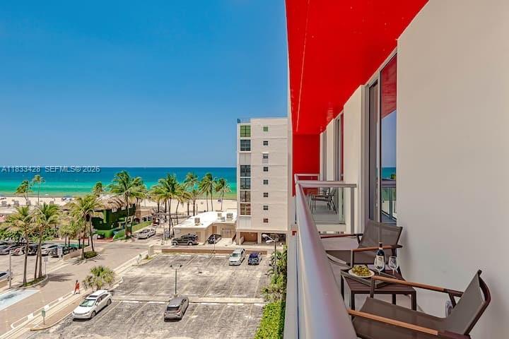 Beautiful one-bedroom, one-bathroom unit with balcony. Fully furnished and equipped in a luxury Condo Hotel with partial Ocean Views from the balcony. Amazing rooftop with bar, pool, jacuzzi, lounge areas, and spectacular views of the city, Intracoastal Waterway, and beach. NO RENTAL RESTRICTIONS! Association fee includes cable TV, internet, water, gym, electricity, facilities, and amenities. Just steps away from the Hollywood Boardwalk with many restaurants, bakeries, and shops.