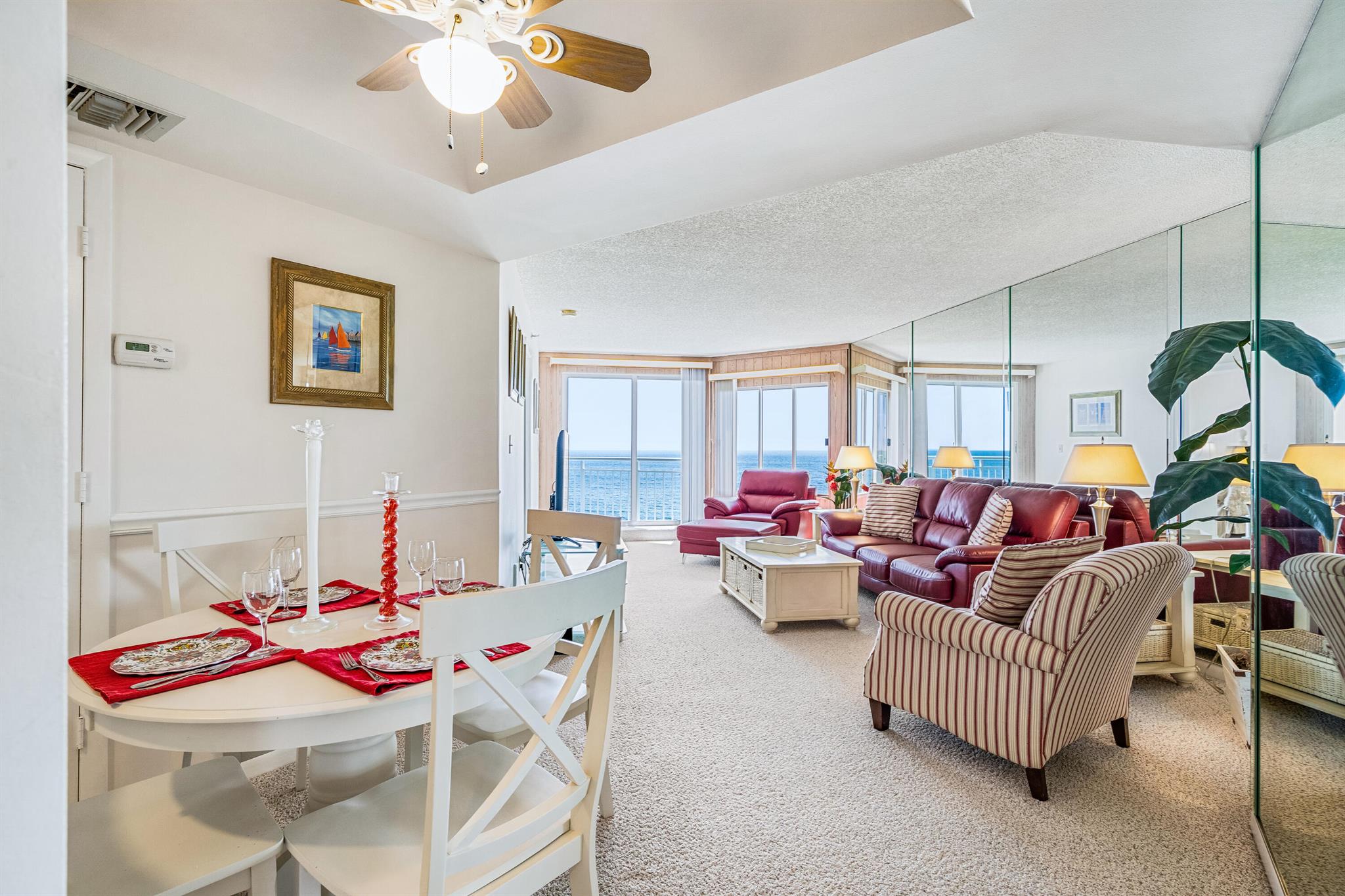 Beautiful 6th floor 2 bed, 2 bath unit with stunning ocean views! Unit features an airy floor plan with spacious rooms. Enjoy breathtaking sunrises from your private balcony overlooking the ocean! 1 car garage included! Great amenities include a community pool, club room, fitness room, tennis, pickleball and beach access! Sizes approx/subj to error.