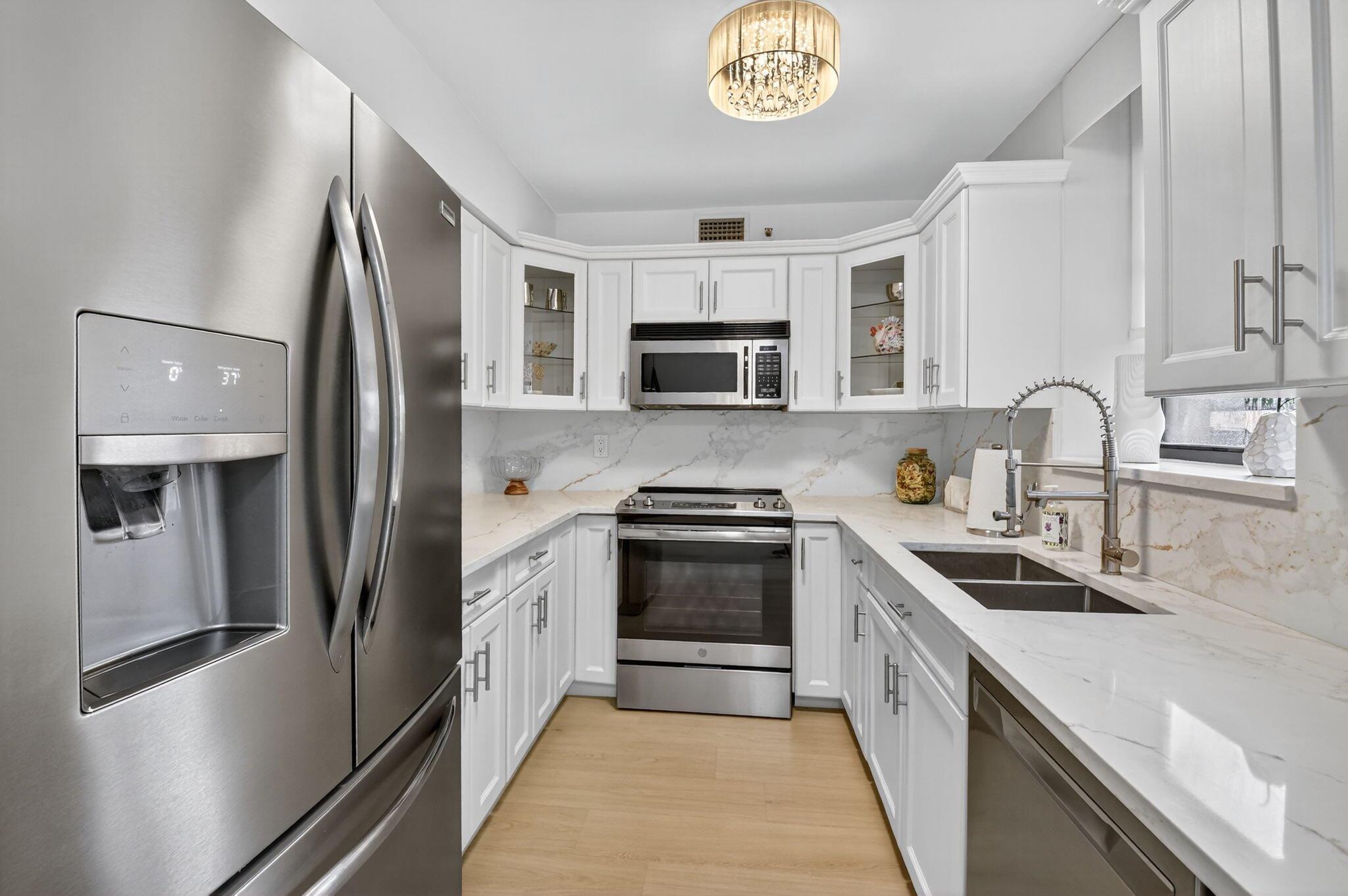 This home shows like a model and is priced to sell. Newly renovated 2 bedroom 2 bath condo on desirable first floor. This unit has recently renovated bathrooms with beautiful quartz countertops and top of the line fixtures. You will find new premium waterproof Karastan flooring in all living areas and bedrooms. The kitchen is equipped with Stainless Steel appliances including a new dishwasher and updated French Door refrigerator. A new water heater was installed in 2025. The interior has been freshly painted and new light fixtures have been installed throughout the home. Promenade is a gated community as well as requiring a security code to enter the entrance to your building. The dining room could easily be converted into a 3rd bedroom.
