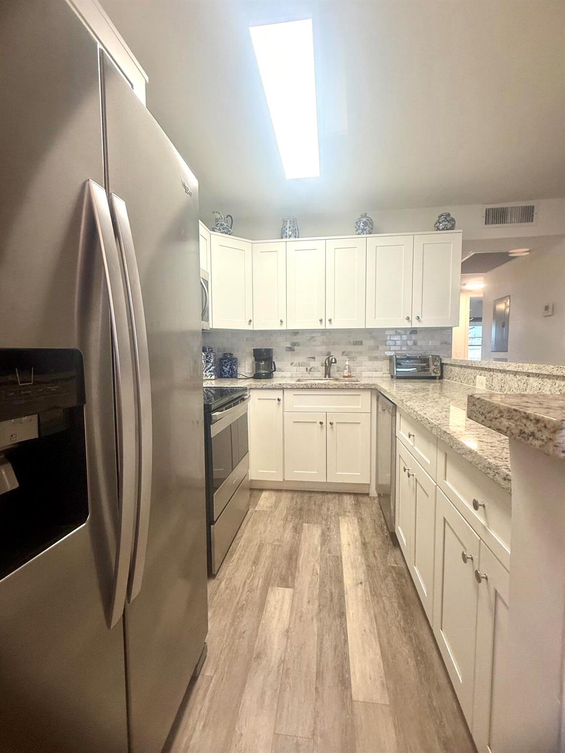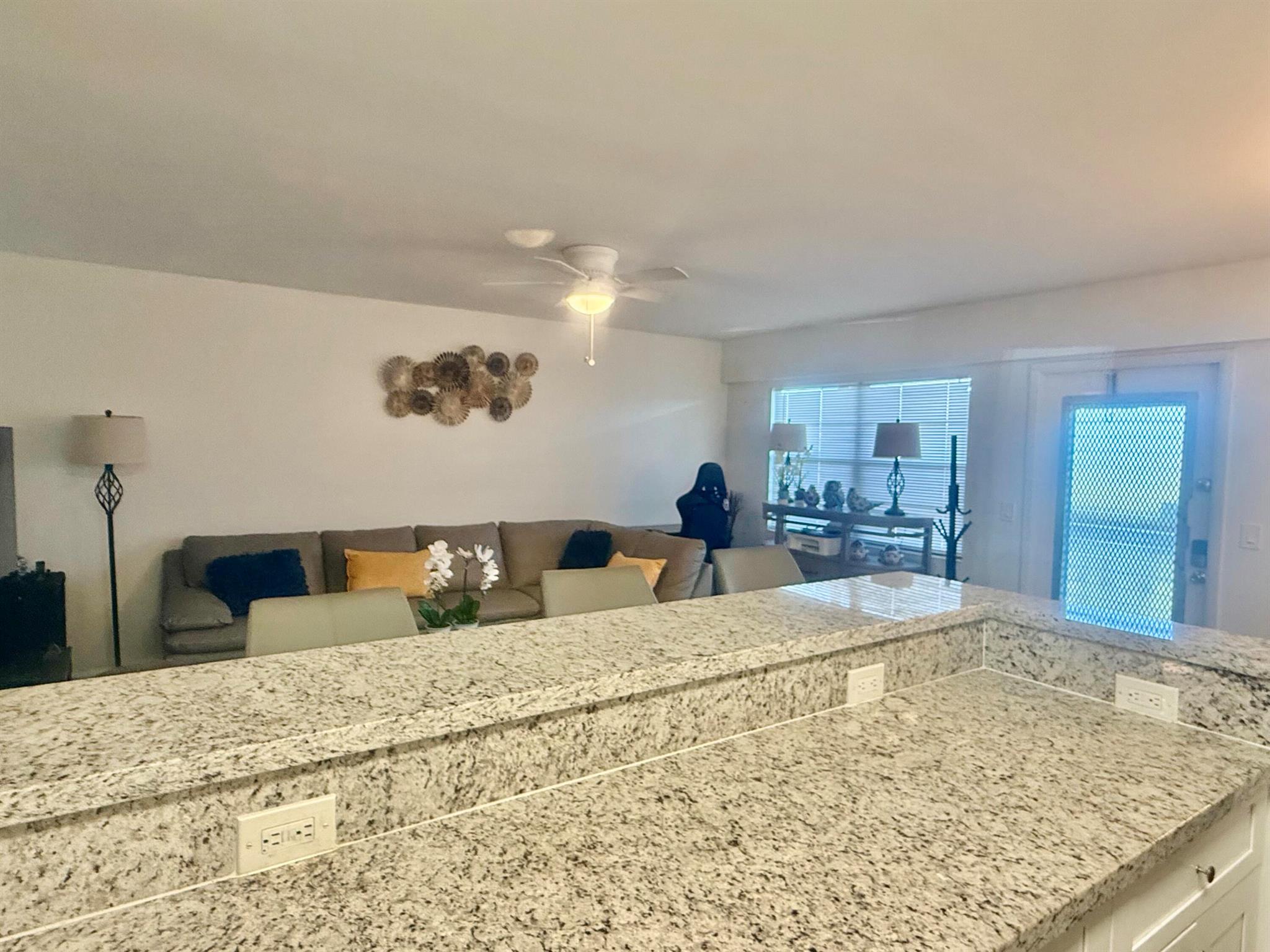 Turnkey beautifully updated 2-bedroom, 1.5-bath condo on the 3rd floor featuring an open floor plan with granite countertops, stainless steel appliances, & vinyl wood flooring in the main living areas. Stylishly furnished with modern bathrooms, walk-in shower (no tub), an enclosed patio. Conveniently located near house of worship, clubhouse, and shopping. Enjoy resort-style living at Century Village with amenities including internet, Wi-Fi and water a state-of-the-art fitness center, live shows, movies, shuttle buses, classes, bingo, card rooms, trips, tennis, pickleball and more. Just minutes from restaurants and retail. **This is an active 55+ community. Come see it today and tour the amazing clubhouse with a state of the art theatre.Can be bought with or without furniture.