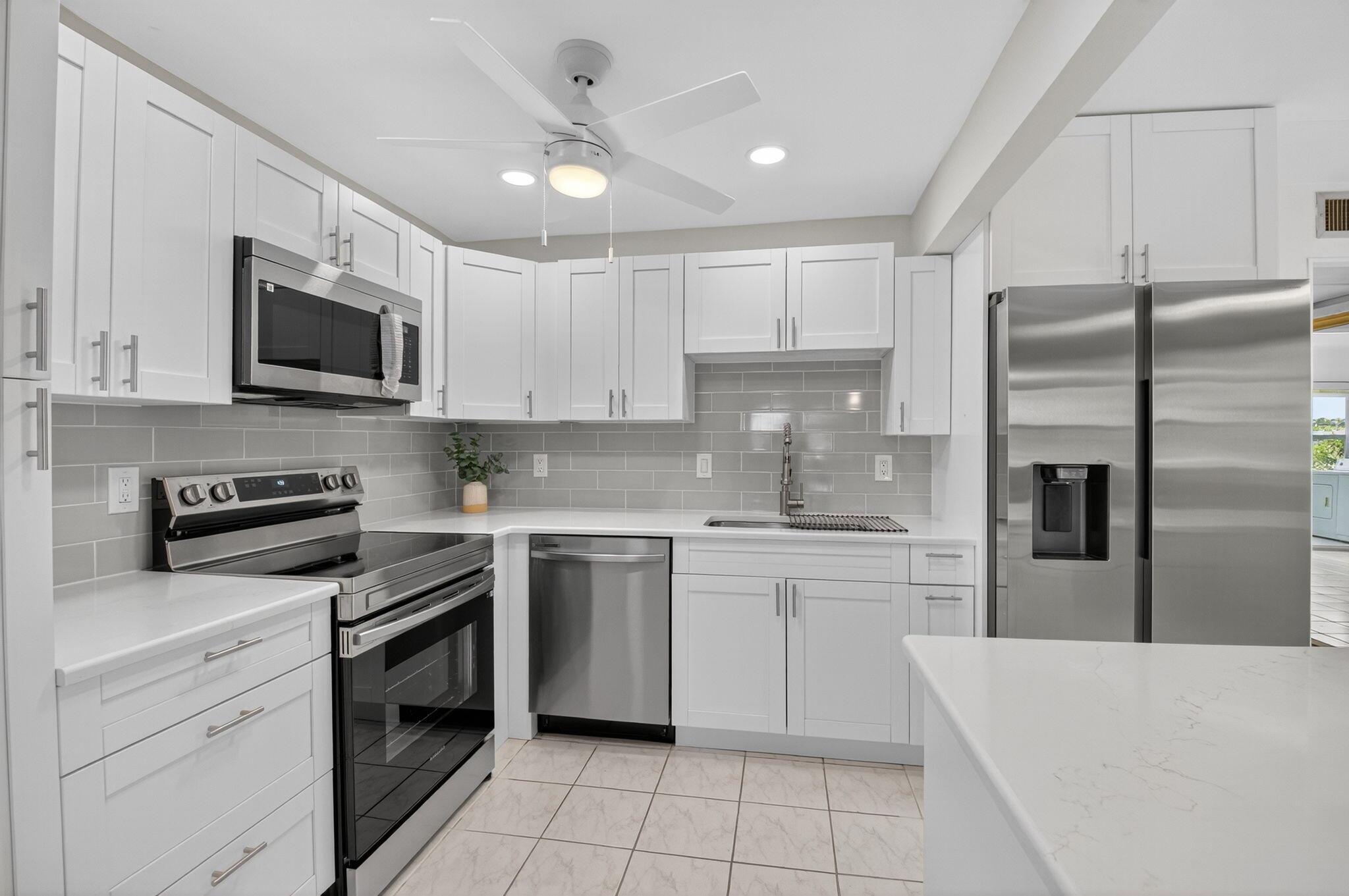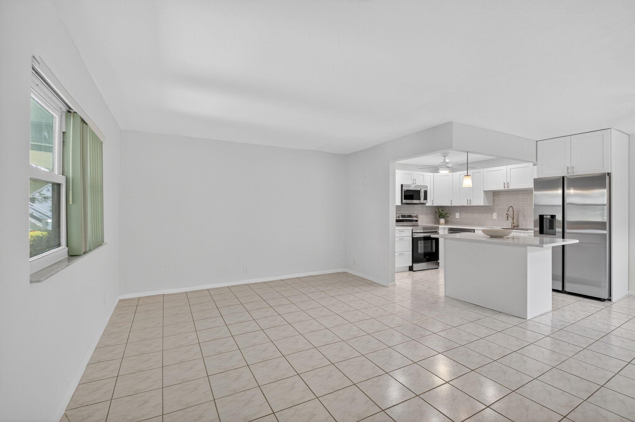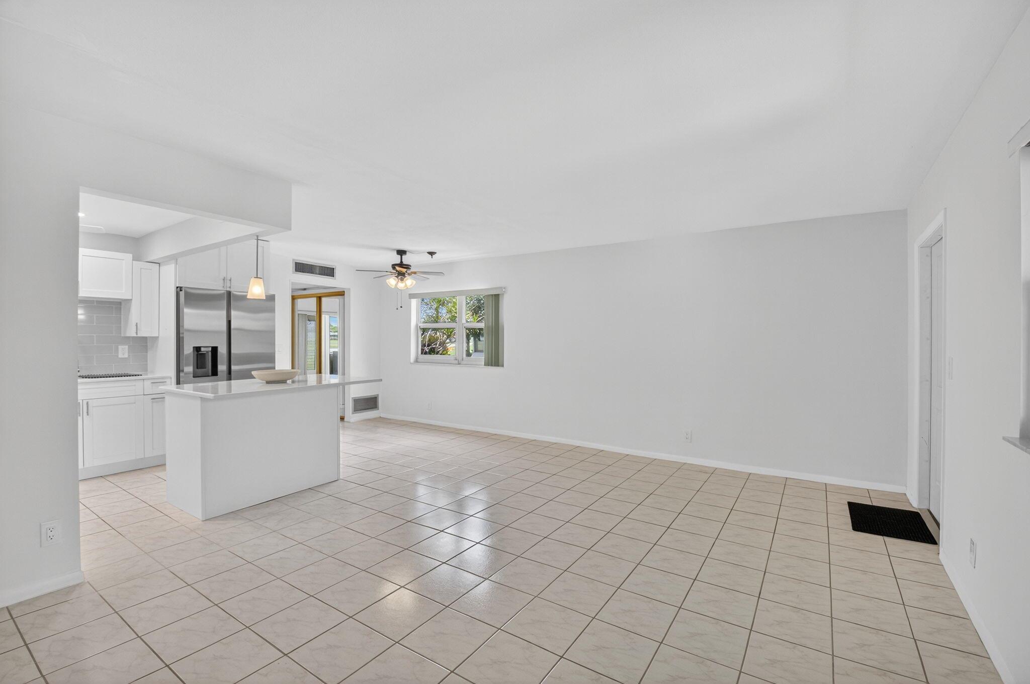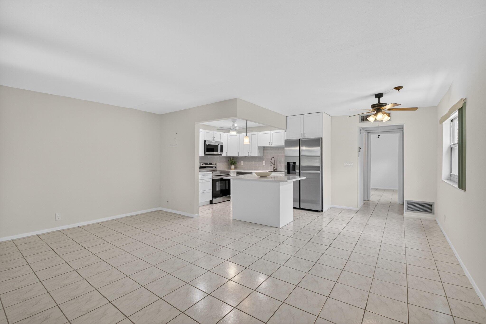 Beautiful first floor corner 1BD/1.5BA unit with stunning golf course views in 55+ Kings Point Delray Beach.This bright condo features an all new open concept kitchen with quartz countertops and stainless steel appliances. Bathrooms have been previously renovated. Enjoy a private patio overlooking the golf course, the perfect place to experience South Florida's breathtaking sunrises and sunsets.Assigned parking is conveniently located nearby. Resort-style amenities include clubhouse, golf, indoor/outdoor pools, tennis, pickleball, shuffleboard, card rooms, cinema, full size theater, fitness center, shuttle service, on site restaurant, and a variety of social activities. Ideally located just 15 minutes from the beach and vibrant Atlantic Ave shops, dining and cultural events.