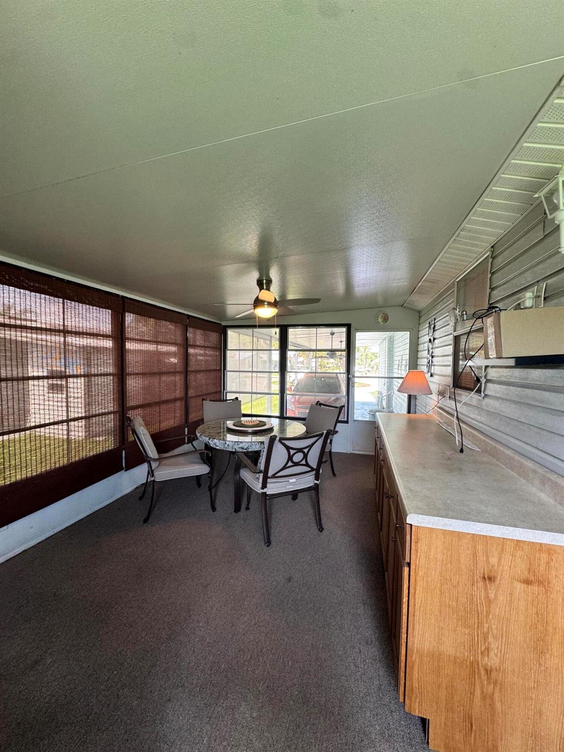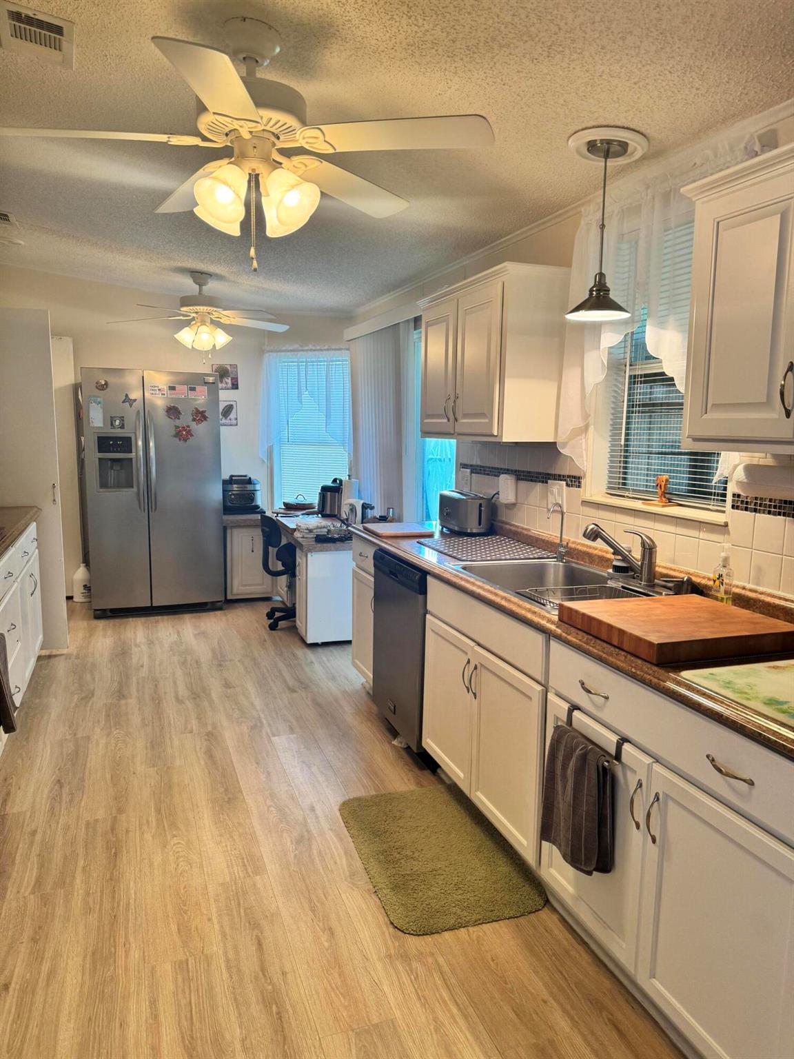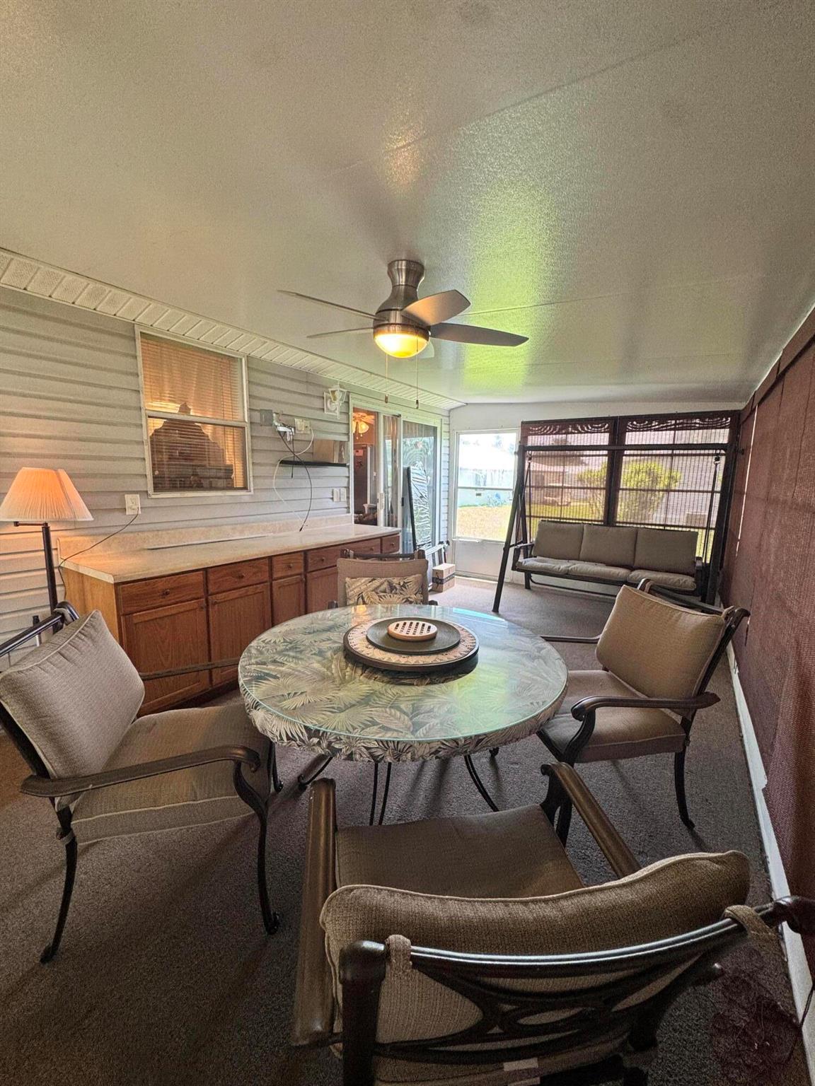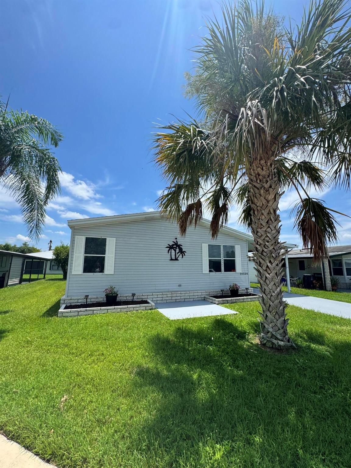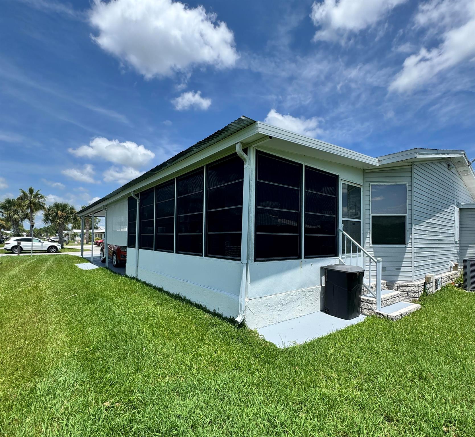 Lovely 3 bedroom 2 bath home in the desirable 55+community of Spanish Lakes Fairways. Home is on a very quite cal de sac. Spacious living room as well as oversized kitchen. Home has a screened in lania perfect for morning coffee or evening cocktails. Laminate and carpet flooring. Kitchen redone in 2015. kitchen features pull out shelves, large sink with window. coffee bar. Wiring in home redone in 2012. Dining room has built in shelves for added storage. Primary suite bathroom has dual sinks, built in vanity and build in shelves in bathroom. Roof is new 2025. A/C is 2022 Water heater was replaced in 2018. Lawn care and trash removal included in lot rent. 18 hole golf course included in lot rent. 2 pools, tennis, pickleball, bocce ball, shuffle board. club house and much more.