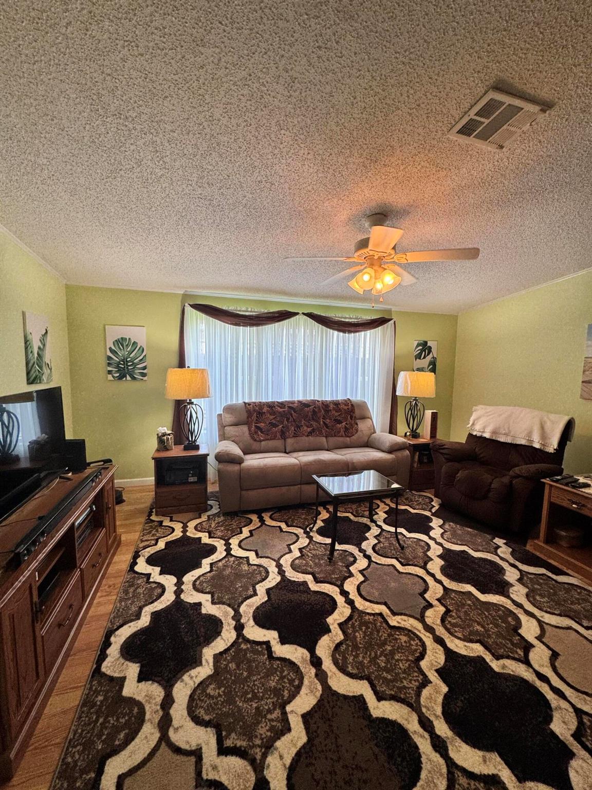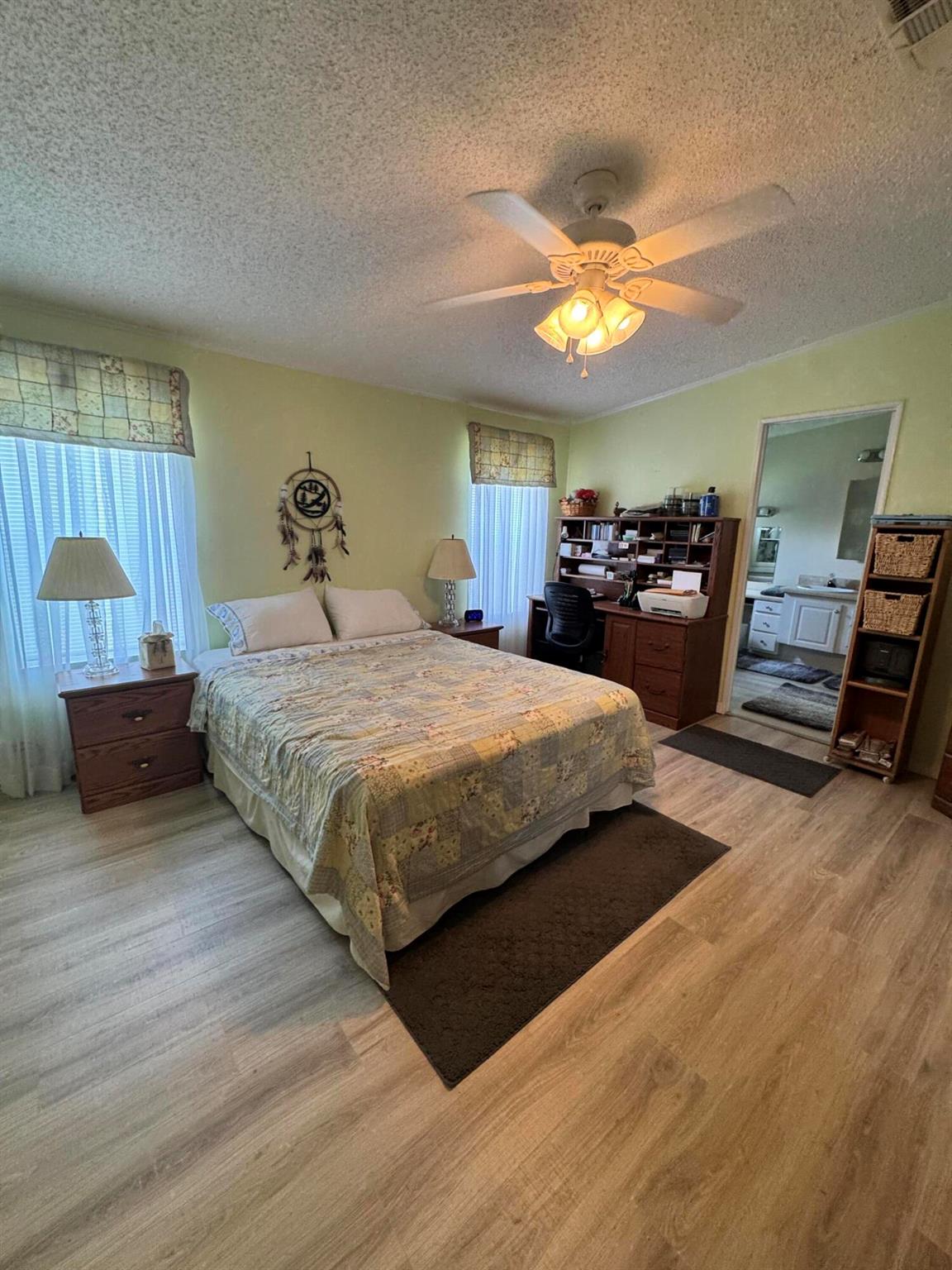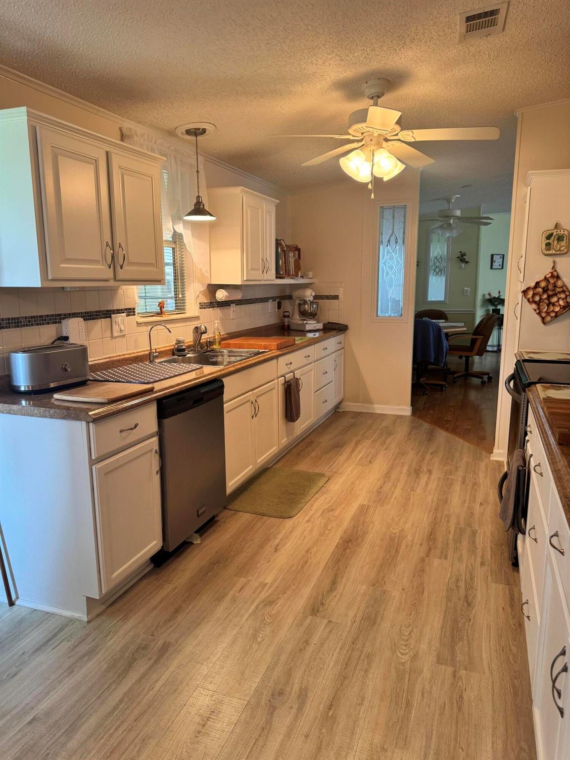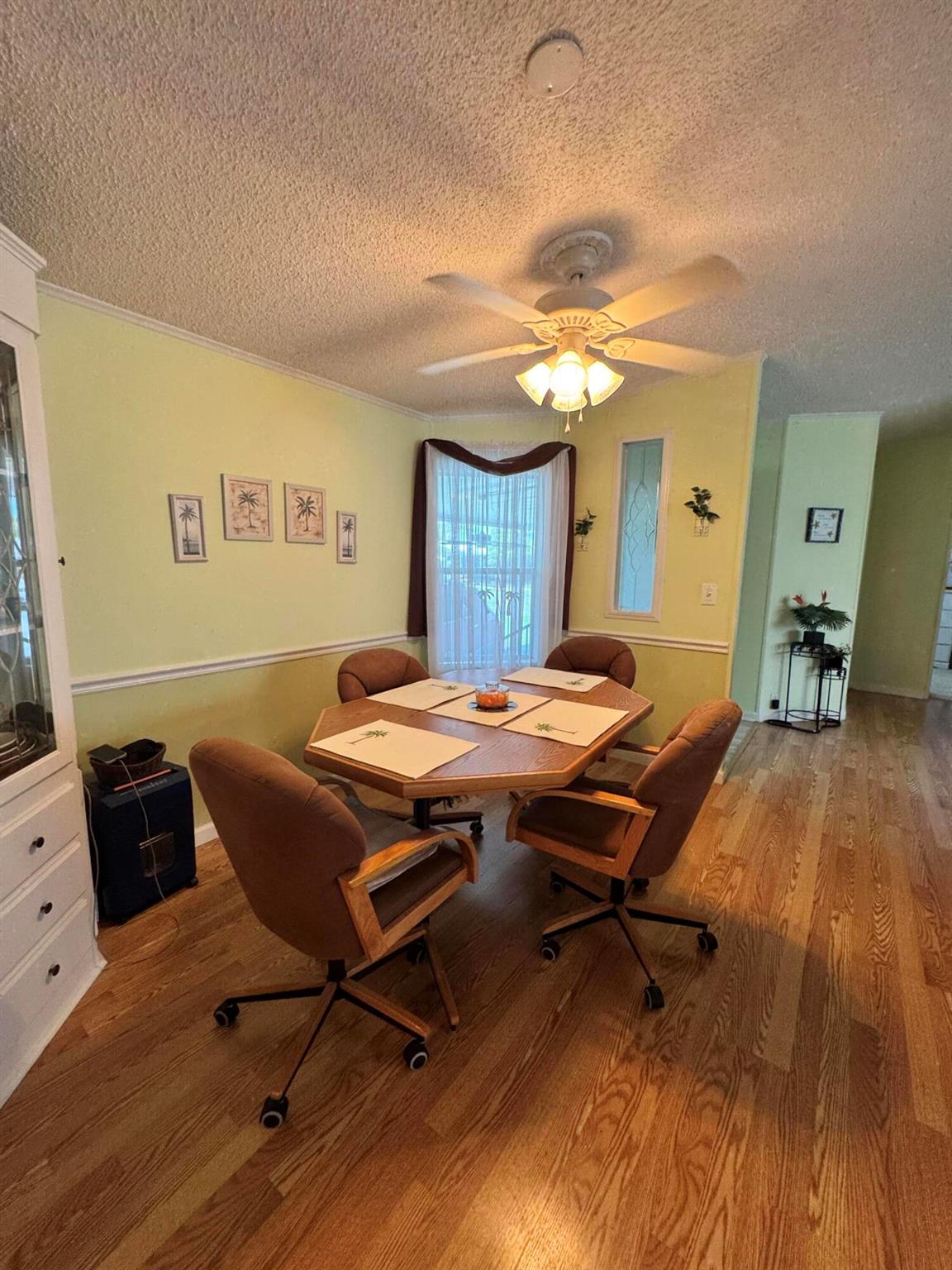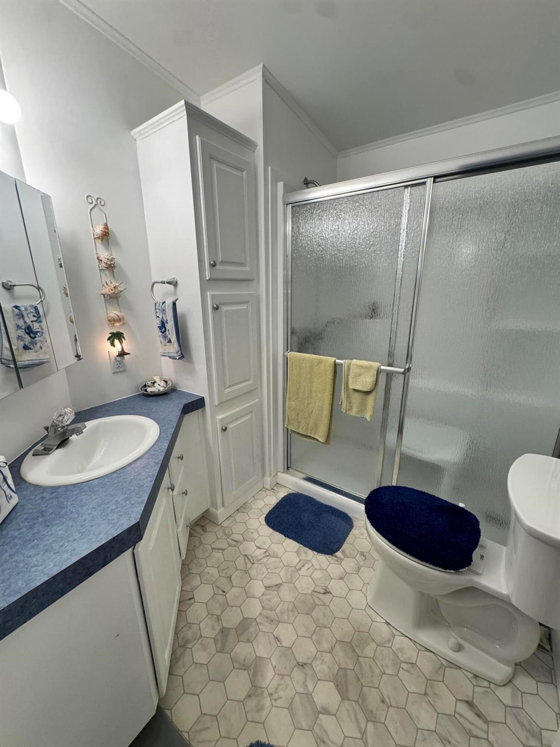 Lovely 3 bedroom 2 bath home in the desirable 55+community of Spanish Lakes Fairways. Home is on a very quite cal de sac. Spacious living room as well as oversized kitchen. Home has a screened in lania perfect for morning coffee or evening cocktails. Laminate and carpet flooring. Kitchen redone in 2015. kitchen features pull out shelves, large sink with window. coffee bar. Wiring in home redone in 2012. Dining room has built in shelves for added storage. Primary suite bathroom has dual sinks, built in vanity and build in shelves in bathroom. Roof is new 2025. A/C is 2022 Water heater was replaced in 2018. Lawn care and trash removal included in lot rent. 18 hole golf course included in lot rent. 2 pools, tennis, pickleball, bocce ball, shuffle board. club house and much more.