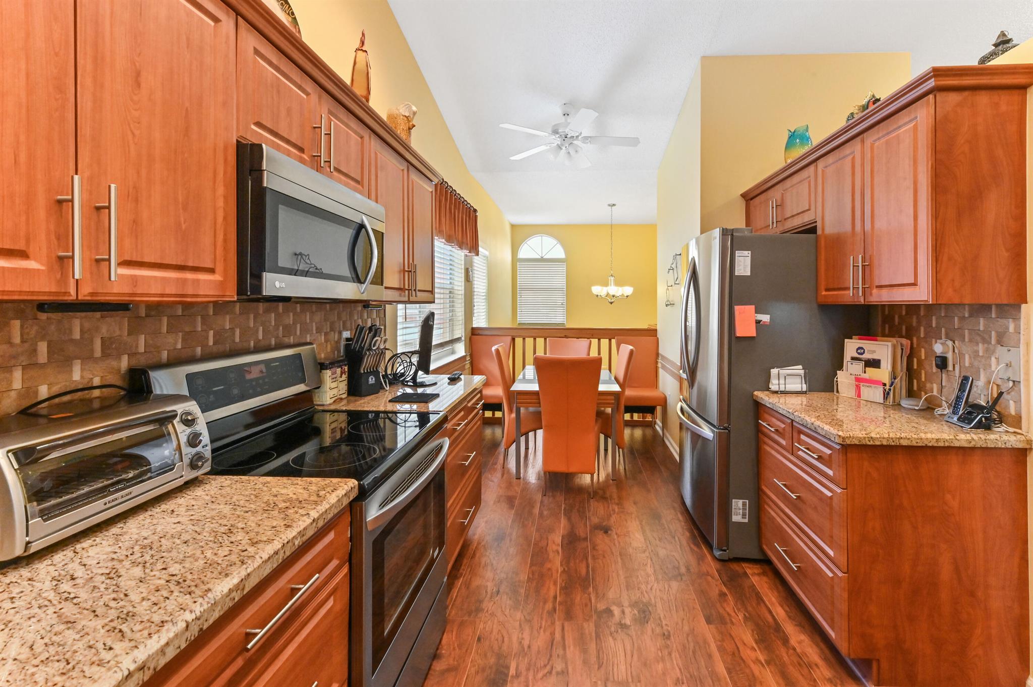 Welcome to serene, easy living at 9553 Shadybrook Drive, a beautifully appointed coach home situated in the active adult community of Palm Isles, Boynton Beach, FL. Experience the allure of a lifestyle marked by a tranquil ambiance combined with the vibrancy of Palm Isles. As you step into the second-floor home, captivating vaulted ceilings greet you. The space is uplifting, with an expressive openness that invites natural light in, fills the surroundings with supreme brightness. Adding to your comfort and convenience, a dedicated laundry section streamlines your daily chores. A splendid revelation inside this home is its chef's dream kitchen. Designed in an elegant open-concept layout, the gourmet kitchen boasts stainless steel appliances that enhance culinary creativity.