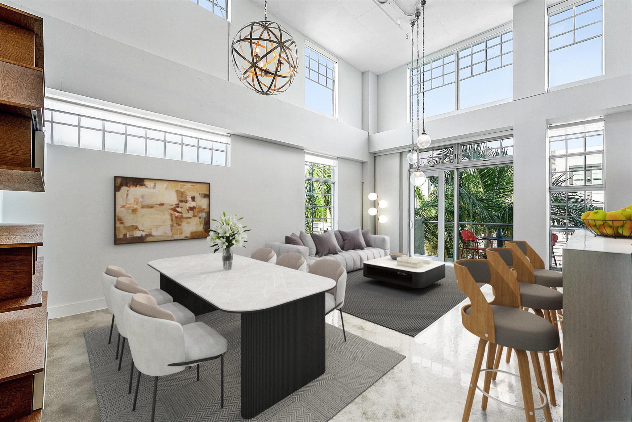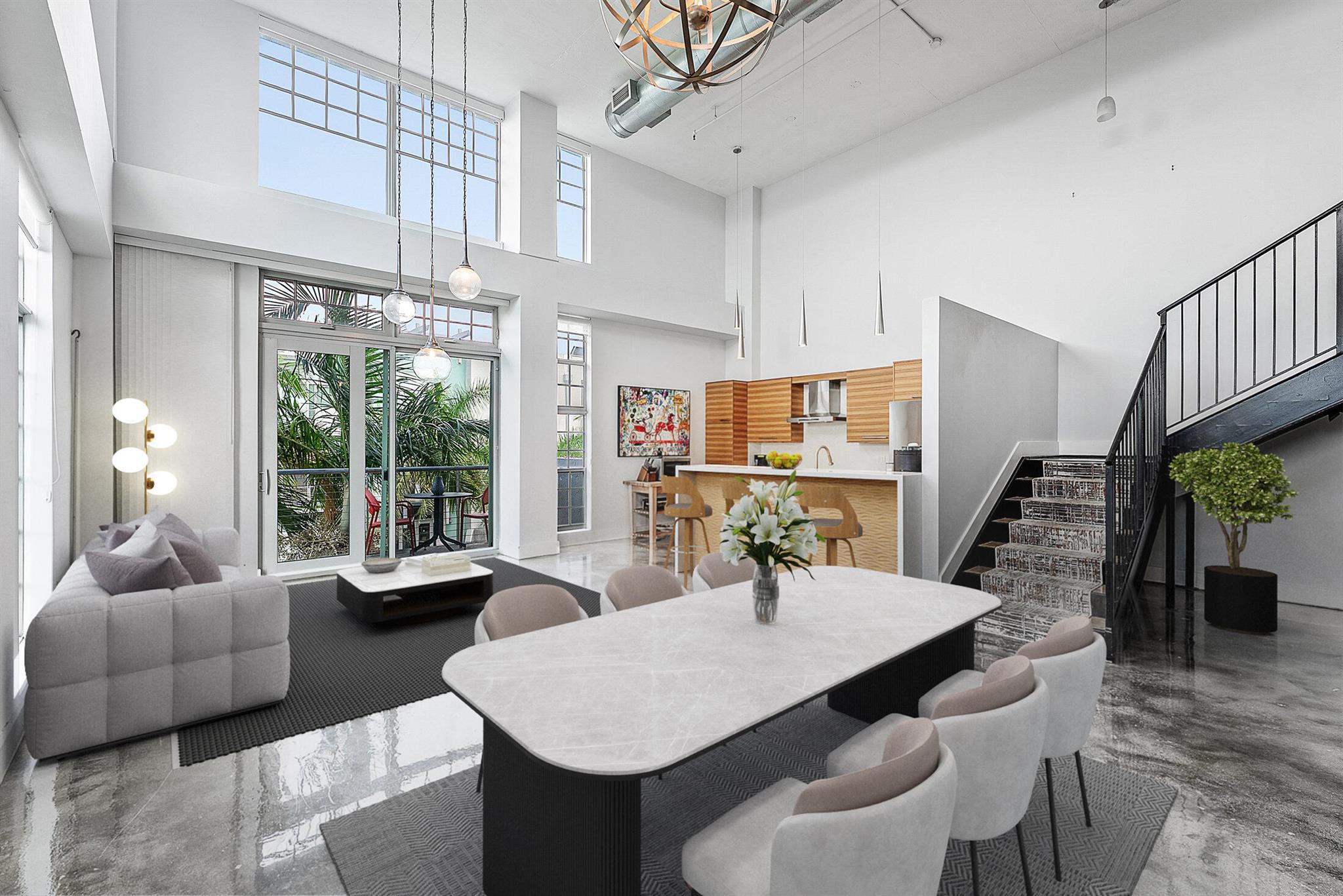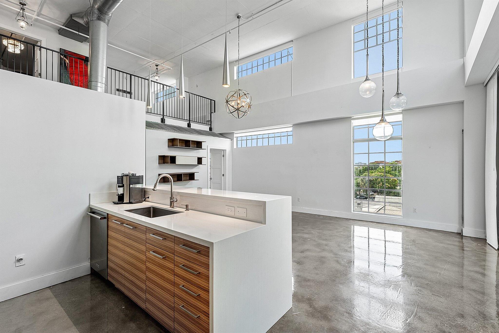 Welcome to Unit 317 at 185 NE 4th Avenue -- a stunning two-story corner penthouse in the highly sought-after Ocean City Lofts, located in the heart of Downtown Delray Beach. This expansive 2-bedroom, 2.5-bathroom loft spans 1,795 square feet and features soaring 20-foot ceilings, polished concrete floors, and floor-to-ceiling impact windows that flood the space with natural light. The open-concept layout showcases a modern kitchen with sleek cabinetry, stainless steel appliances, and a spacious counterspace perfect for entertaining. The first level includes a private guest suite, half bath, and a bright living/dining area that flows onto a large balcony. Upstairs, the versatile loft-style primary suite features a walk-in closet, and a beautifully appointed bathroom.