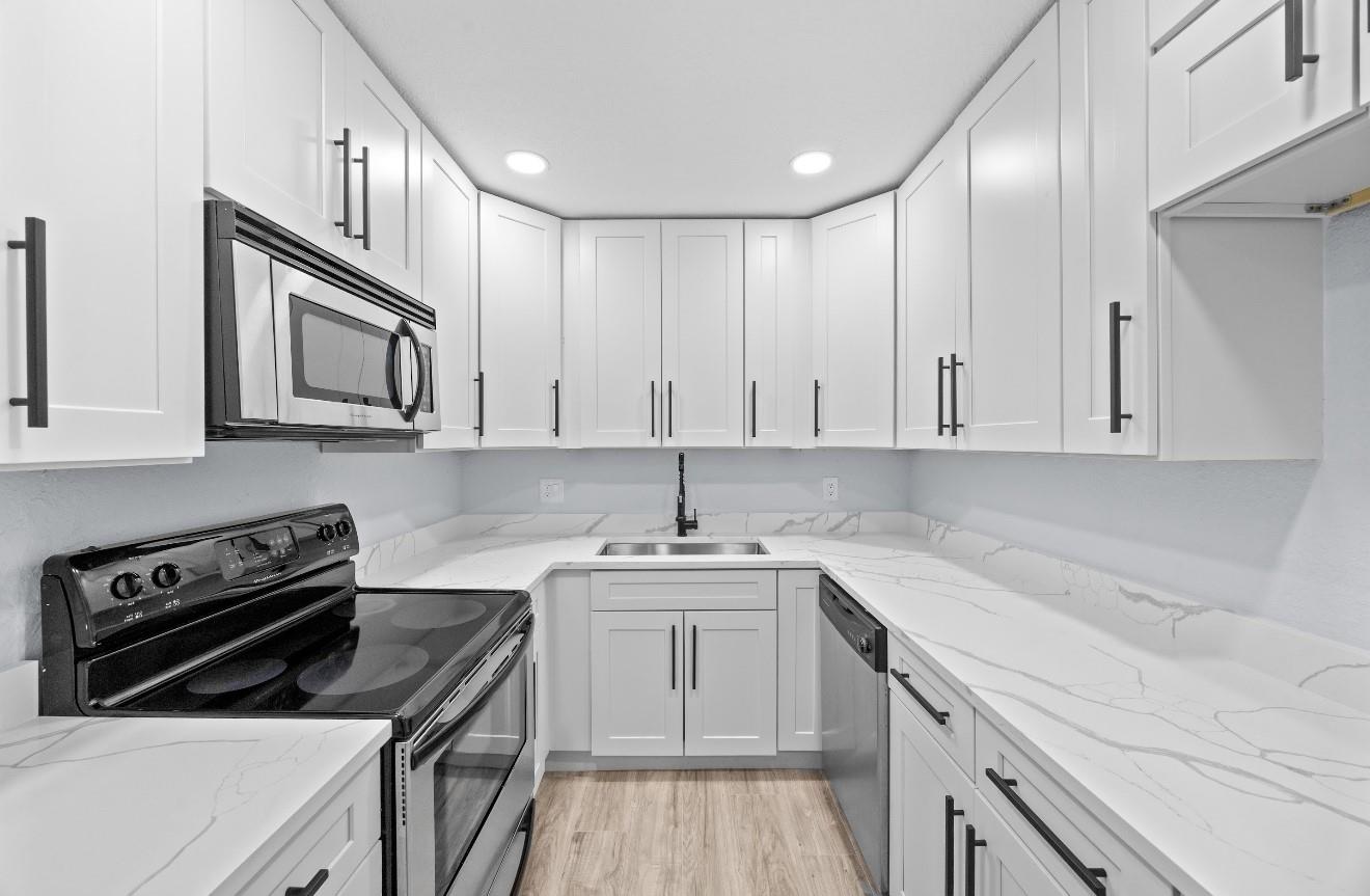 Beautifully Remodeled 1-Bedroom in Active Gated Community Welcome to this stunning ground-floor 1-bedroom, 1.5-bathroom unit, fully remodeled w/ brand-new laminate flooring throughout, a sleek white kitchen w/ quartz countertop, stainless steel appliances, & recessed lighting under smooth ceilings. The open living space flows seamlessly to a screened-in patio overlooking the sparkling community pool. The spacious primary suite features a large walk-in closet and an elegantly updated en-suite bathroom with modern fixtures. Additional highlights include a stylish powder room for guests and plenty of storage. Set in an active, gated community offering scenic walking trails, peaceful lakes, and a vibrant social scene, this turnkey unit blends comfort, style, and convenience.