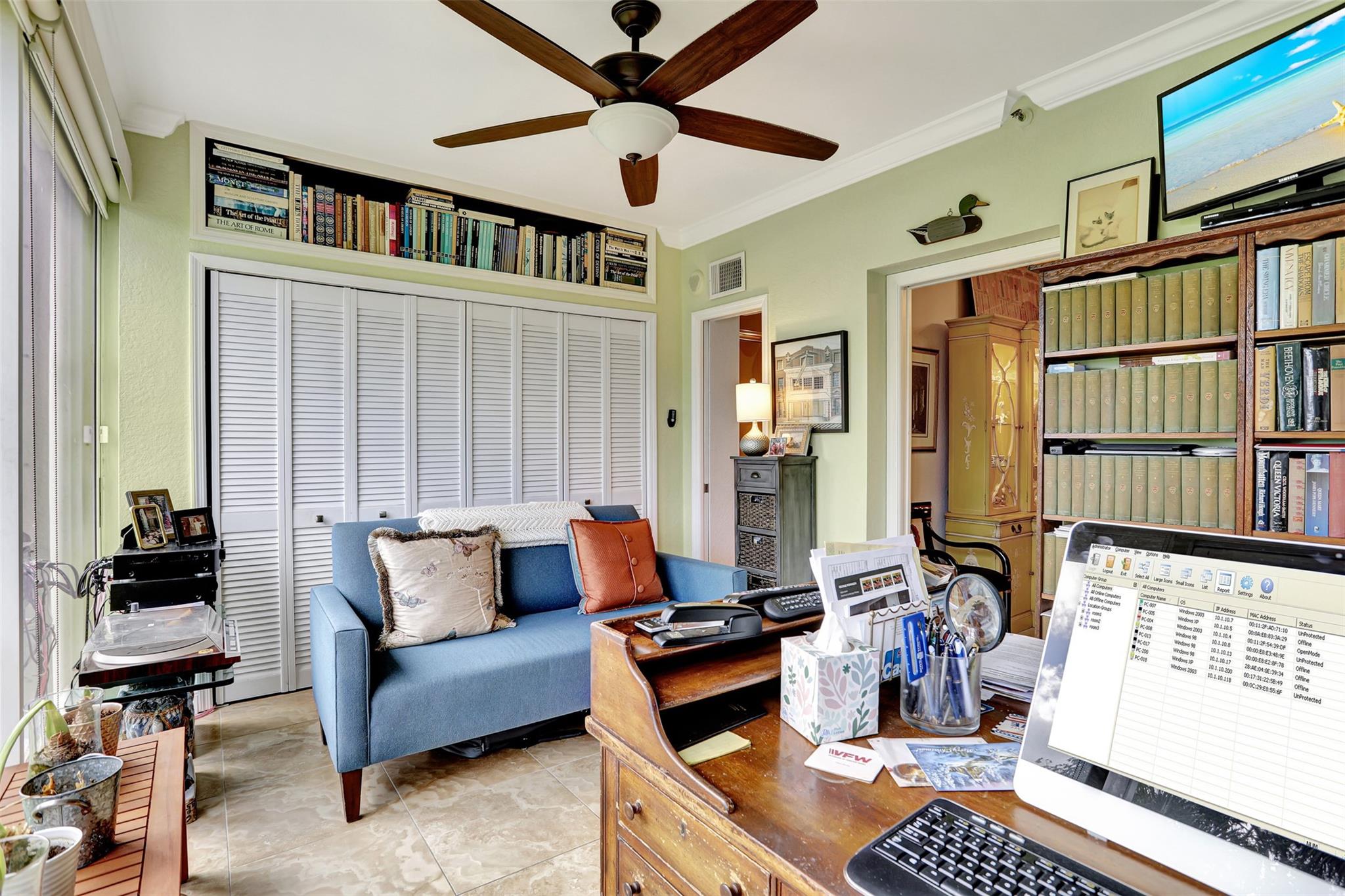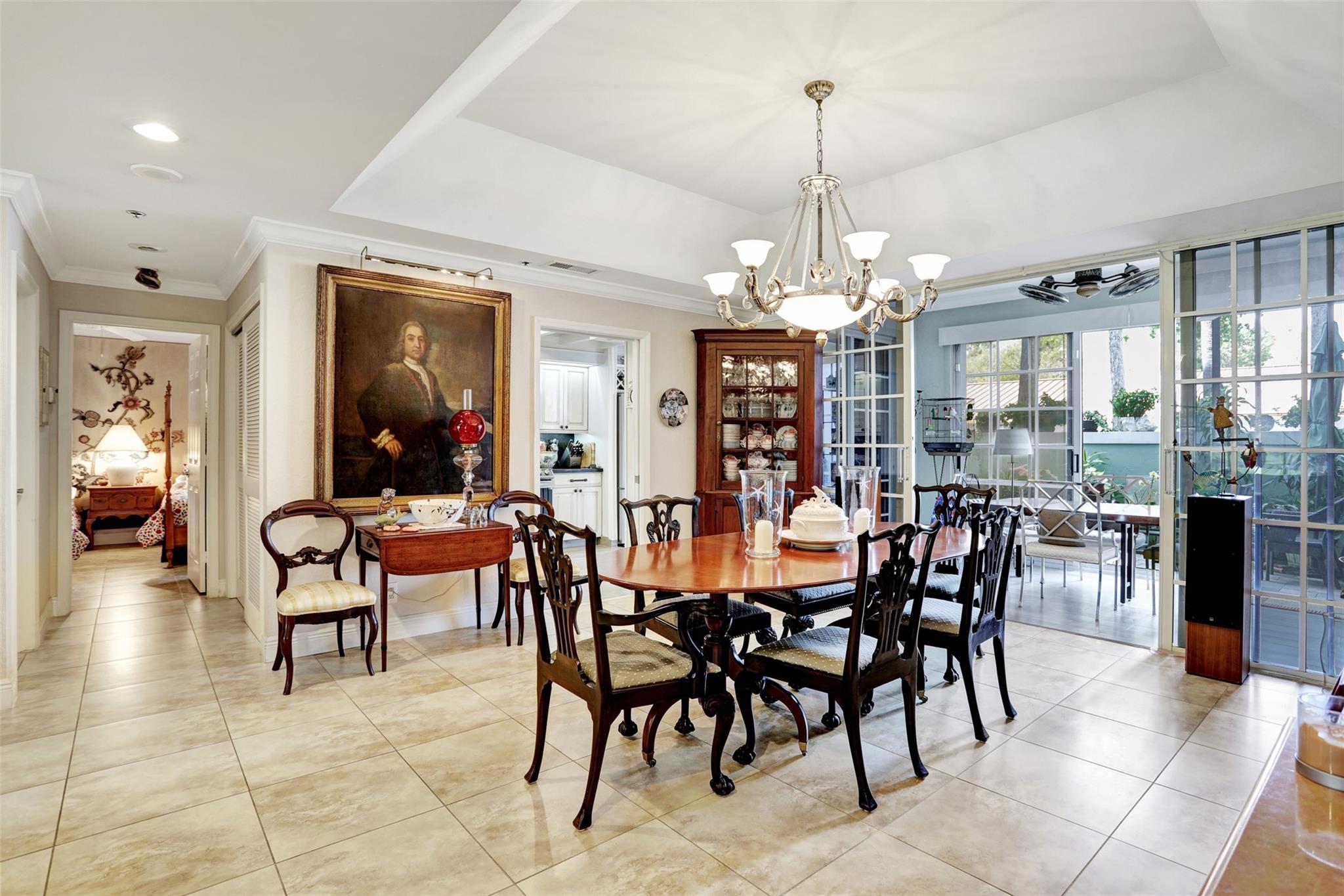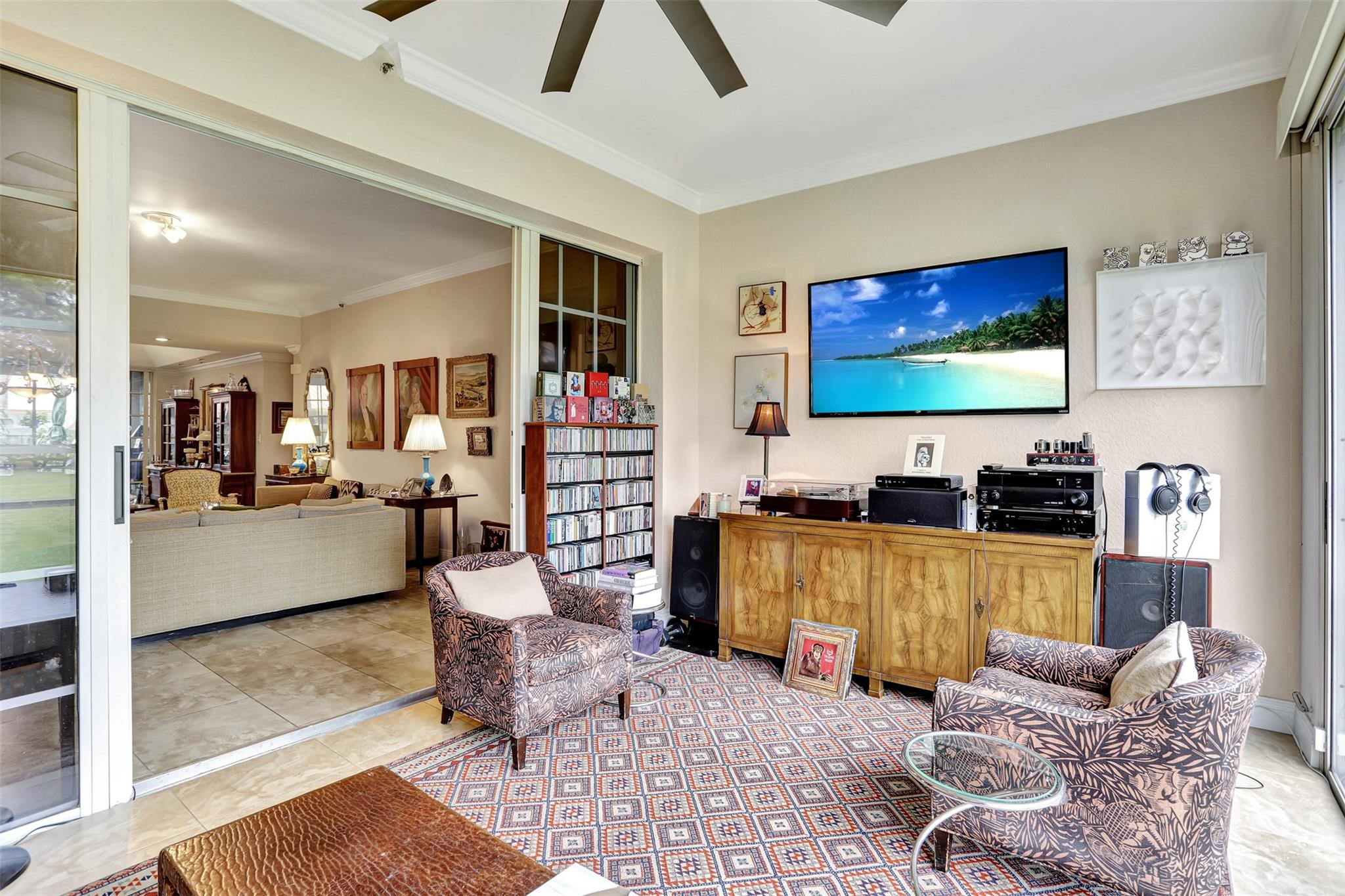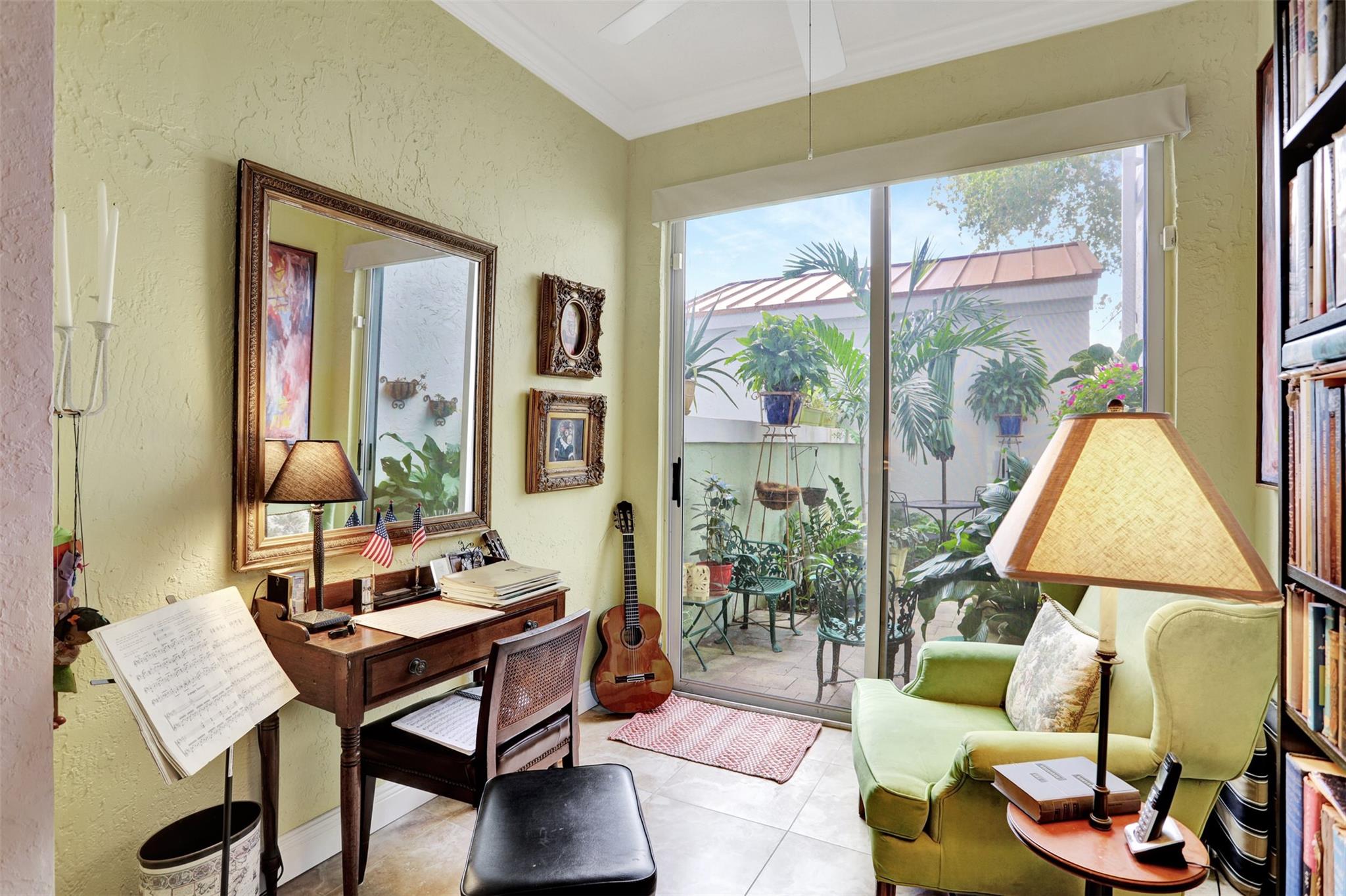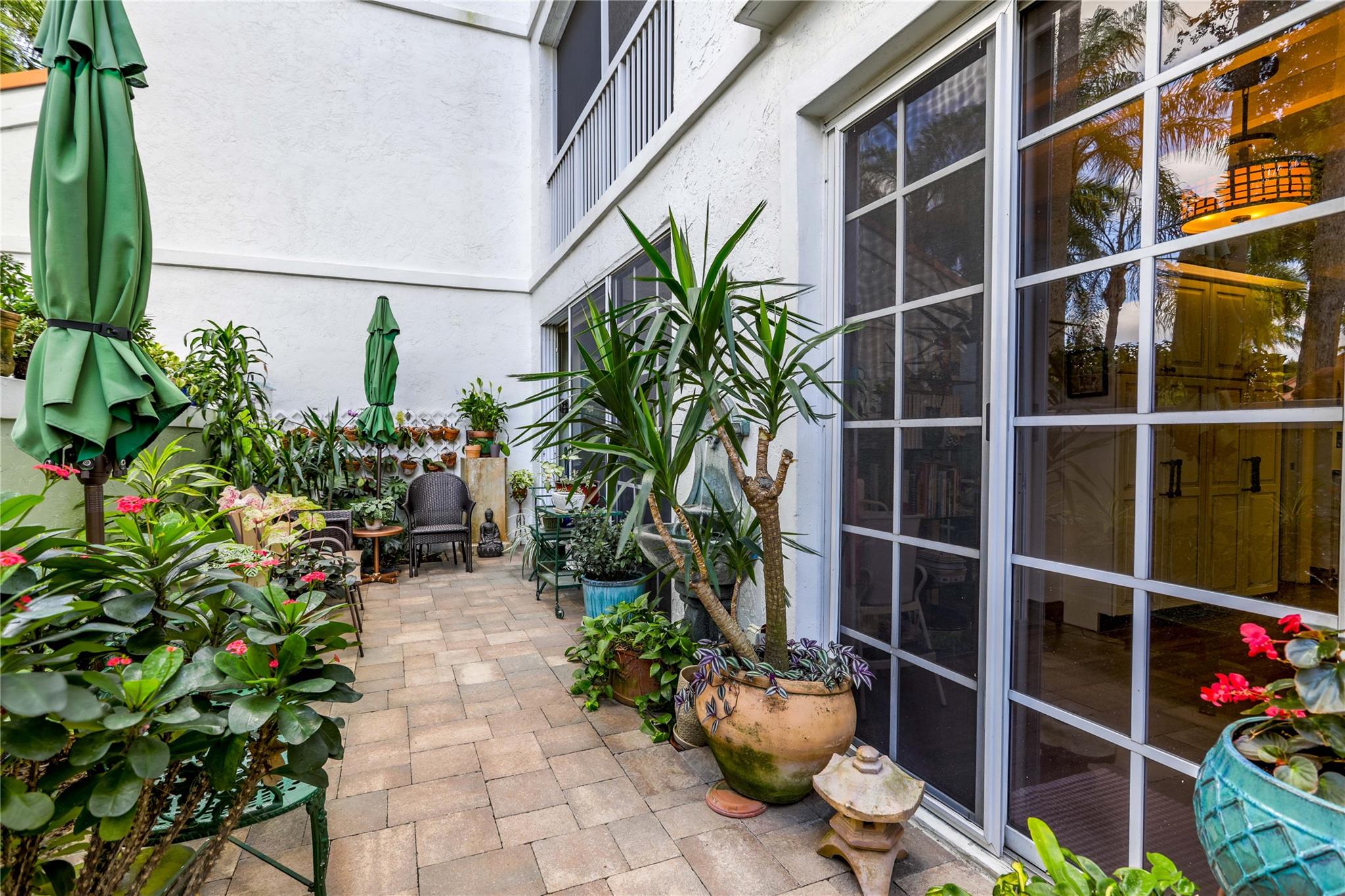 Perfect first-floor featuring a private, charming outdoor garden that offers the feel of a single-family home with the security of condo living. Enclosed glass patios expand the living space. The primary bedroom and office/third bedroom overlook the golf course, while the secondary bedroom includes a sitting area and direct access to the private garden. The spacious primary suite offers a large walk-in closet and an en-suite bath with dual sinks, a Roman tub, and a separate shower. Wet bar in the family room, an interior laundry room with full-size washer and dryer, abundant closet space, and a dedicated storage room. One covered parking space plus ample parking. Gated with a secured lobby, an additional private entrance from garden, and a clubhouse with heated pool just a short walk away.