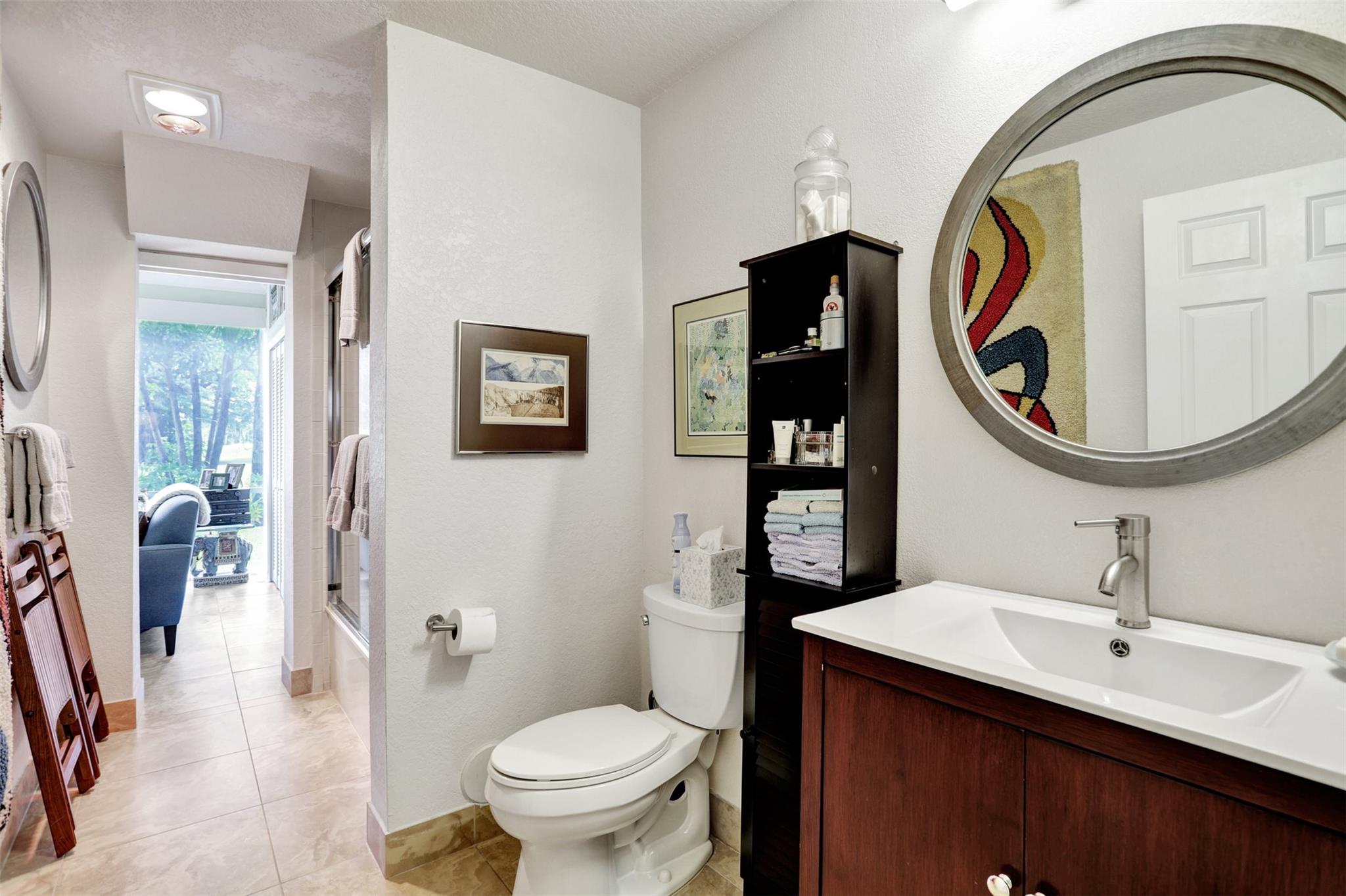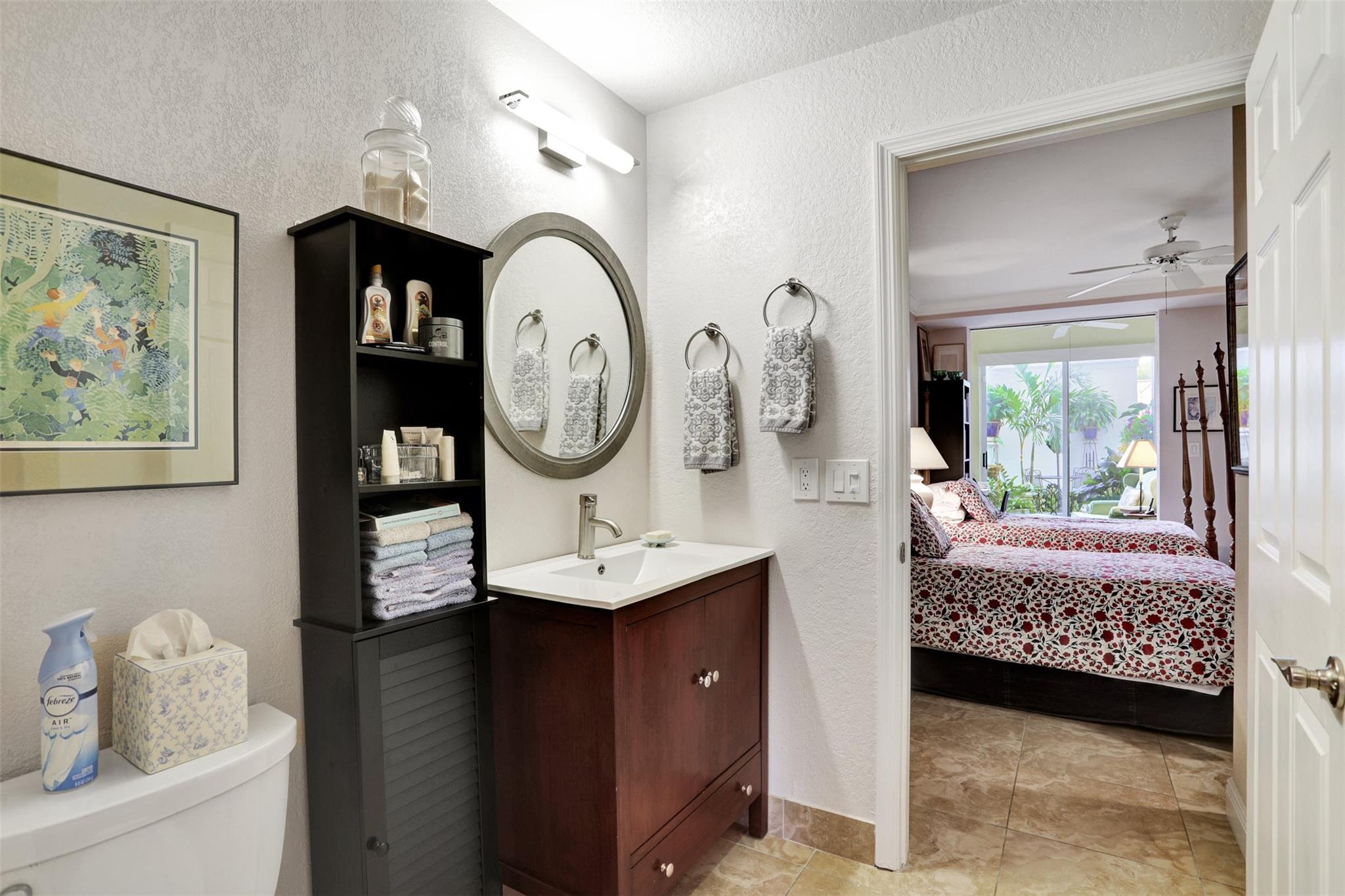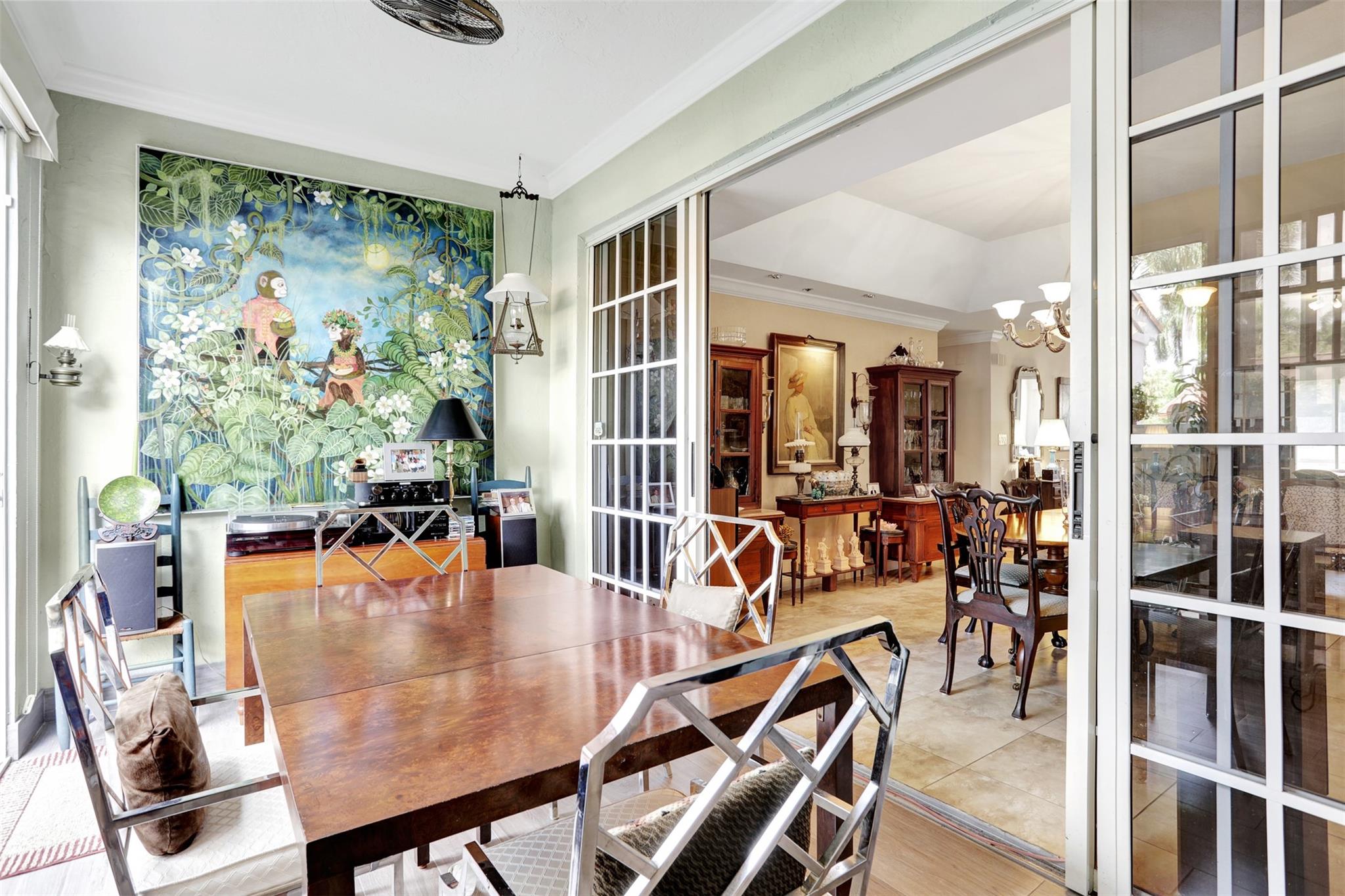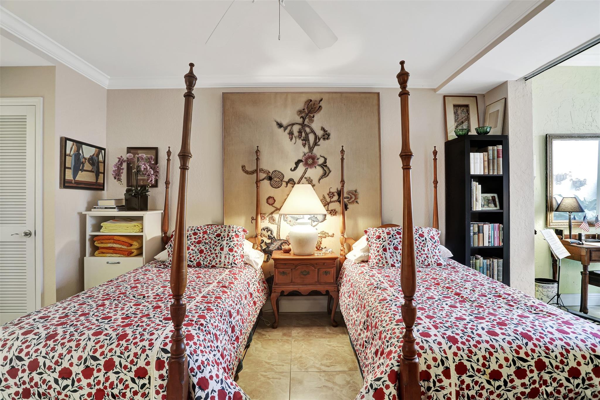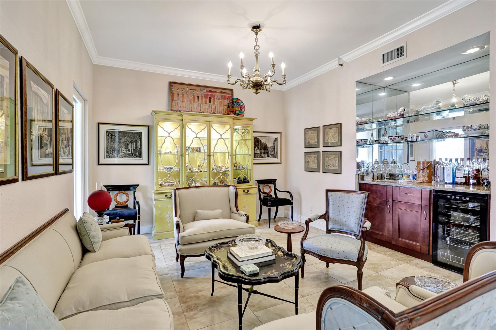 Perfect first-floor featuring a private, charming outdoor garden that offers the feel of a single-family home with the security of condo living. Enclosed glass patios expand the living space. The primary bedroom and office/third bedroom overlook the golf course, while the secondary bedroom includes a sitting area and direct access to the private garden. The spacious primary suite offers a large walk-in closet and an en-suite bath with dual sinks, a Roman tub, and a separate shower. Wet bar in the family room, an interior laundry room with full-size washer and dryer, abundant closet space, and a dedicated storage room. One covered parking space plus ample parking. Gated with a secured lobby, an additional private entrance from garden, and a clubhouse with heated pool just a short walk away.