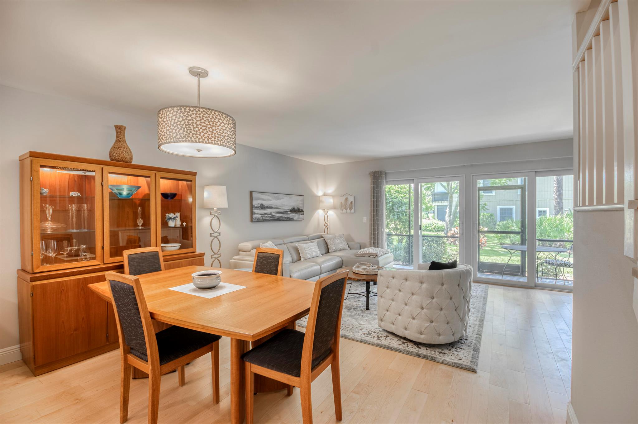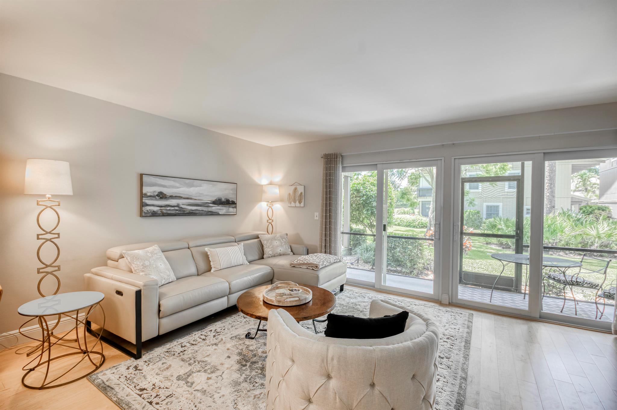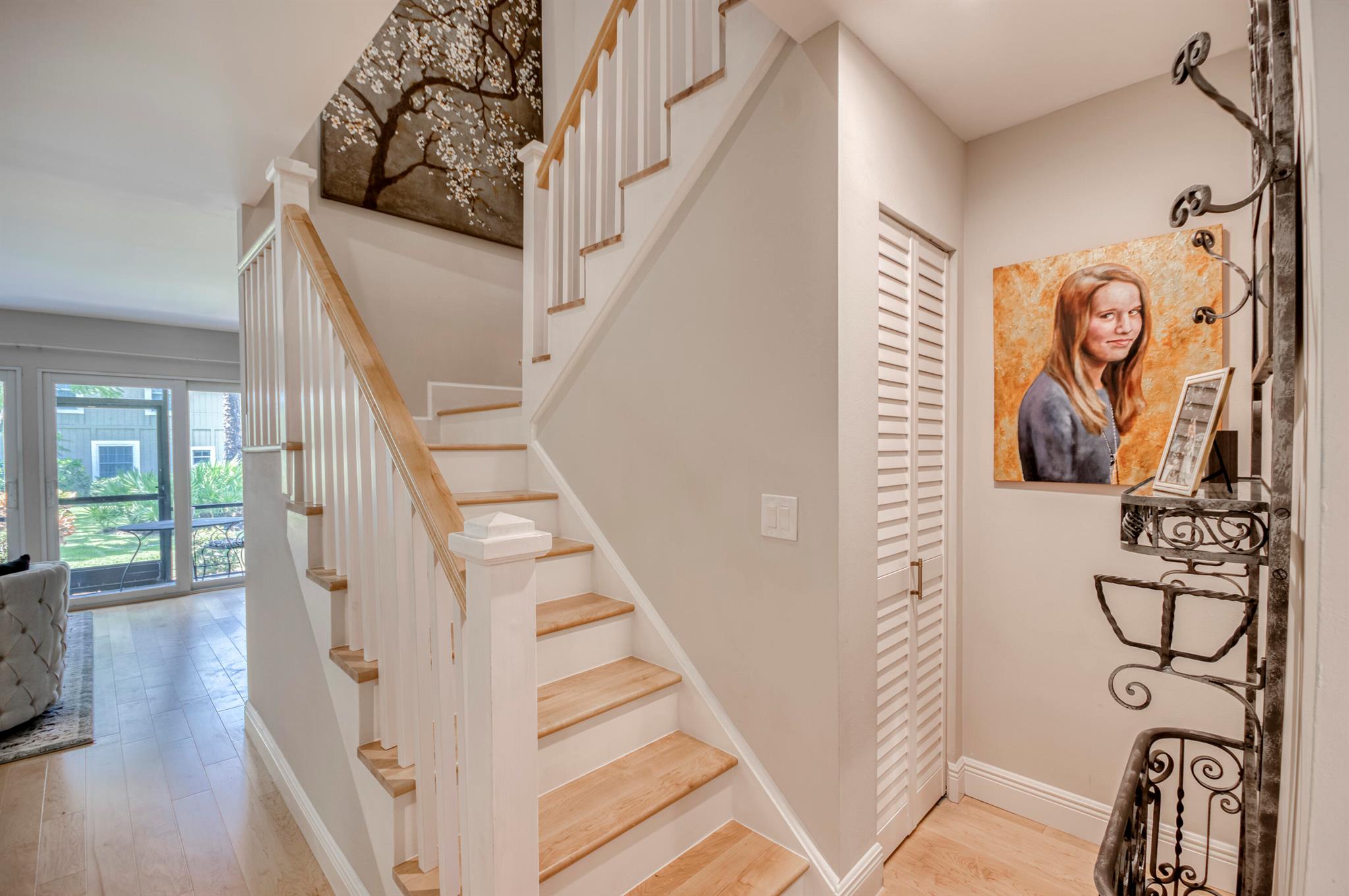 GORGEOUS IN RIVERBEND! Welcome to this terrific townhome with flowing plan designed for fabulous entertaining. Your stunning new kitchen features a beautiful quartzite waterfall peninsula complimented by white Shaker-style wood cabinetry. The spacious living/dining area looks out to lush golf and garden views through a wall of glass sliders while luxury Bellawood maple flooring flows throughout the main level and staircase. A screened lanai is the perfect spot to enjoy fresh breezes with serene garden and golf views. Upstairs offers two spacious bedrooms with renovated hall bath. The primary suite has double closets, en-suite bath, and a private balcony. 100% IMPACT GLASS. 2024 New Roof. Riverbend has Tennis, Pickleball, Golf, Pool and Kayak Club. All ages, gated, and friendly community!