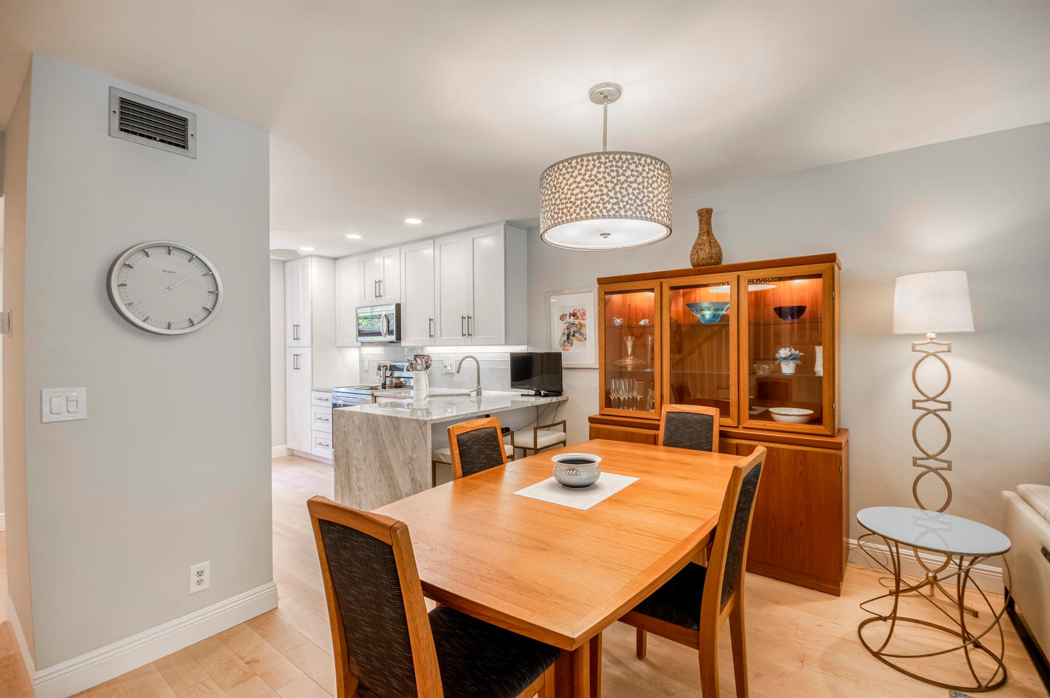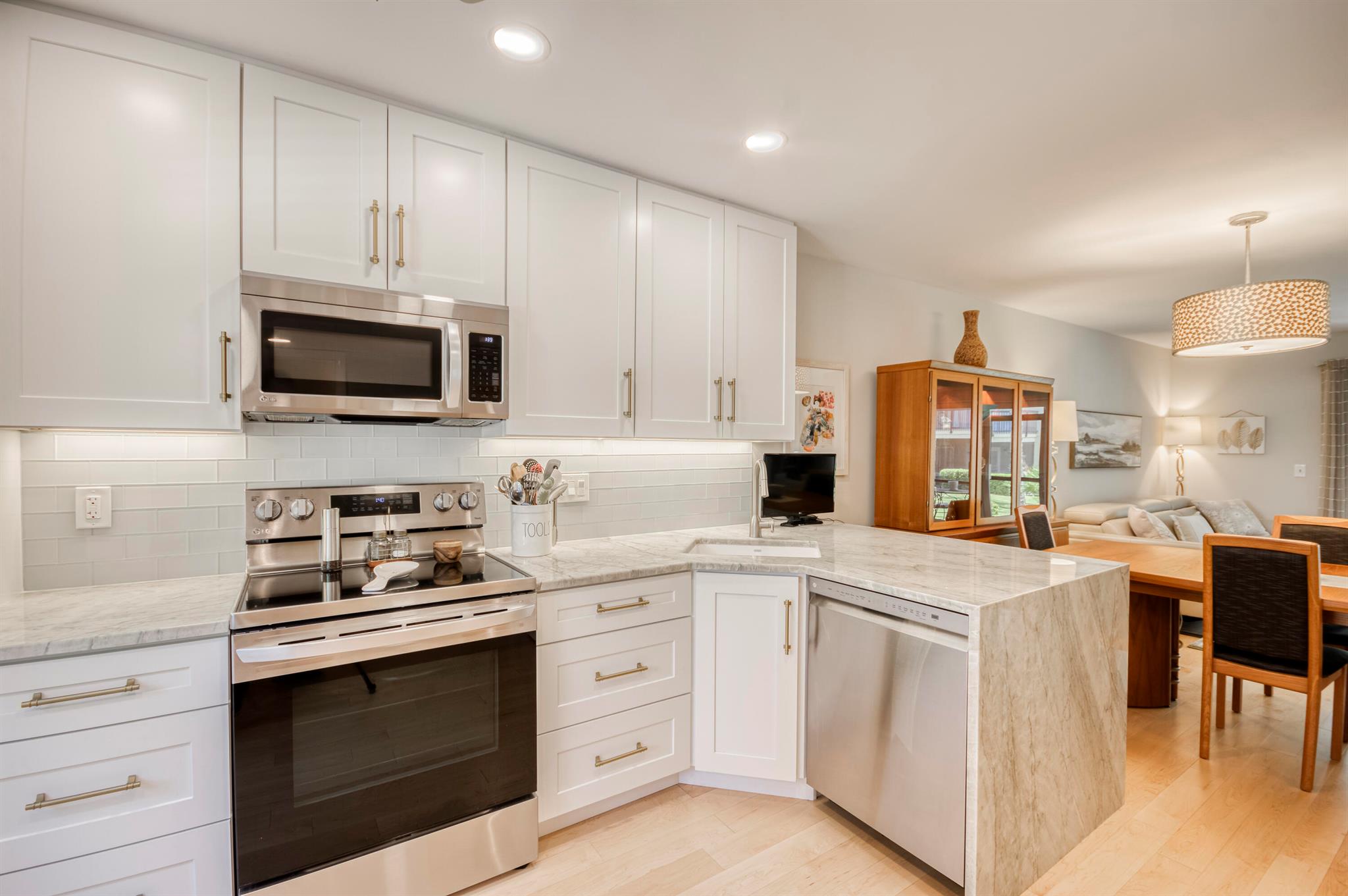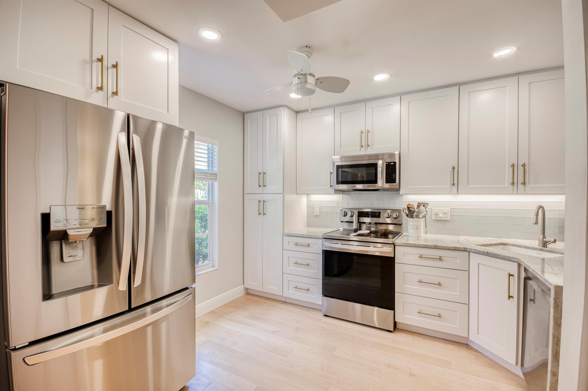 GORGEOUS IN RIVERBEND! Welcome to this terrific townhome with flowing plan designed for fabulous entertaining. Your stunning new kitchen features a beautiful quartzite waterfall peninsula complimented by white Shaker-style wood cabinetry. The spacious living/dining area looks out to lush golf and garden views through a wall of glass sliders while luxury Bellawood maple flooring flows throughout the main level and staircase. A screened lanai is the perfect spot to enjoy fresh breezes with serene garden and golf views. Upstairs offers two spacious bedrooms with renovated hall bath. The primary suite has double closets, en-suite bath, and a private balcony. 100% IMPACT GLASS. 2024 New Roof. Riverbend has Tennis, Pickleball, Golf, Pool and Kayak Club. All ages, gated, and friendly community!