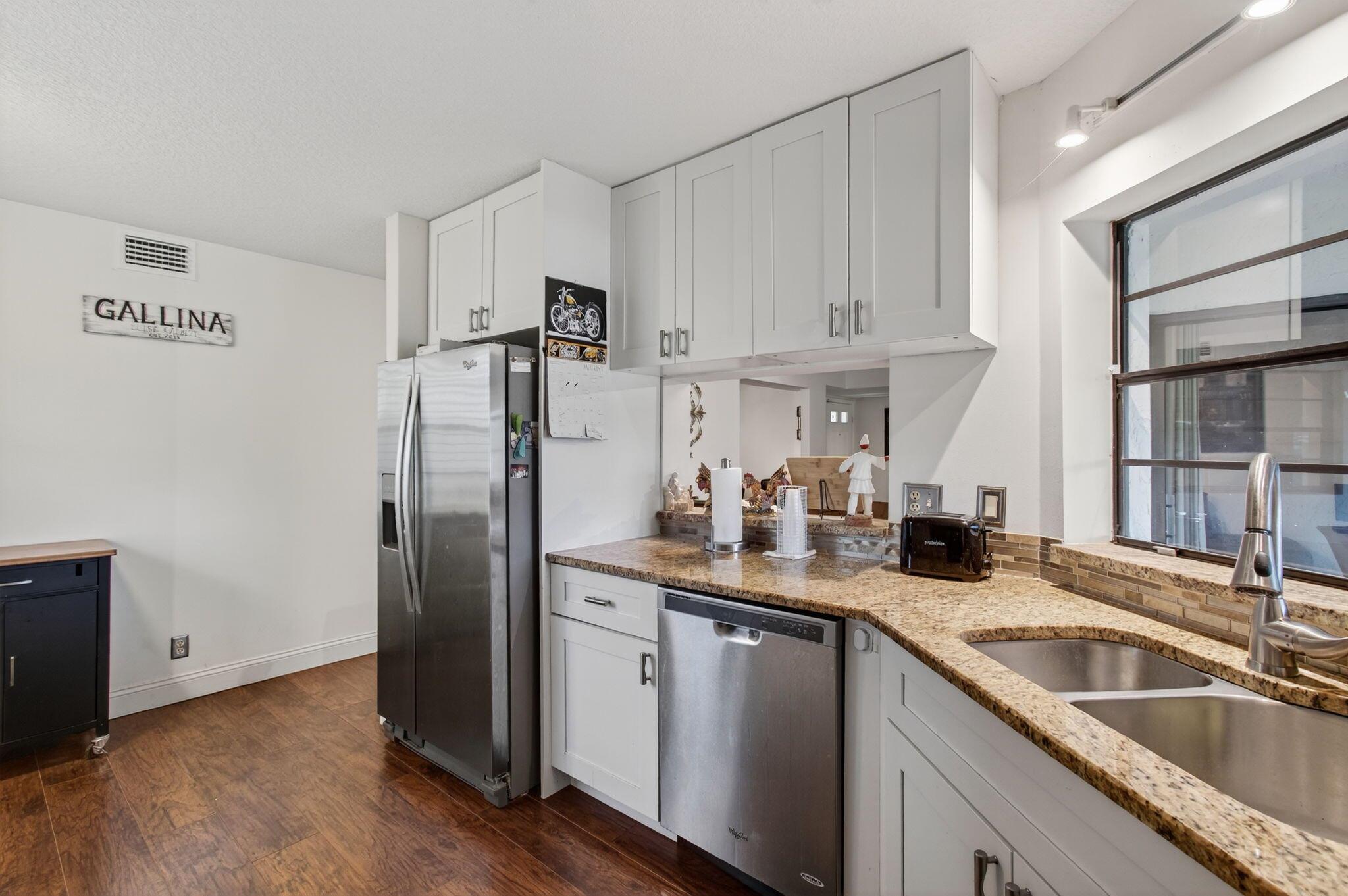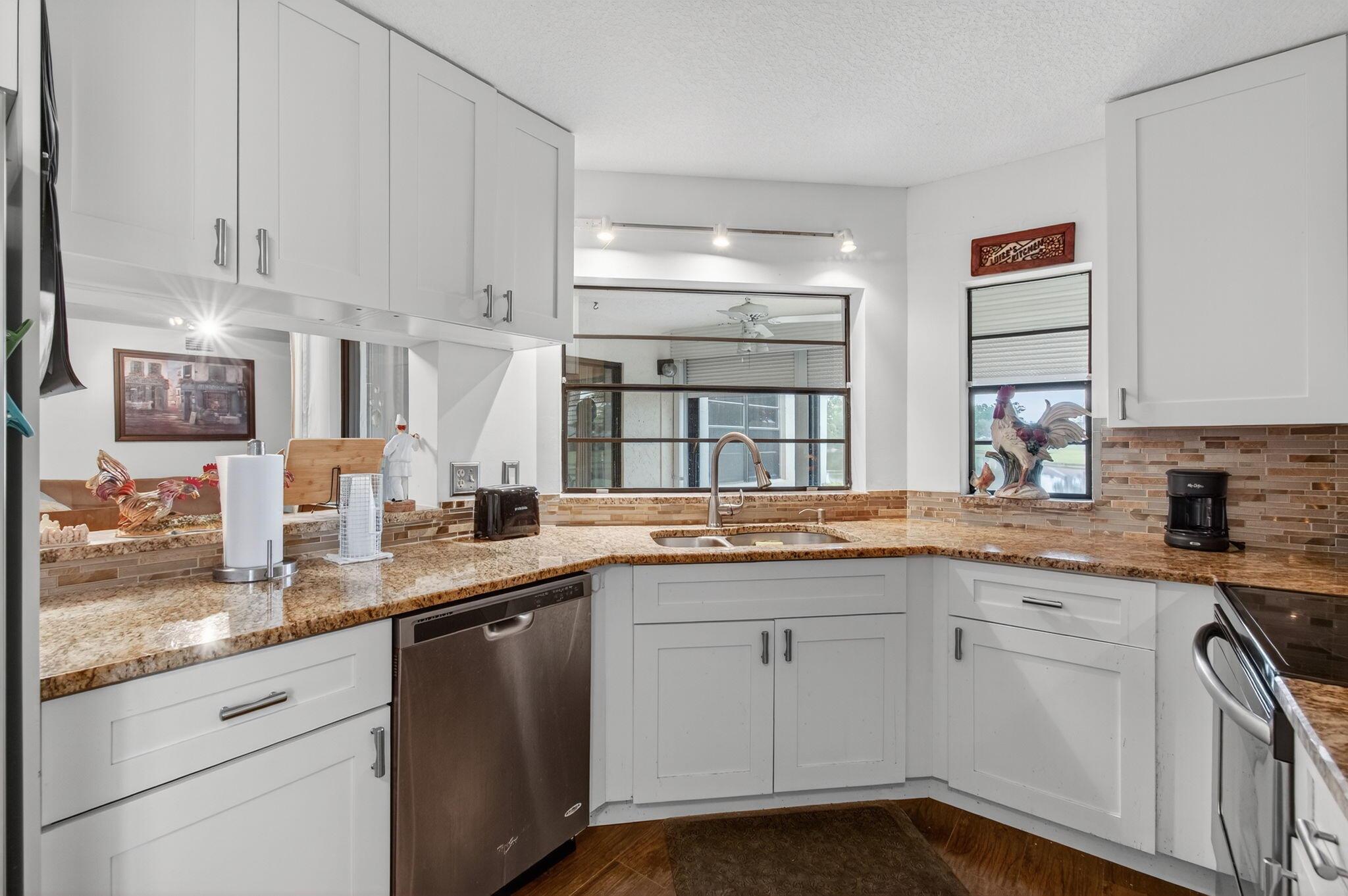 Rarely available 1st floor corner unit with serene lake views. This immaculately maintained corner unit feature 2 Bedroom and Den which can be converted into a 3rd Bedroom. This is the largest floor plan available in The Coves. A must-see updated kitchen with custom cabinetry, granite countertops, stainless appliances, and beautifully remodeled bathrooms. HERE ARE NO MEMBERSHIP FEES IN ABERDEEN EAST. The clubhouse amenities are all included in your HOA. Aberdeen East is a beautifully landscaped community that features an active adult lifestyle in a great location convenient to shopping, restaurants, golf courses and beaches. Enjoy this resort style living with an active clubhouse, live entertainment in the ballroom, resort pool area, 3 satellite pools, gym, card rooms, tennis courts,