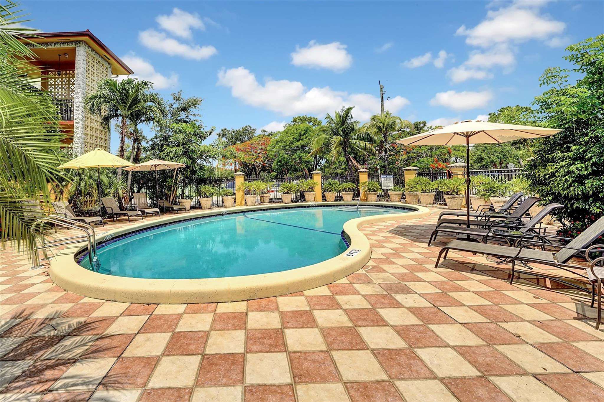 YOUR OWN PRIVATE PATIO. 2 bed/2 bath 1st Floor Corner Unit W private patio in Boutique Building Situated in Desirable Victoria Park! Walk right out your door to the pool. Meticulously maintained unit features newer tile floors throughout, BRAND NEW 2024 fixtures, crown molding, built-in closet systems and updated kitchen with granite counters & SS appliances. Beautiful French doors lead out from living area to private spacious patio, great for entertaining and barbecuing! 2 ASSIGNED PARKING SPACES AND Washer/Dryer IN UNIT. appliances new within last 2 years. Gated PET friendly building with private tropical pool area across the street from Holiday Park. Restaurants! Can Rent right Away- NO RENTAL RESTRICTIONS!!!