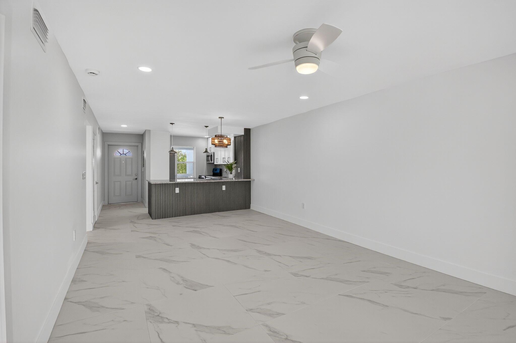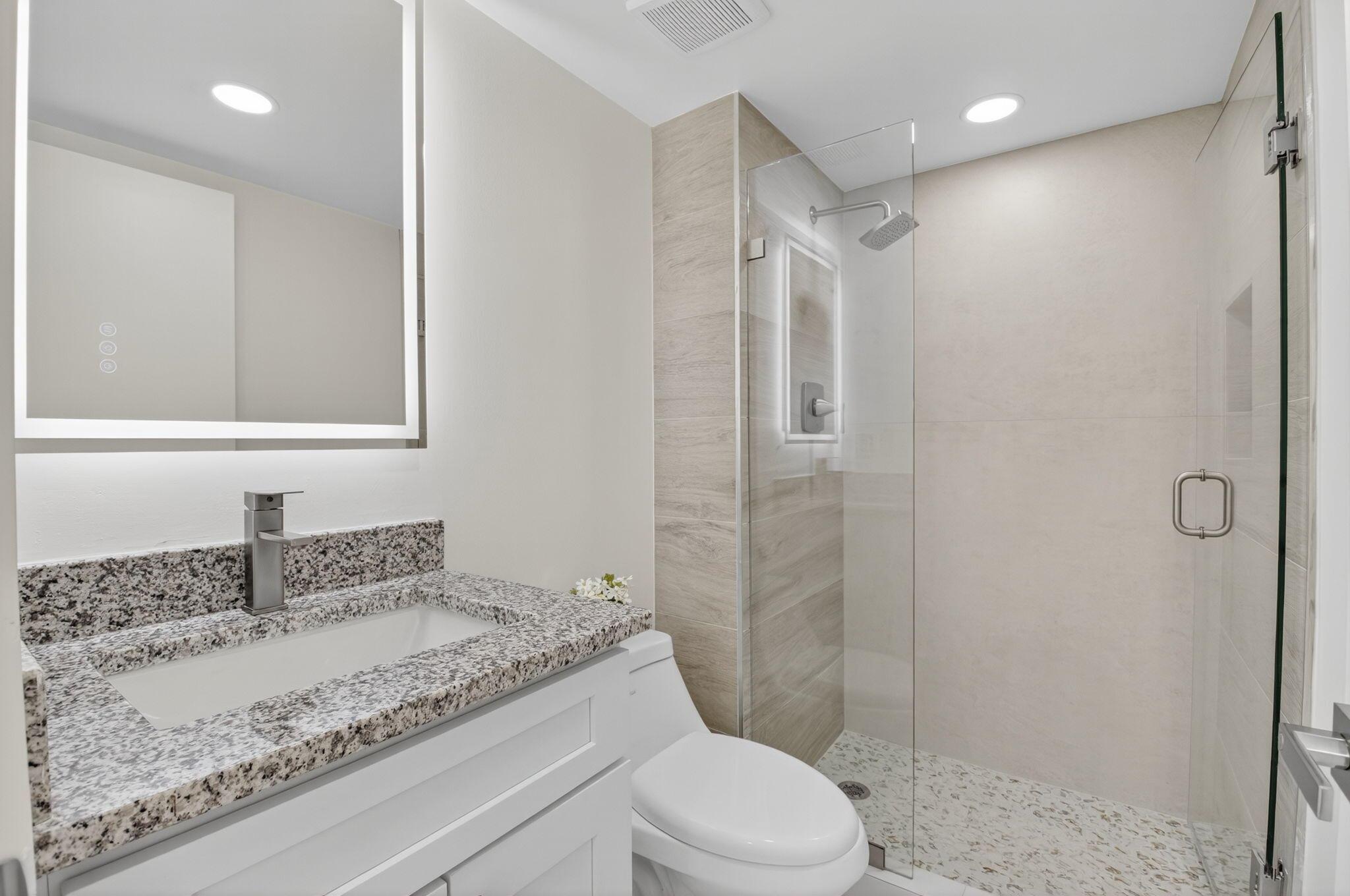 Seller offers OWNER FINANCING for this Magnificently updated 2 bedroom, 2 bath unit in well maintained 55 + community overlooking the garden beyond. Pristine condition, gourmet kitchen with granite counters and stainless steel appliances. Kitchen is open to the spacious great room with dining and living room areas. Screened patio where you can relax and enjoy the garden beyond. Primary bedroom features a lavish bathroom with shower and outfitted walk in closet. Spacious guest room with shower. Totally REMODELED, TOP TO BOTTOM, New AC, New Electrical Panel and high hats in every room. Porcelain tile throughout. No popcorn. Steps away from the state of the art saltwater pool. Close to major roadways, shopping and 20 minutes to the beaches. This exceptional unit is waiting for you!
