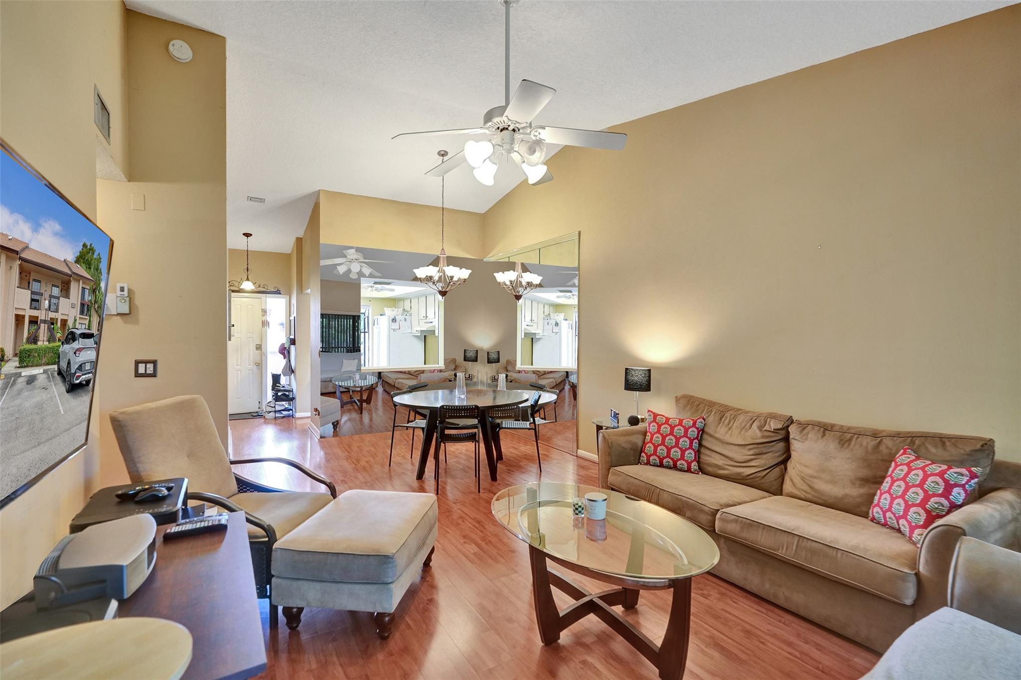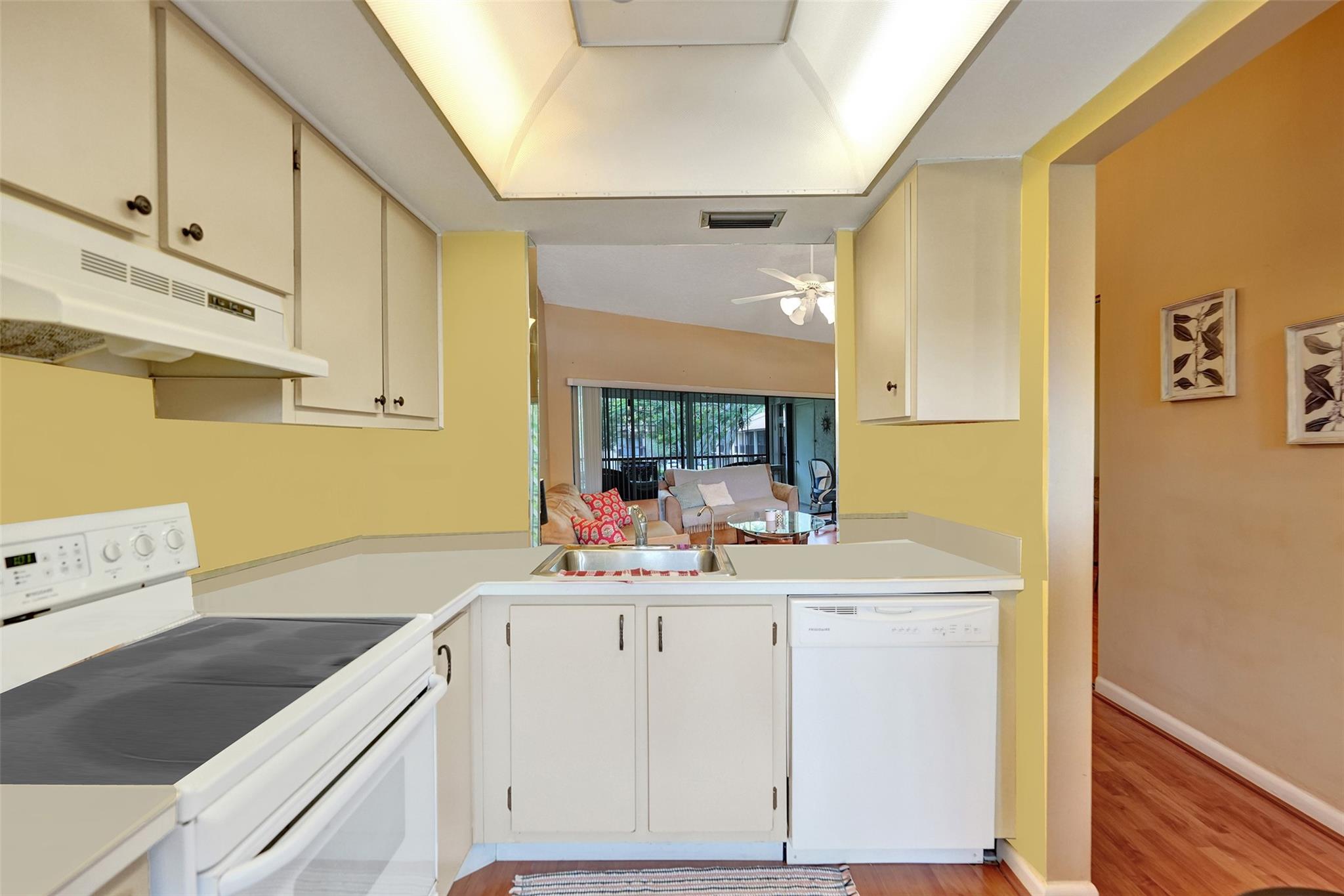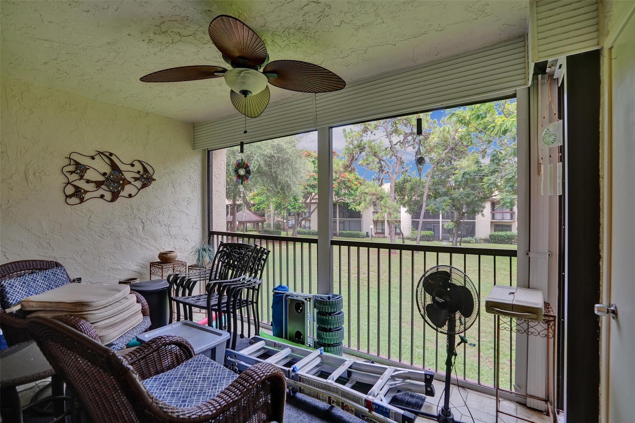 2 Bed & 2 Bath corner unit on 2nd floor w/volume ceilings. Laminate floors in main areas & carpet in bedrooms. Bright kitchen w/white appliances & atrium window. Large primary bedroom w/walk-in closet, separate vanity, & shower-only bath, plus screened balcony. Spacious 2nd bedroom. Large screened patio overlooking garden views. New washer, dryer & water heater. A/C replaced 2010. One pet allowed (under 25 pounds) & service animals welcome. No rentals allowed during first year of ownership. Building has 2024 roof, no special assessments, recently passed 40-year inspection, & association has full reserves. Amenities include large pool, hot tub, covered BBQ & seating areas, paddle ball, shuffleboard, clubhouse w/full kitchen & fitness center. Guard-gated at night w/patrol. 3% convention loan